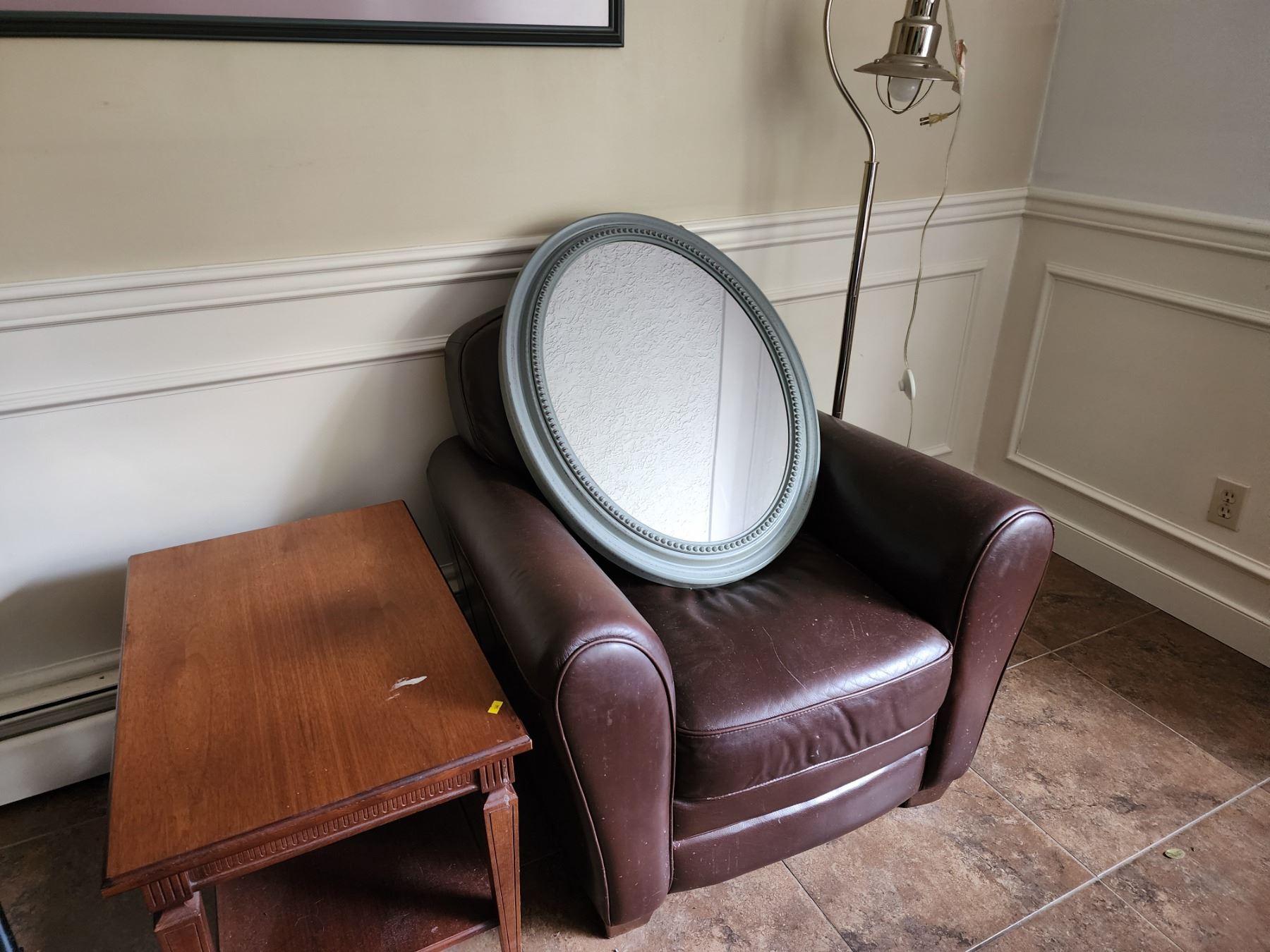 Brown Leather Armchair (34"W, 31"D, 32"T) Wooden Side Table, Decorative Mirror (31"L, 24"W) and Silver Finish Floor Lamp (60"T)