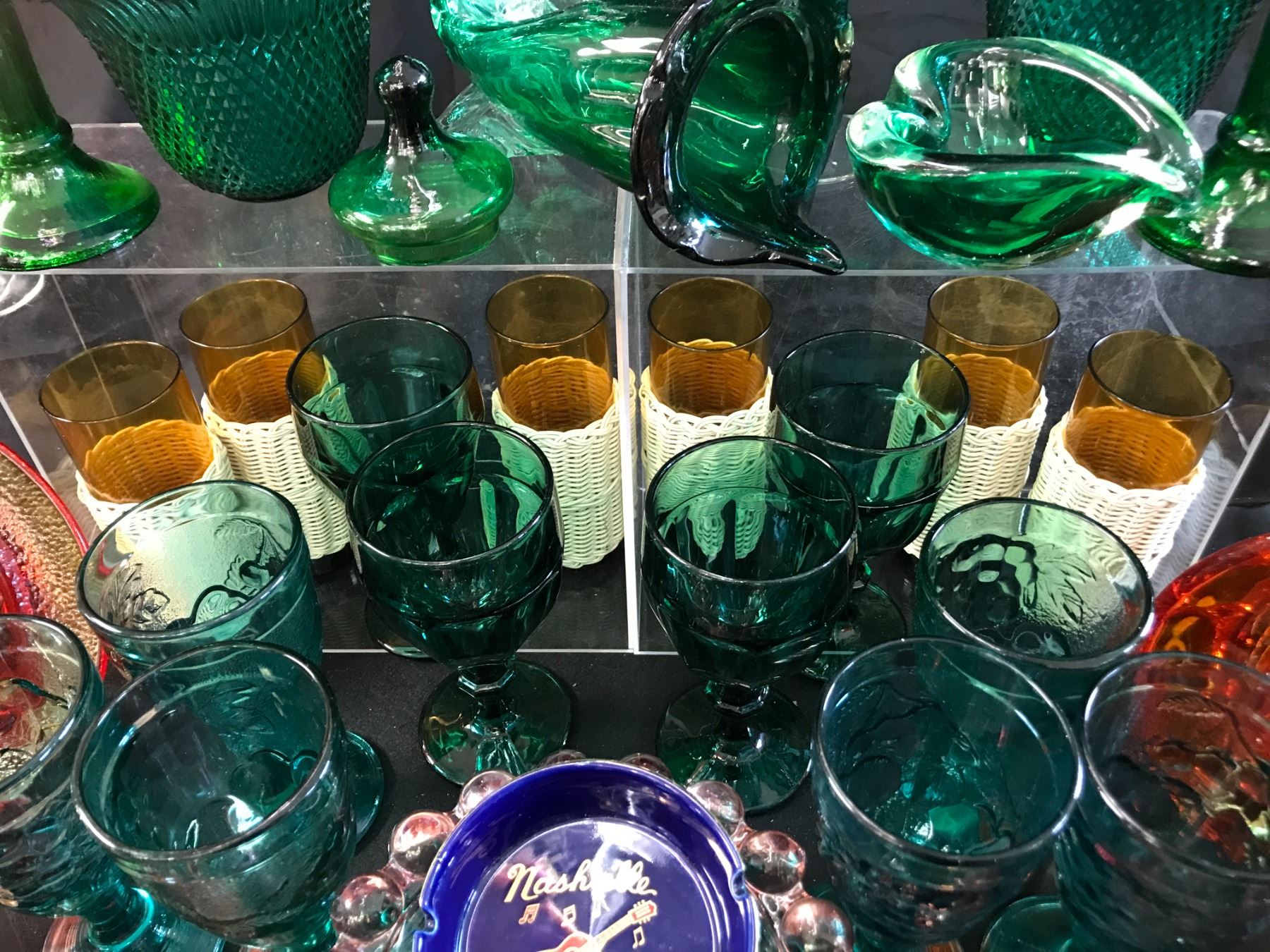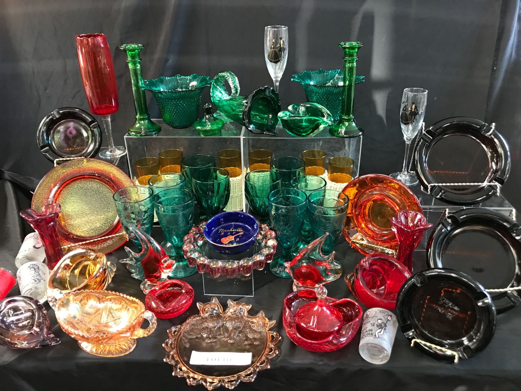 5 Vintage Ashtrays, Carnival Glass Gravy Bowl, Murano Glass, 3 Horn of Plenty Bowls, Mid Century Modern Glasses, 2 Glass Fish, Stemware, Goblets & Shooter Glasses