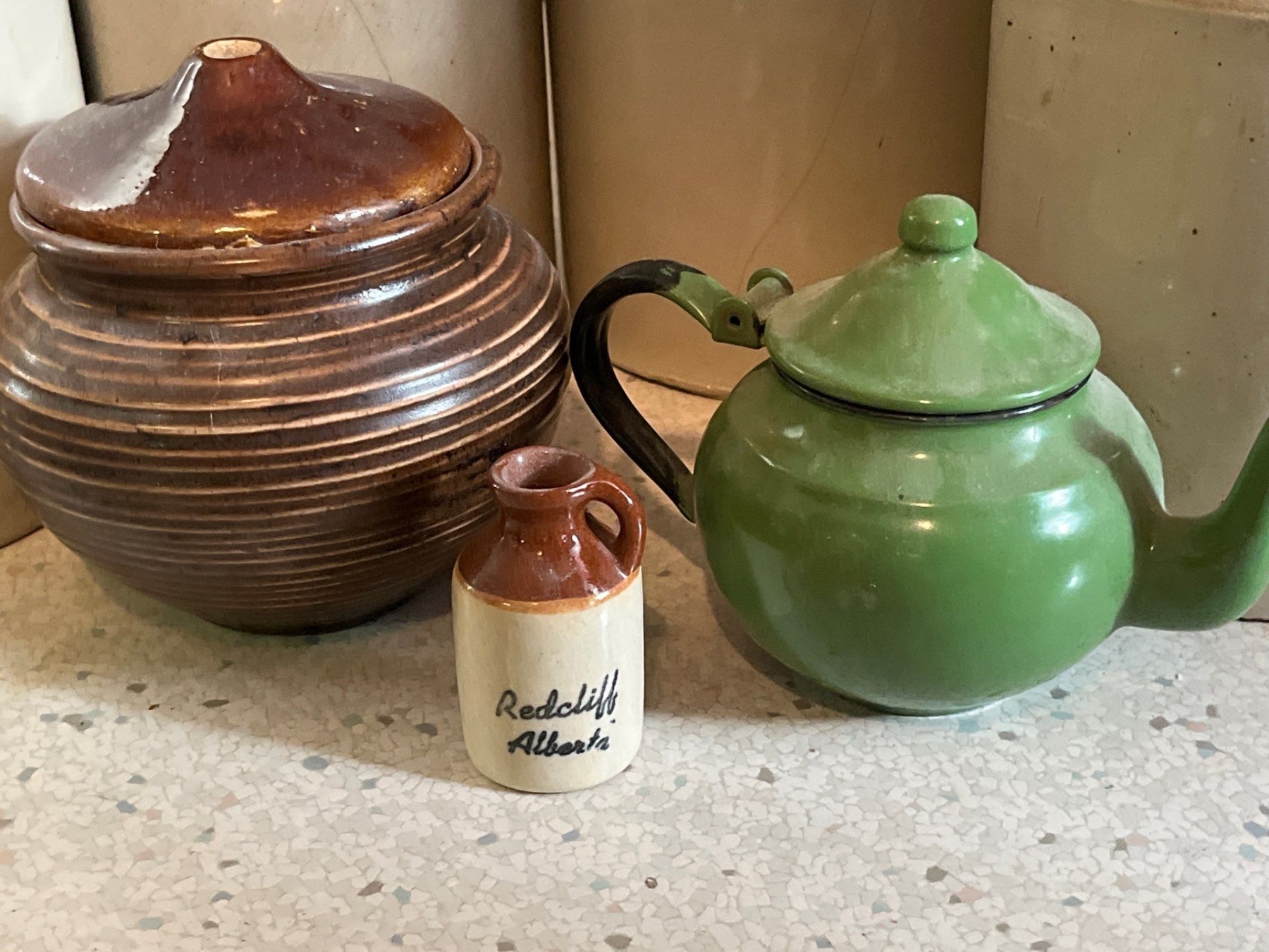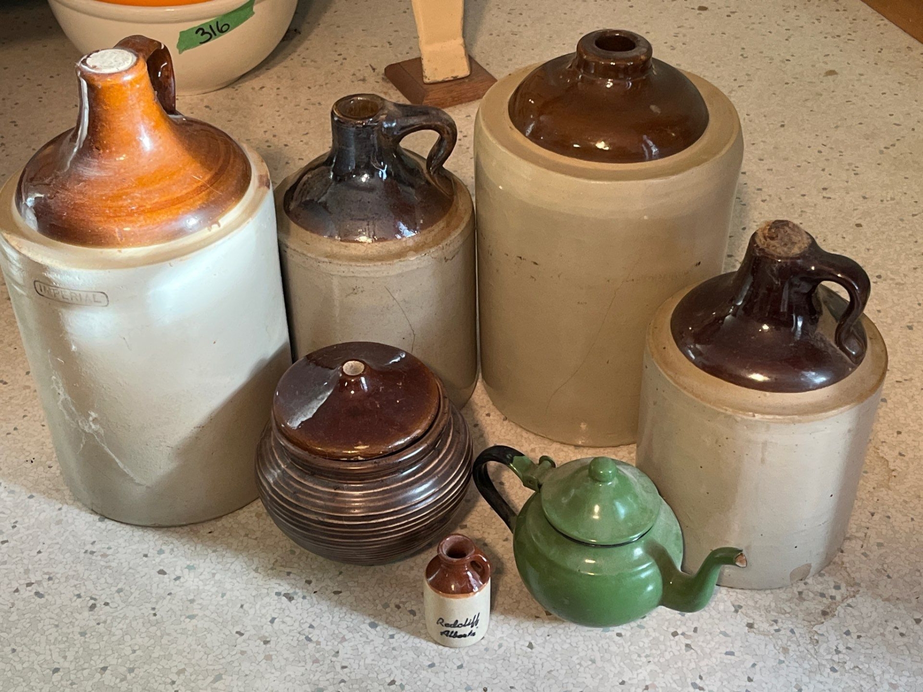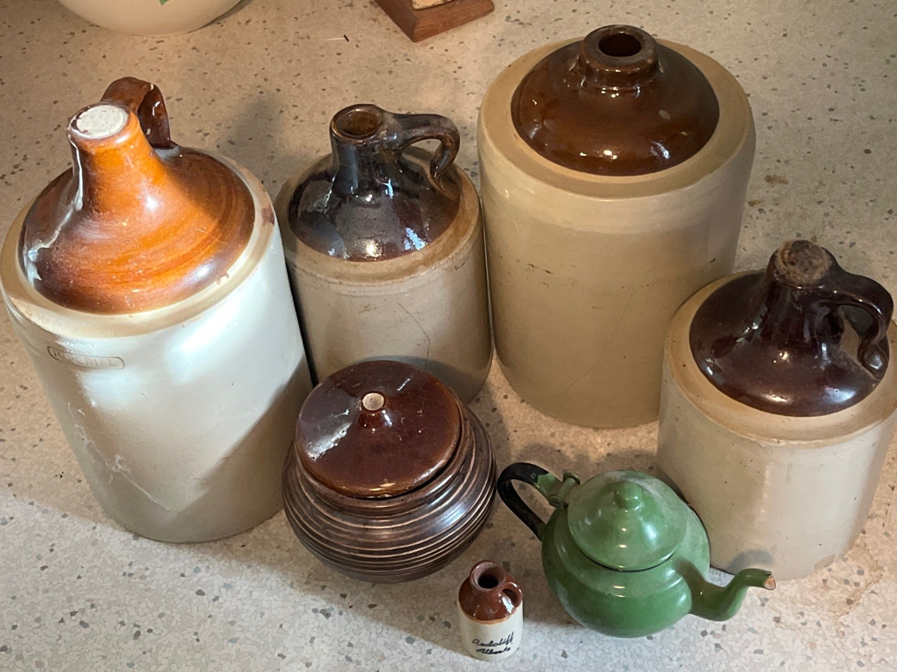 4 antique whiskey jugs with two small Medalta pieces of vintage pottery and a vintage green enamel teapot