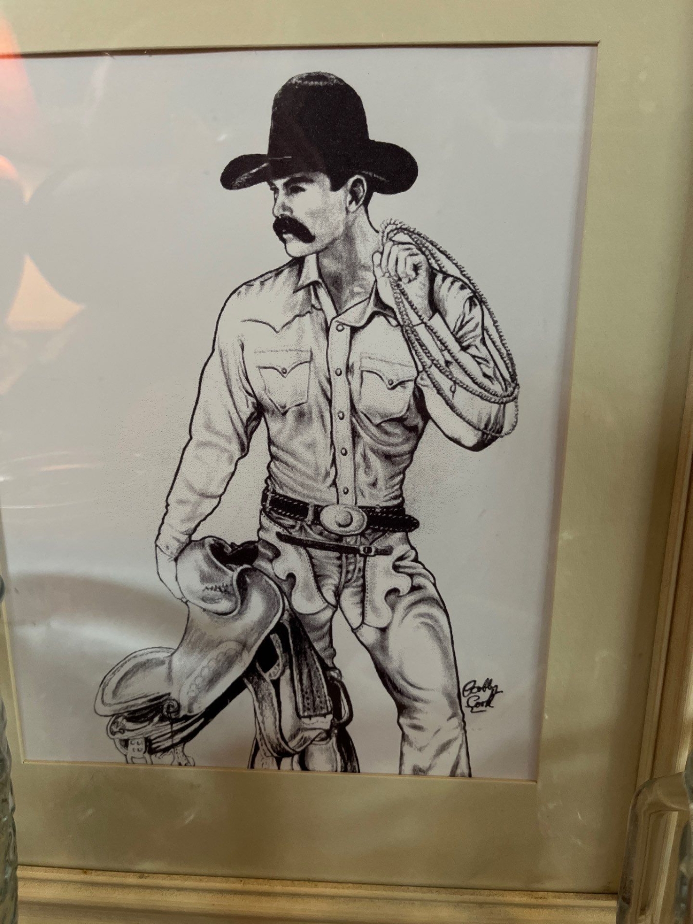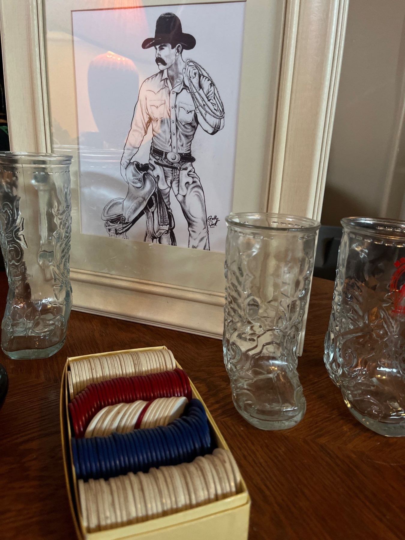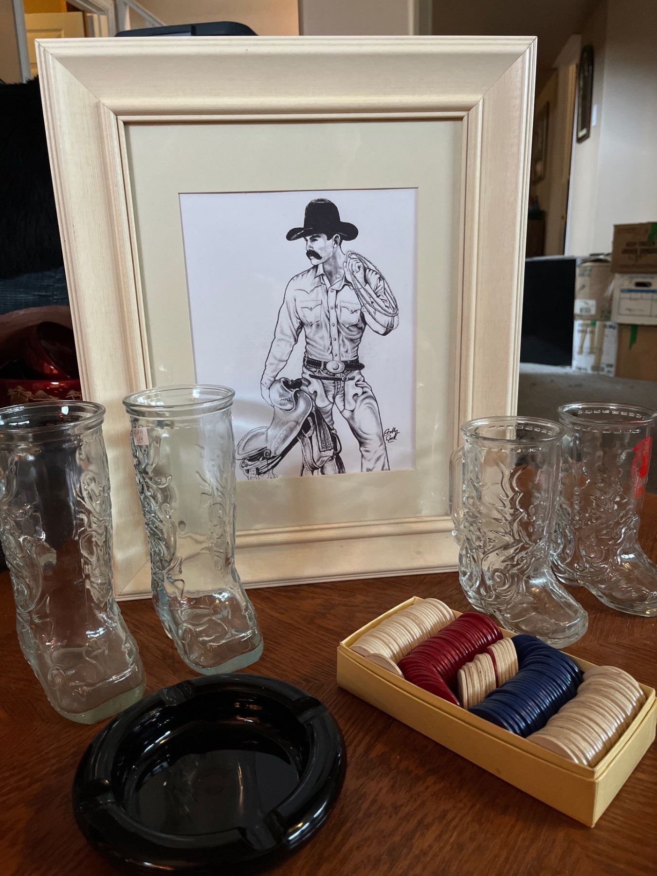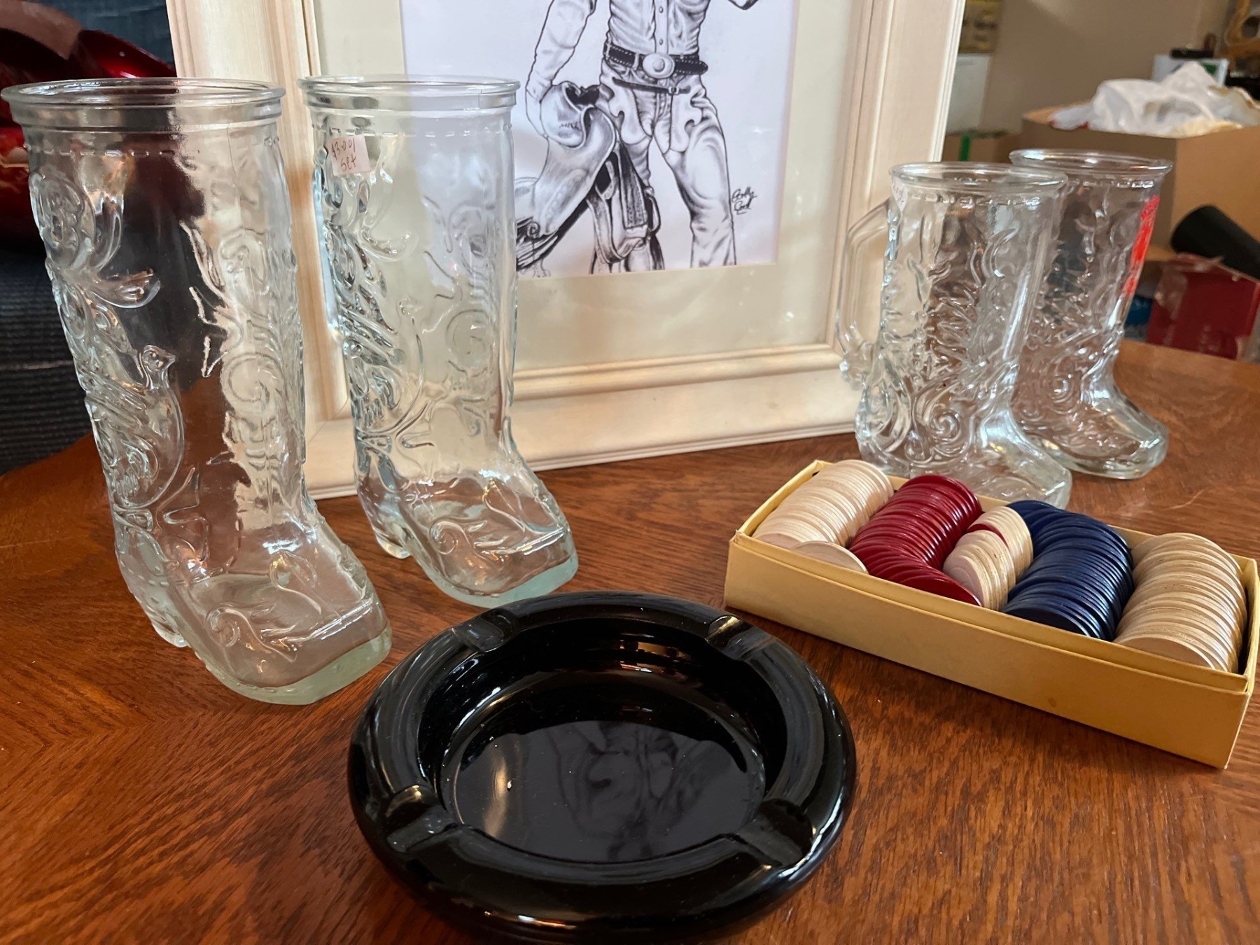 4 cowboy boot glass mugs, vintage ashtray, cowboy print, vintage poker chips, cowboy framed print