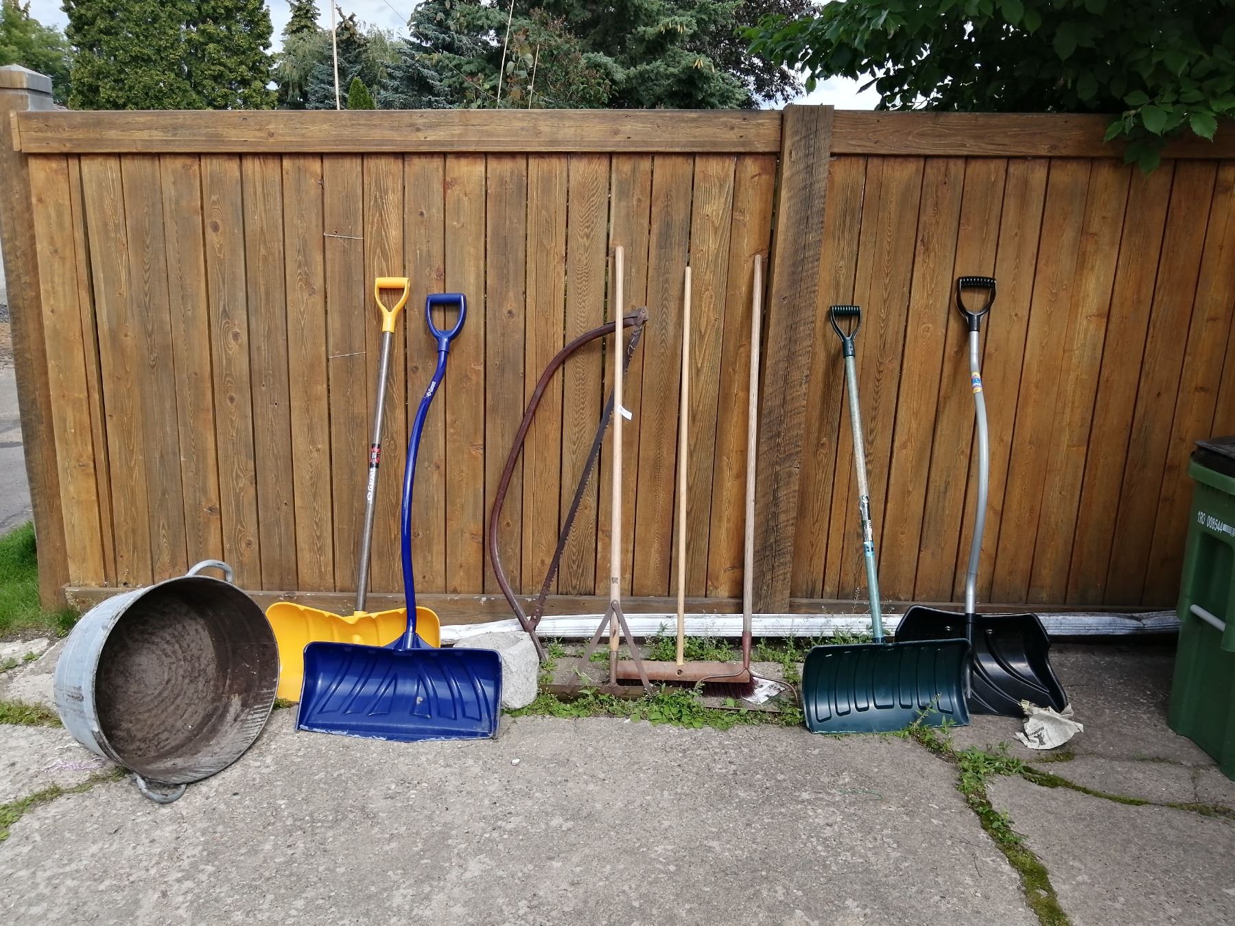 4 x Snow Shovels and 2 x Rakes, Metal Saw, Push Broom, and Metal Tub