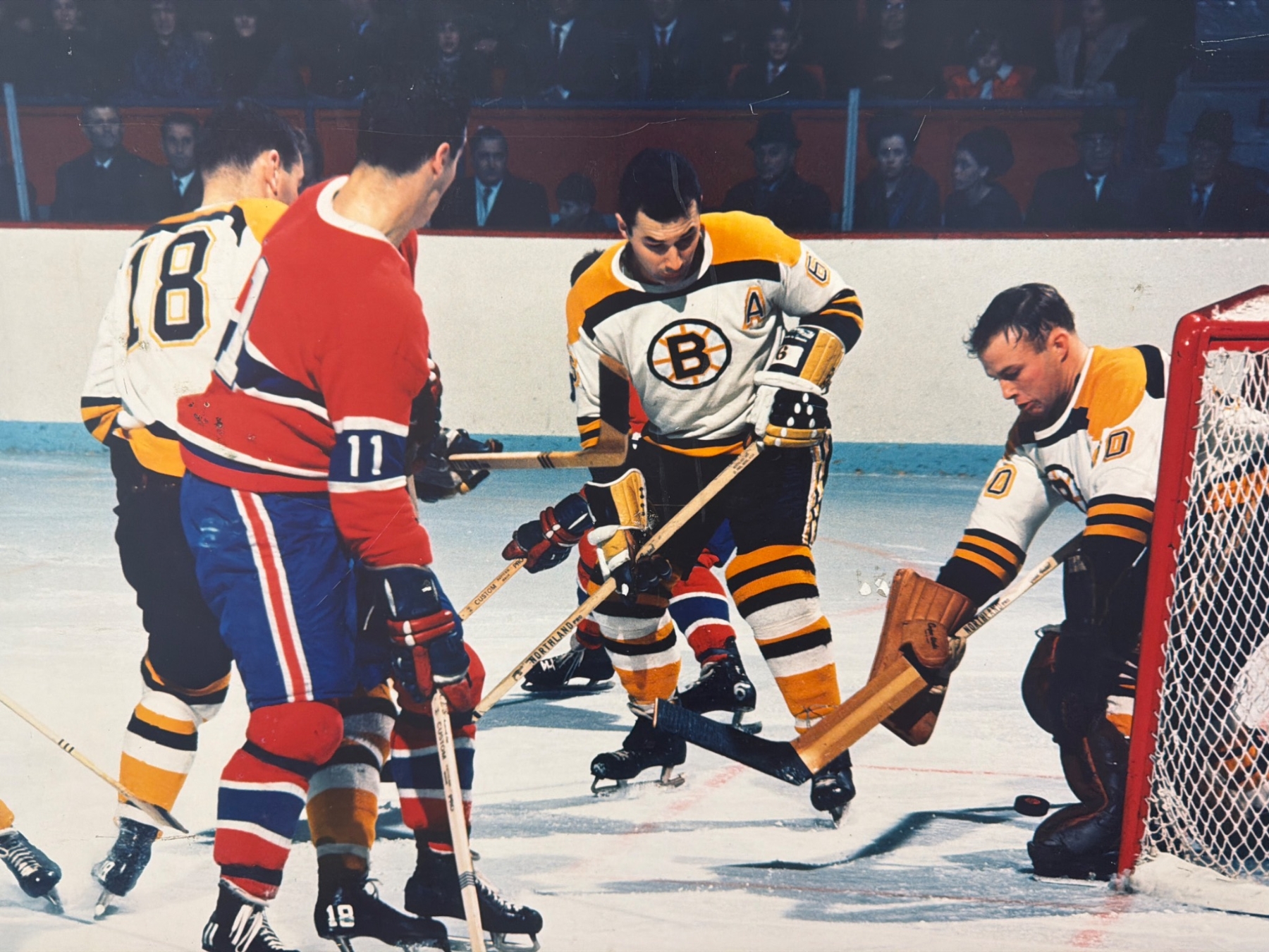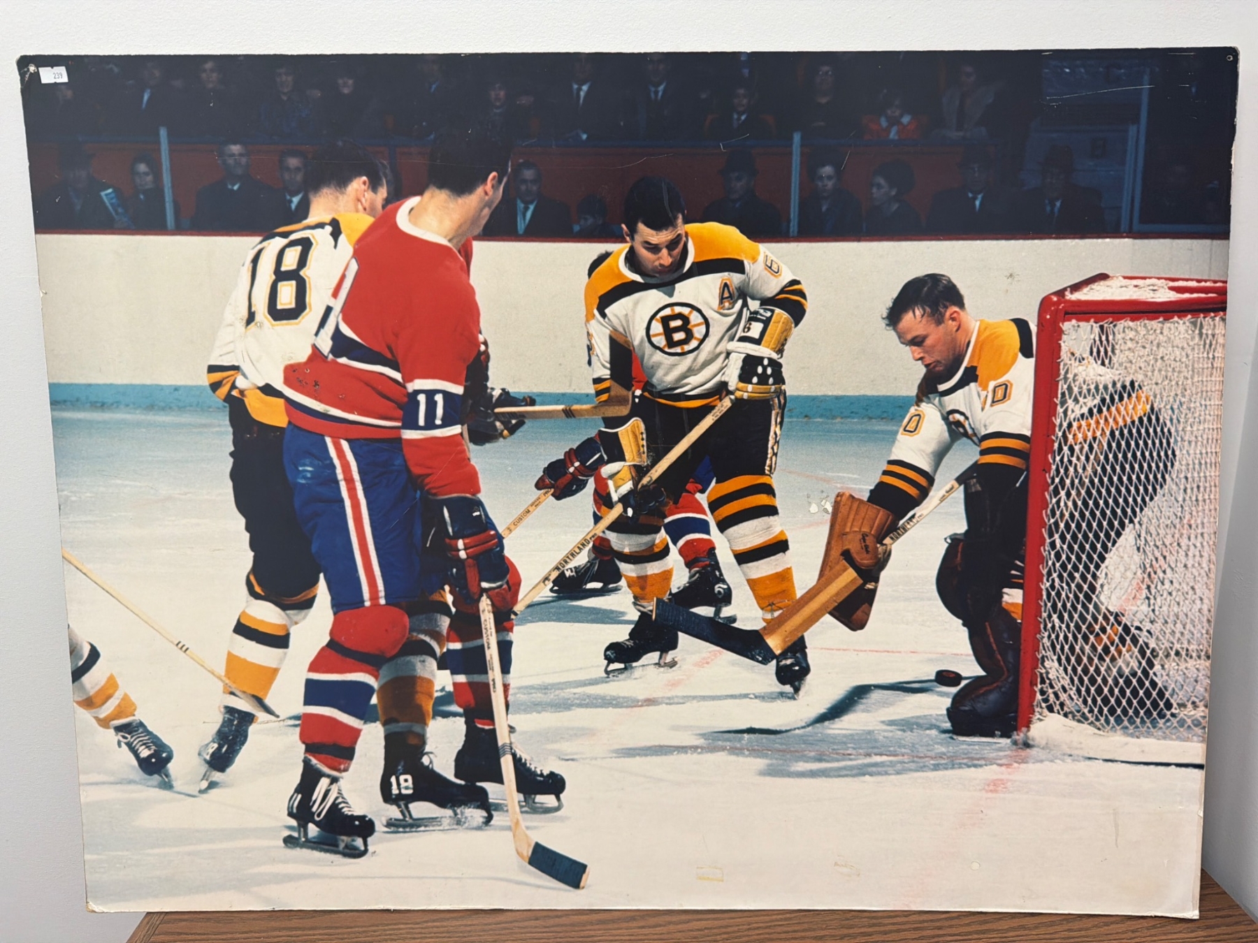 Large-format 40" x 30" photographic print capturing a historical moment between the Boston Bruins and Montreal Canadiens. Featuring vivid colors and dynamic action, this piece showcases the intensity of hockey's golden era. Ideal for sports memorabilia collectors or hockey enthusiasts, it serves as a testament to these iconic teams' rivalry.