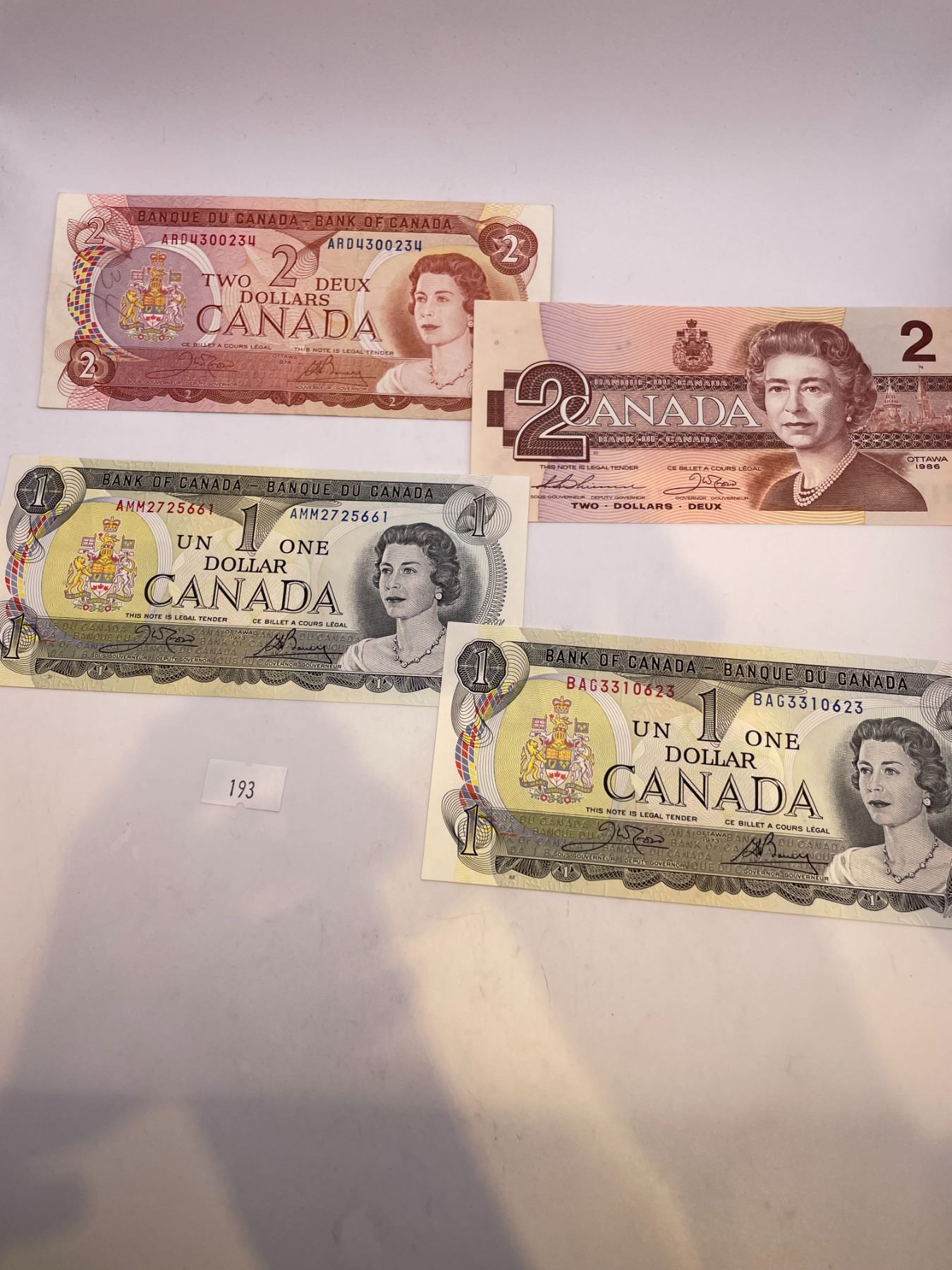 4x Canadian Banknotes (2x 1973 $1, 1x 1974 $2, 1x 1986 $2)