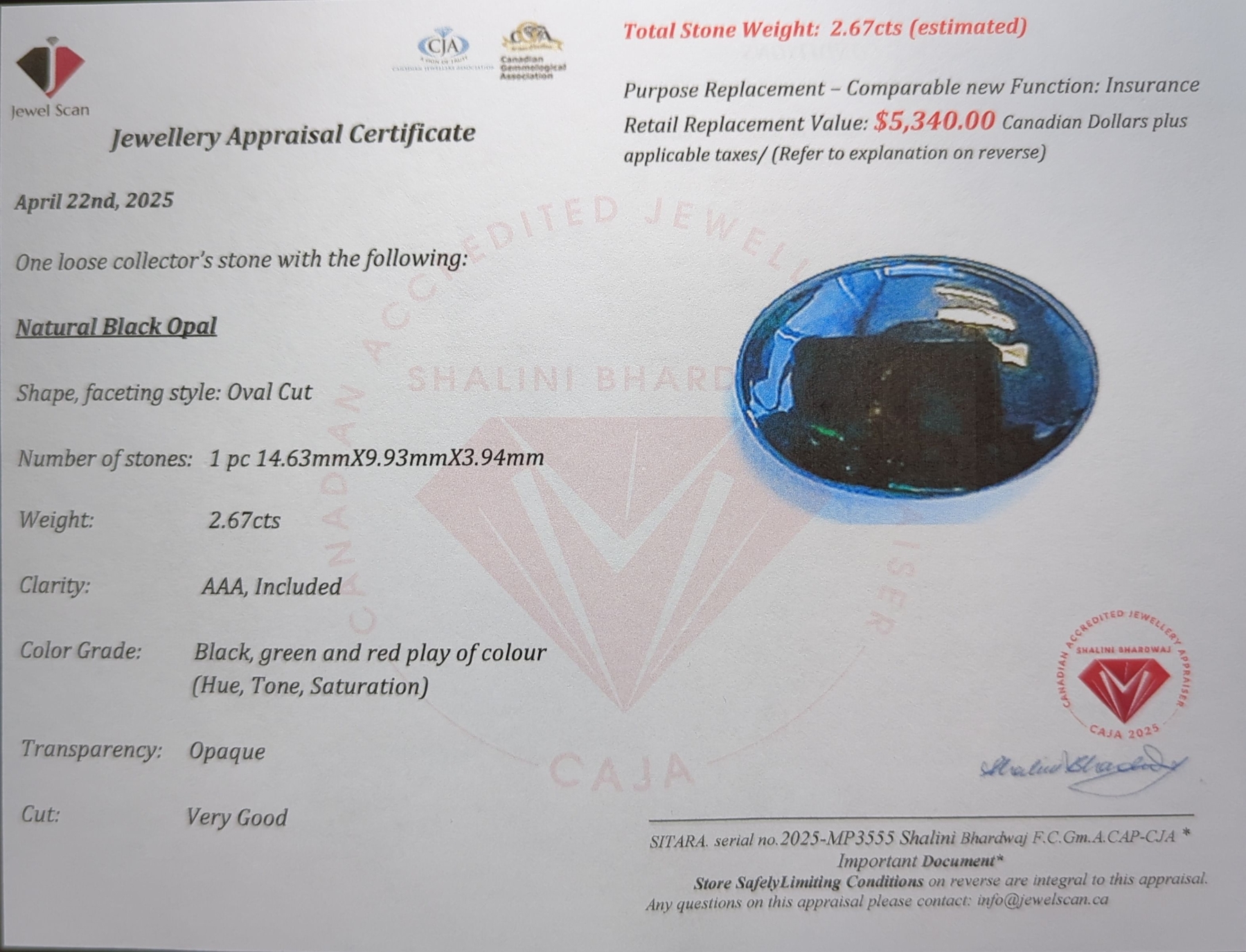 $5,340 Appraisal - 2.67 ct Cert. Black Opal Gemstone