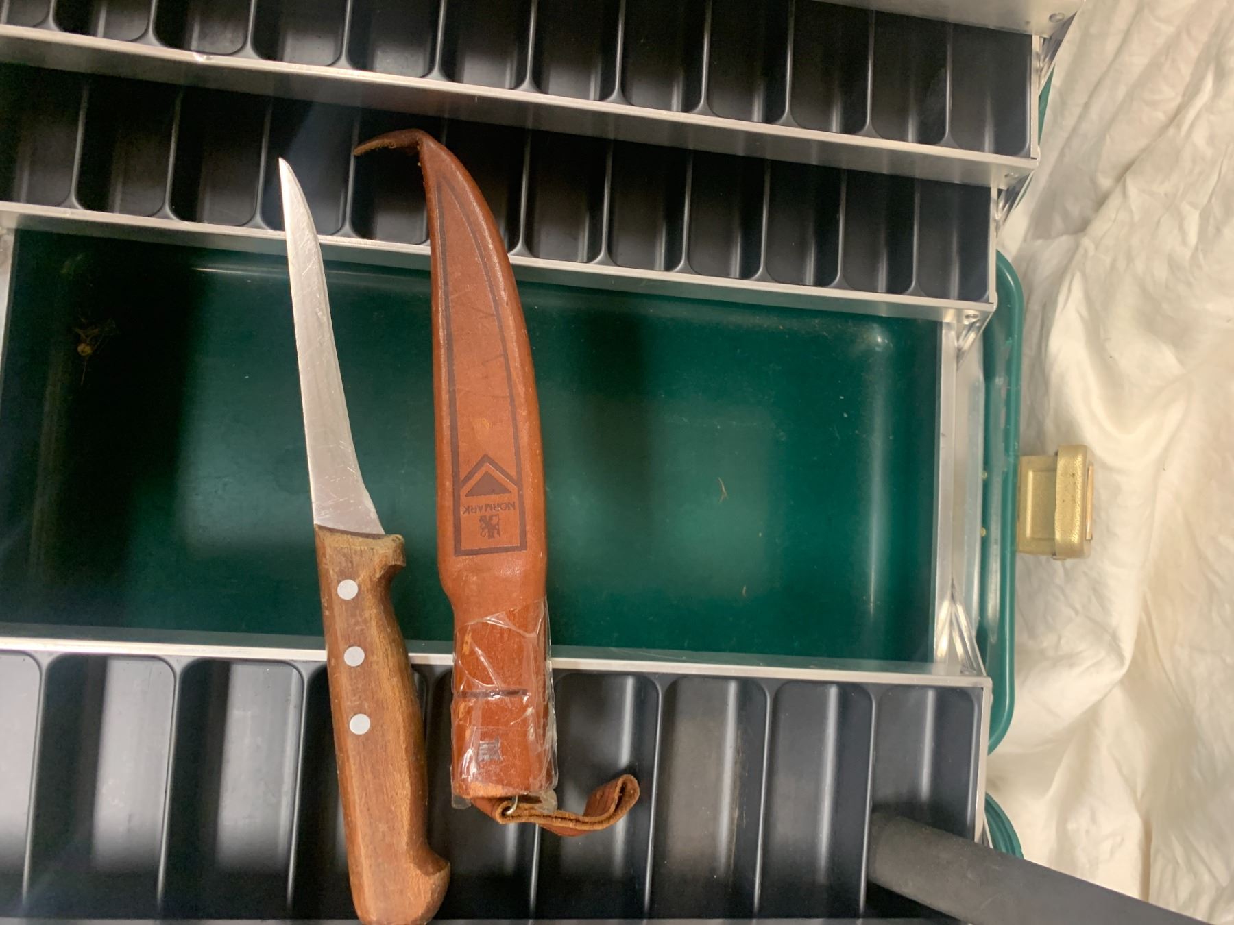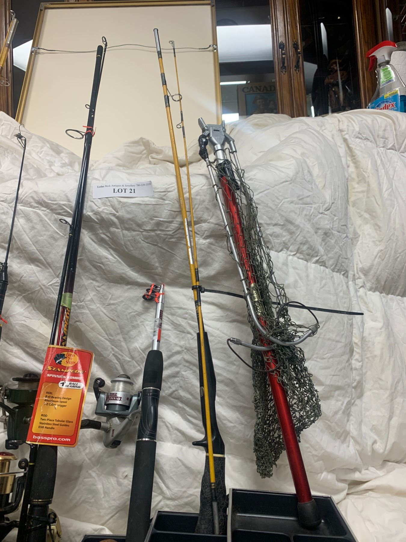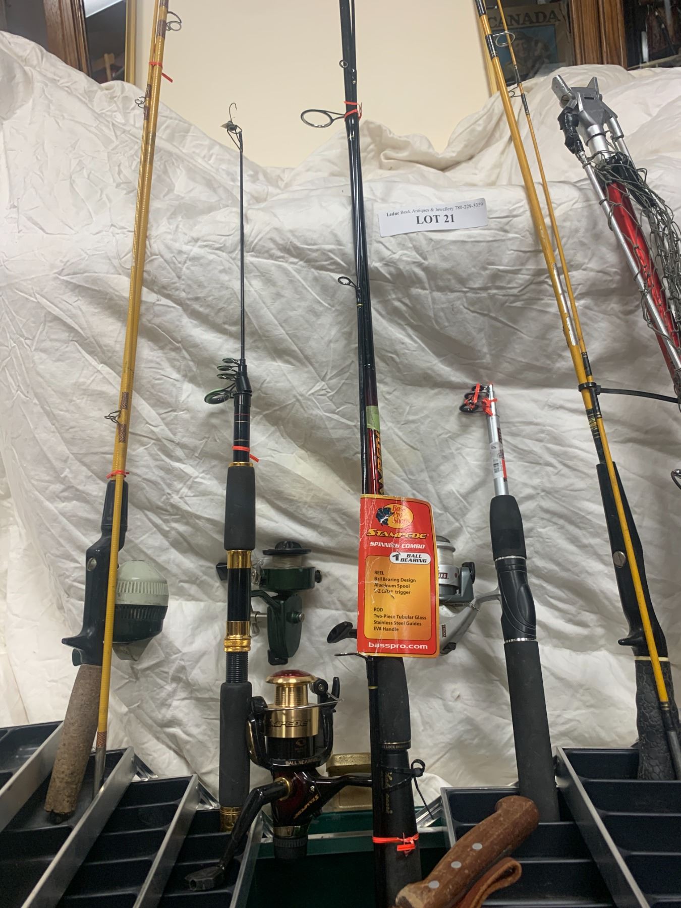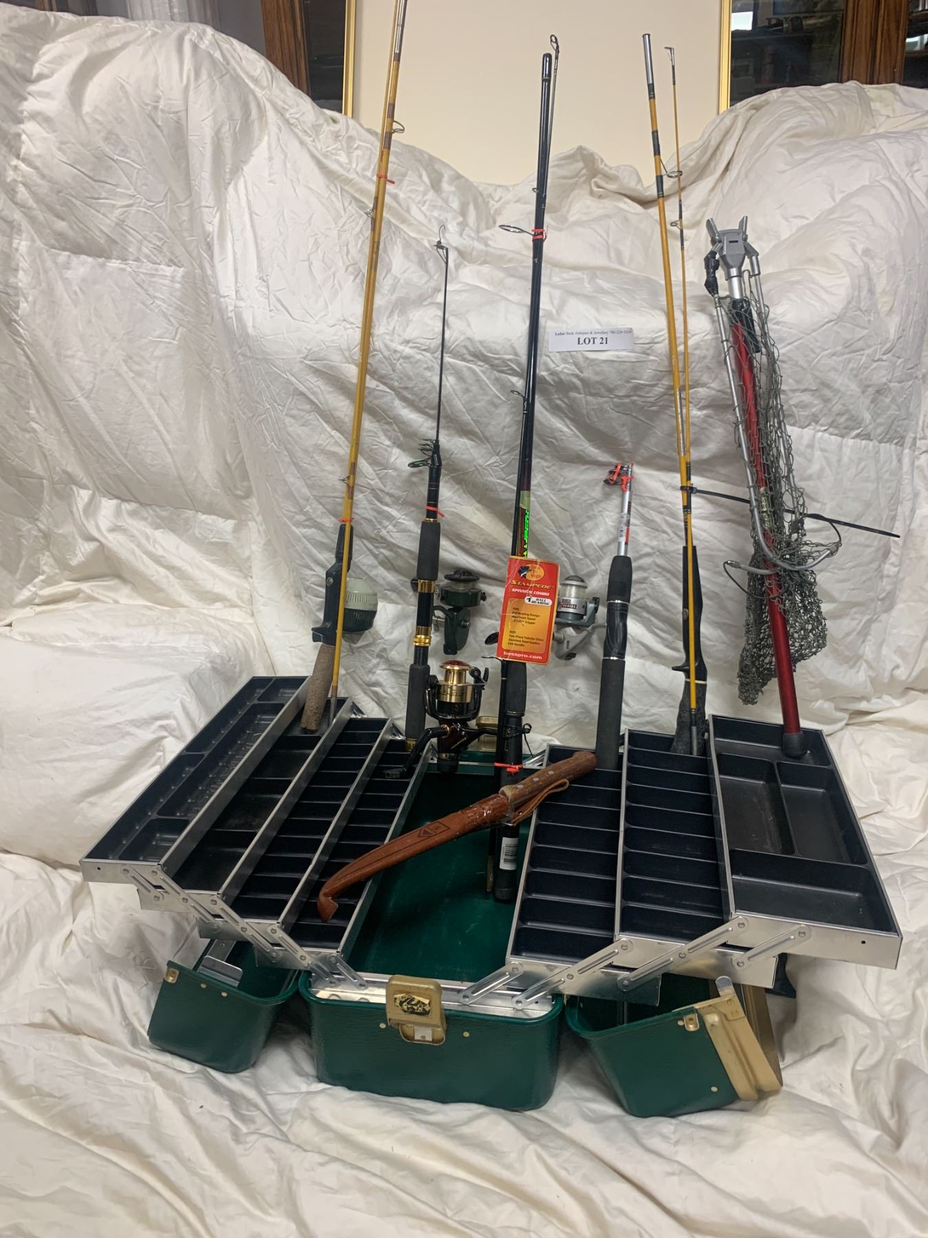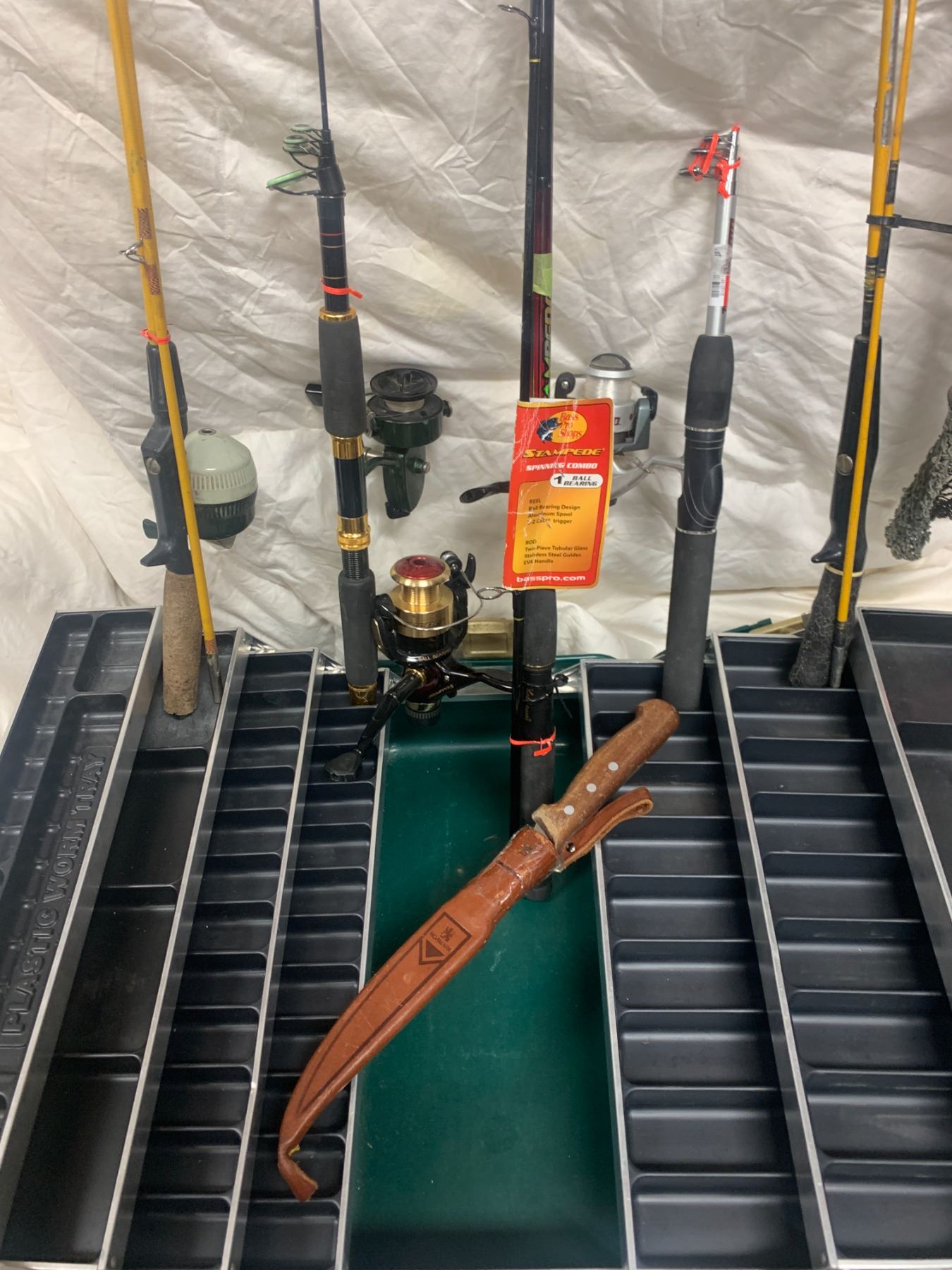5 Fishing Poles, Elaborate Heavy Duty Tackle Box & Vintage Normark Filet Knife, Collapsible Fishing Net