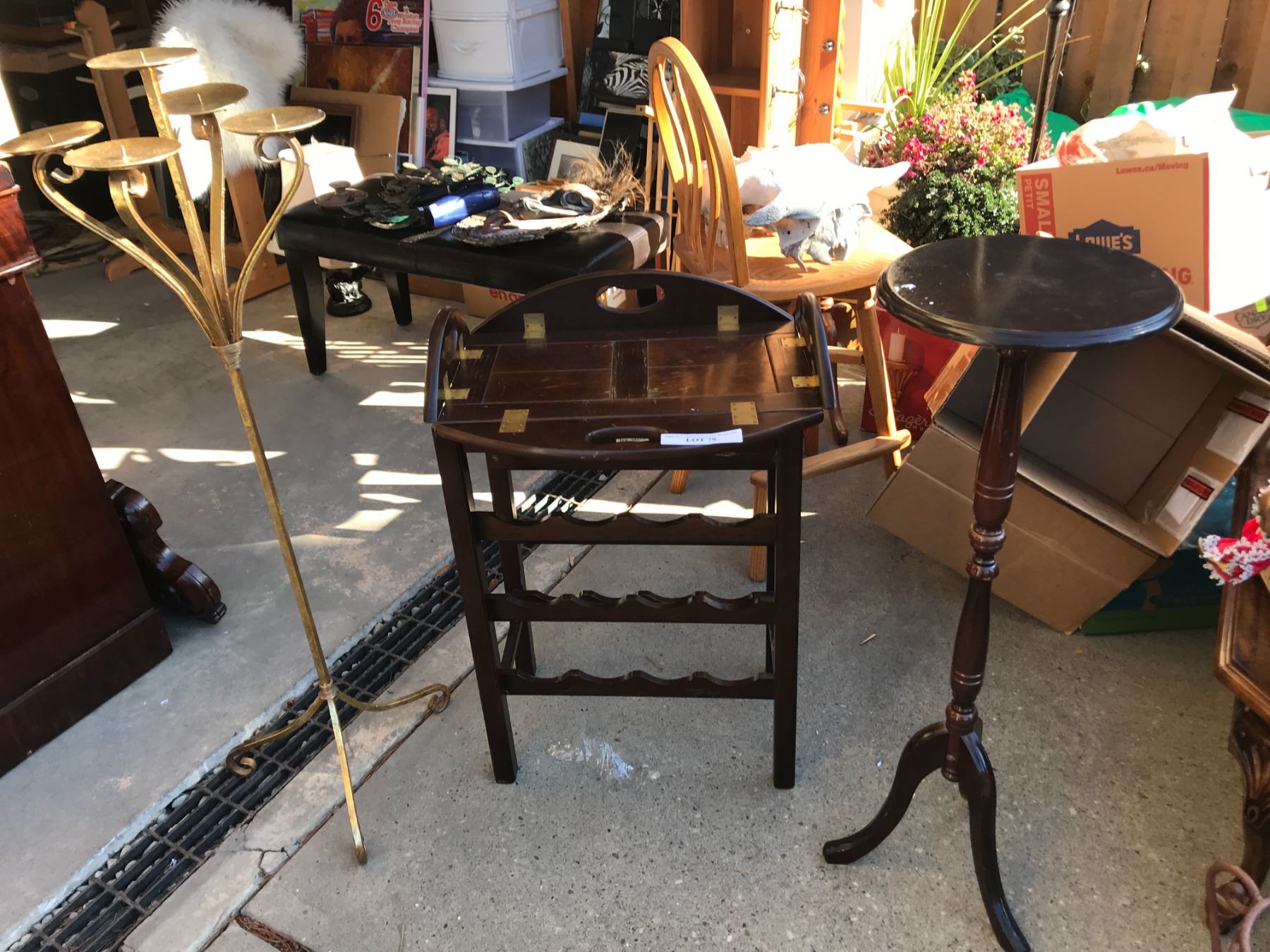 6-candle tall holder (brass coloured), wood plant stand, wooden wine rack (needs repair)