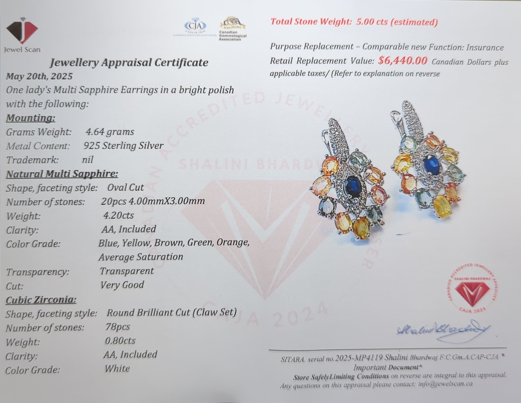 $6,440 Appr - 4.64 G Cert. Silver Sapphire Gemstone Earring