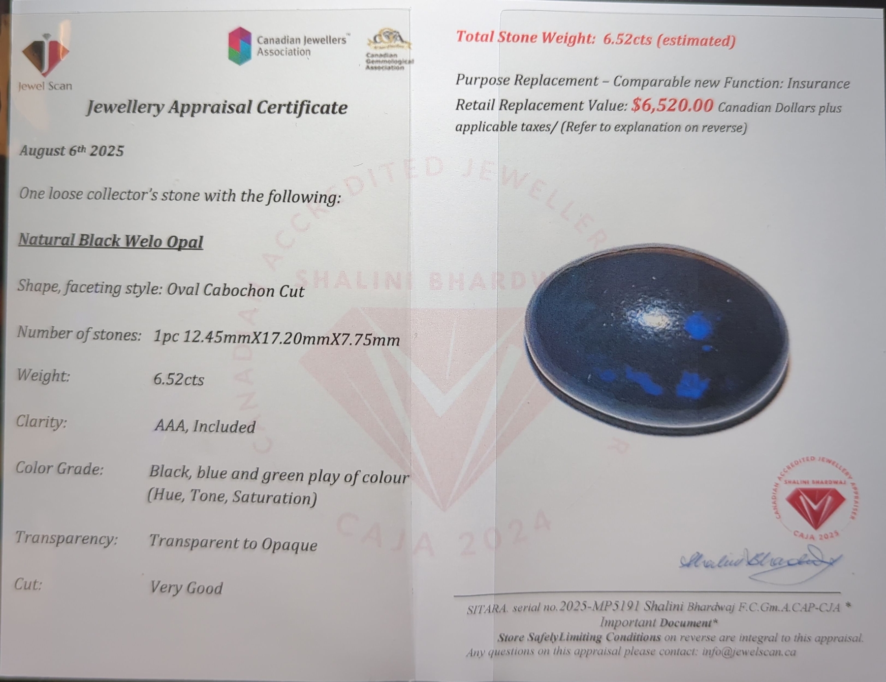 ($6,520 Appraisal) - 6.52 ct Certified Black Opal gemstone