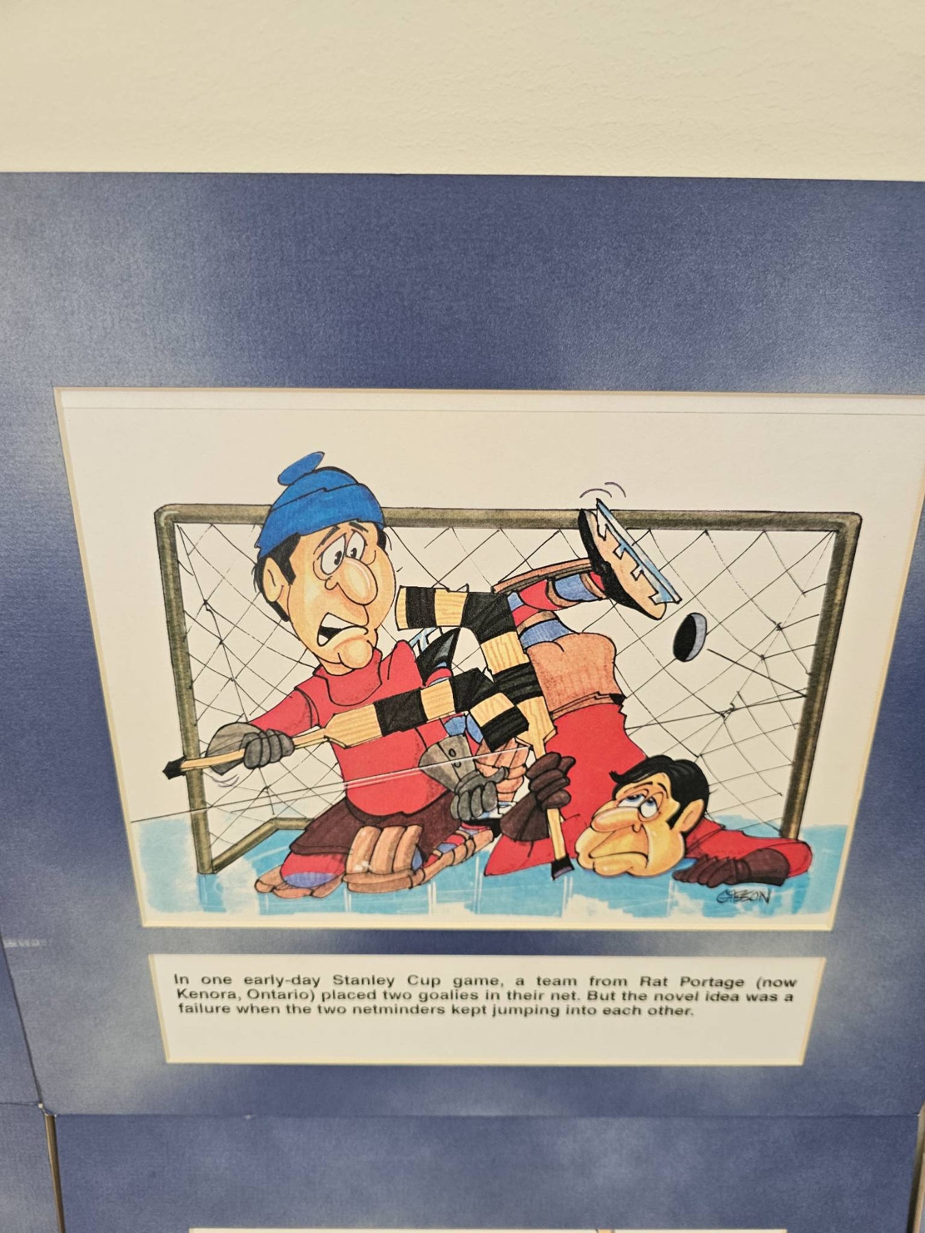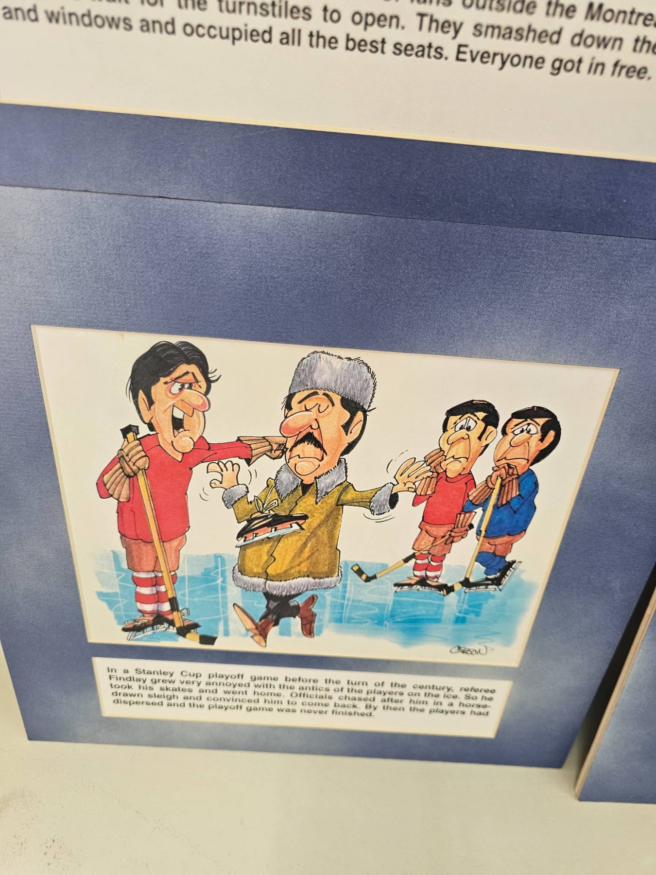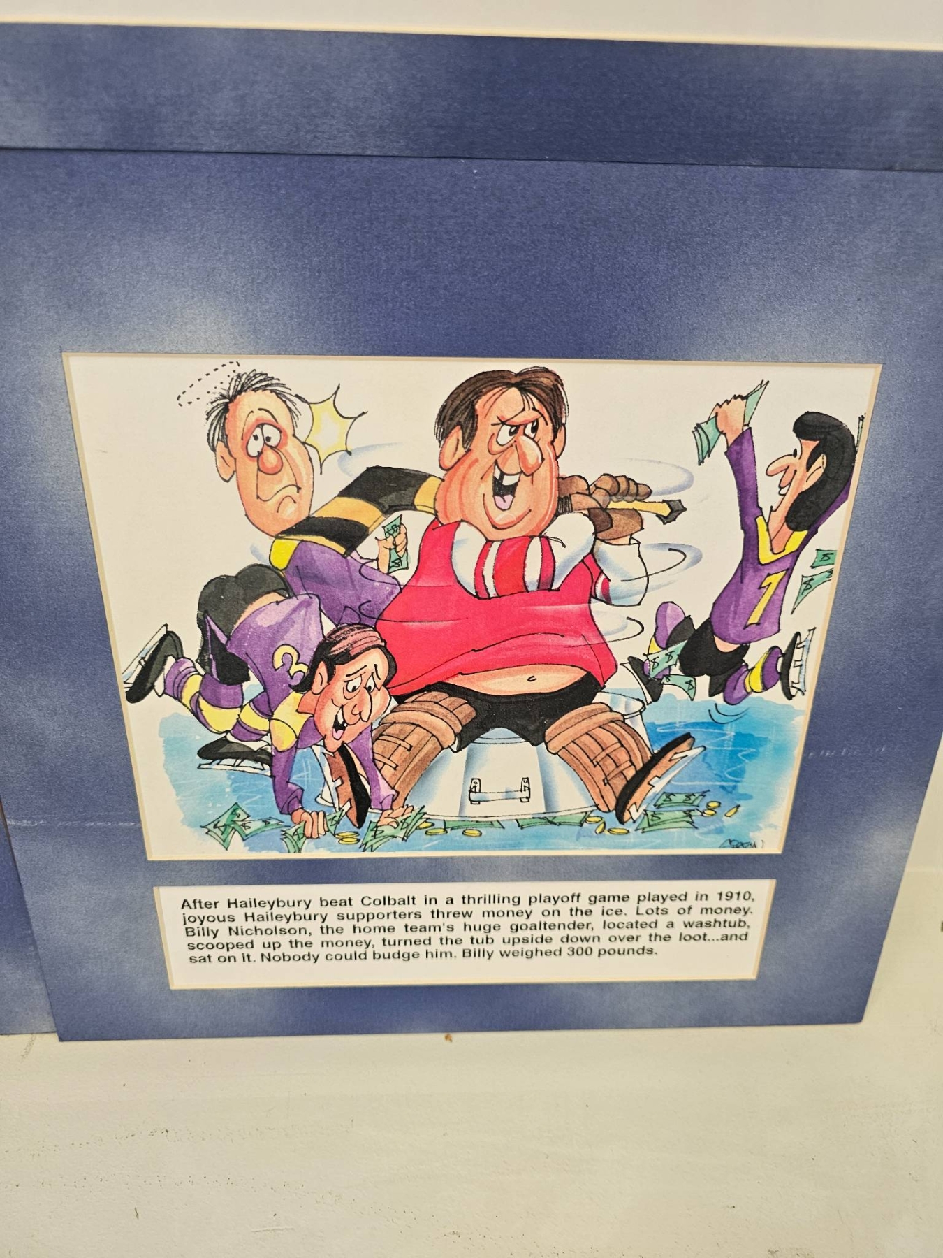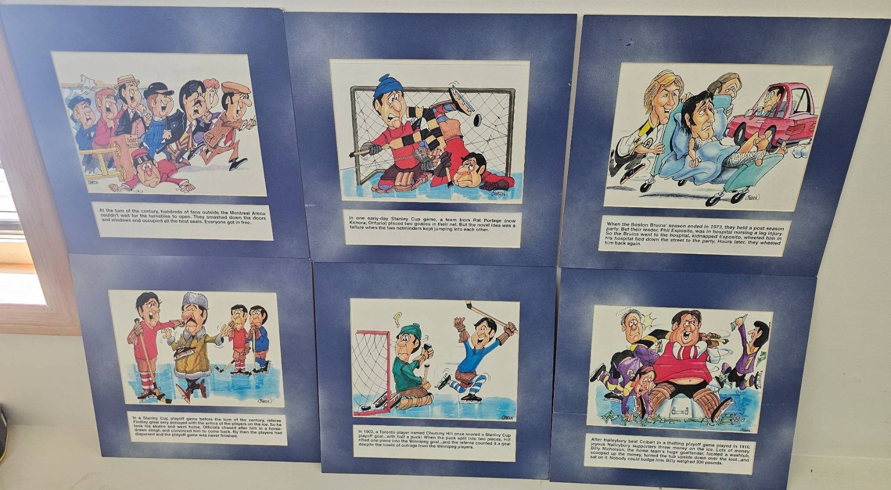 6 humorous hockey-themed cartoon prints with colorful illustrations and narrative captions. Each print includes a historical or humorous depiction of hockey scenarios, framed in a blue mat. These pieces capture moments in early hockey history through caricature and humor, providing a lighthearted take on the sport's culture.