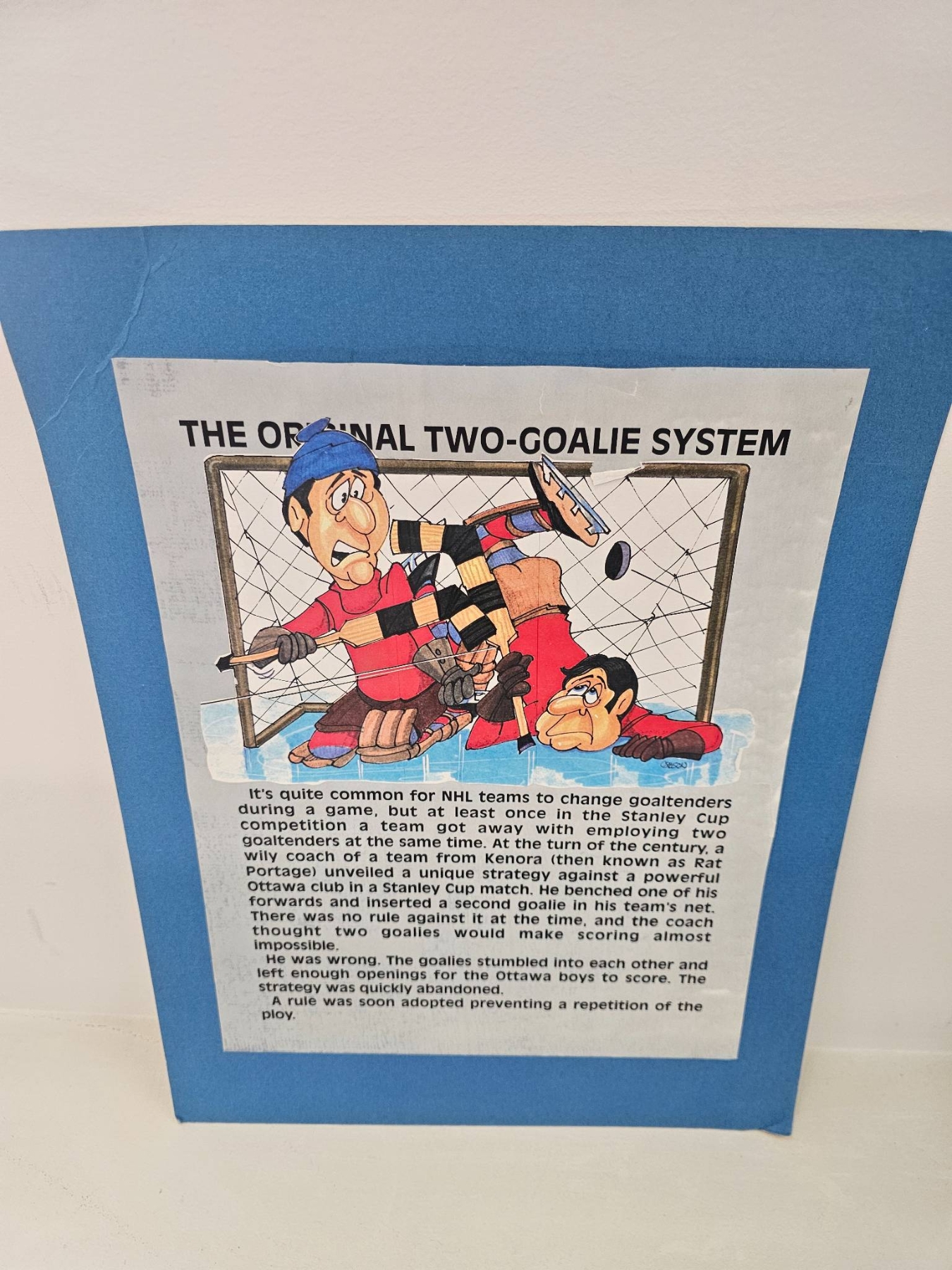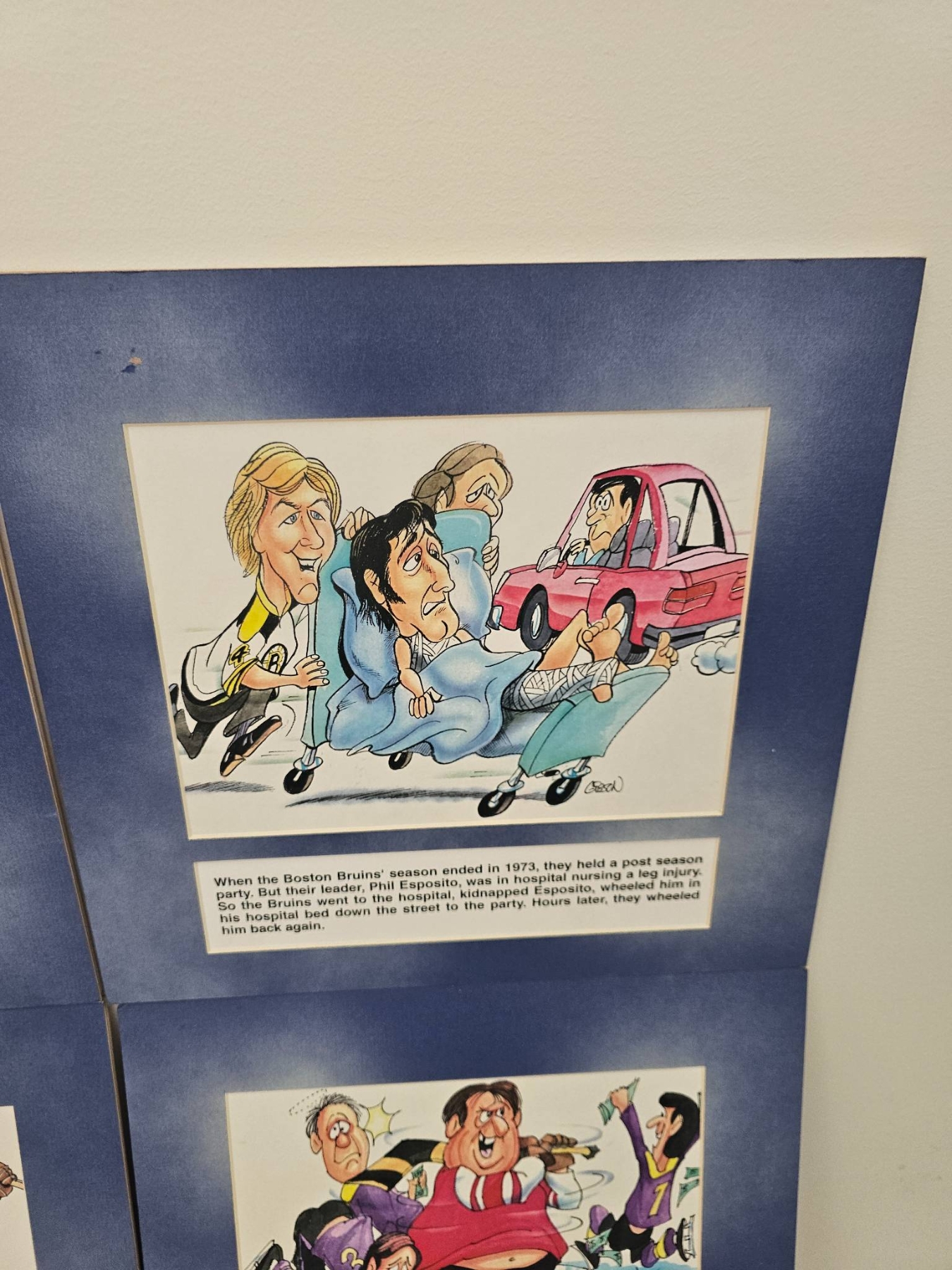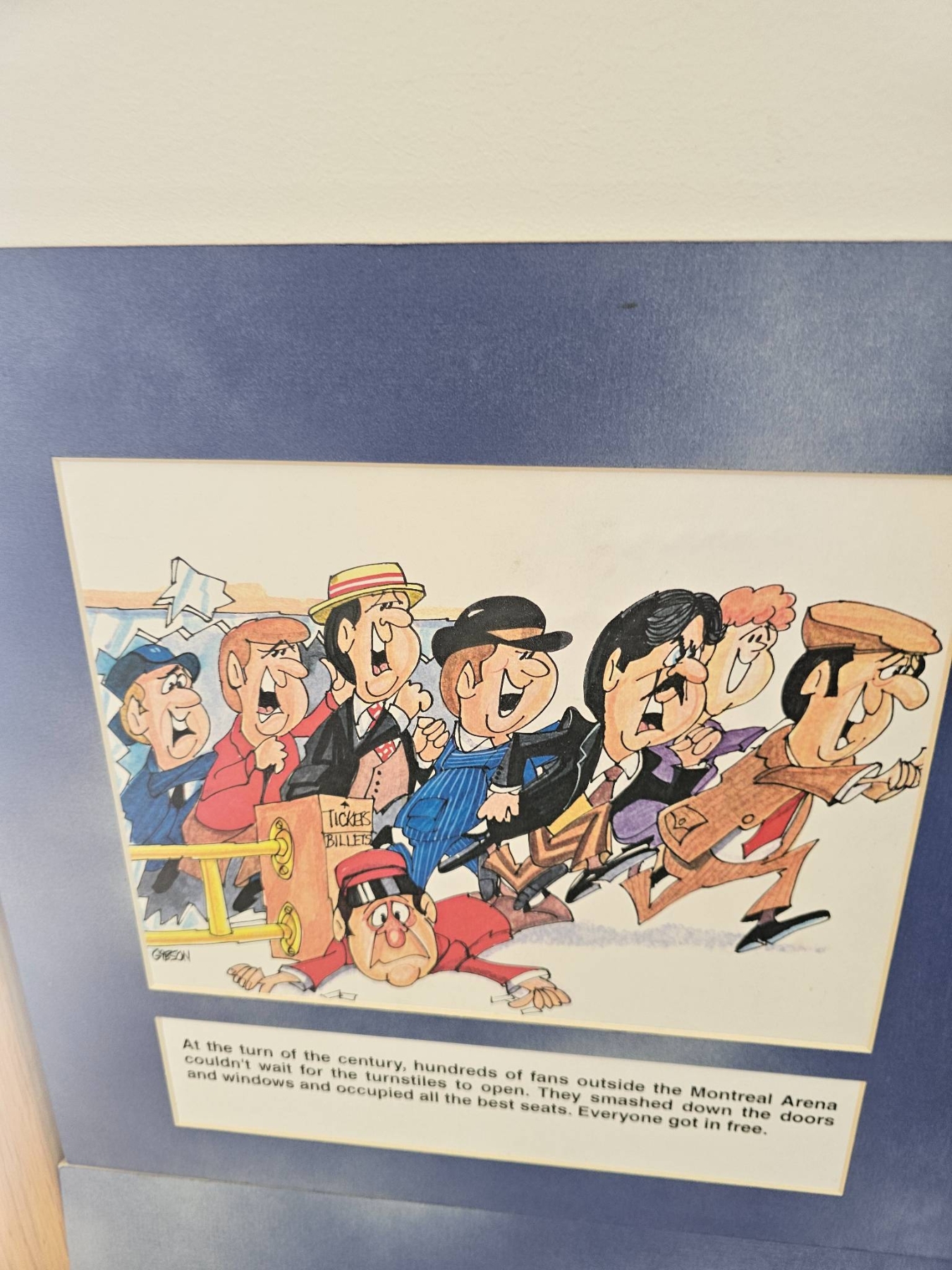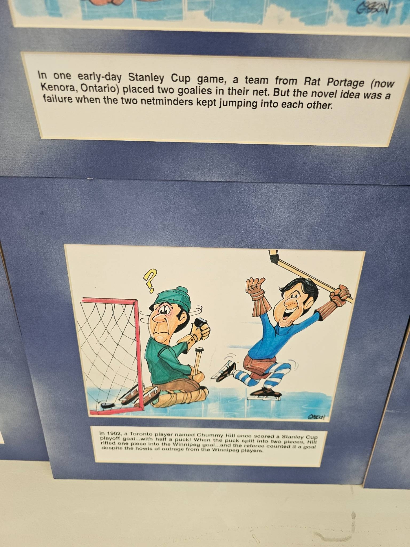 6 humorous hockey-themed cartoon prints with colorful illustrations and narrative captions. Each print includes a historical or humorous depiction of hockey scenarios, framed in a blue mat. These pieces capture moments in early hockey history through caricature and humor, providing a lighthearted take on the sport's culture.