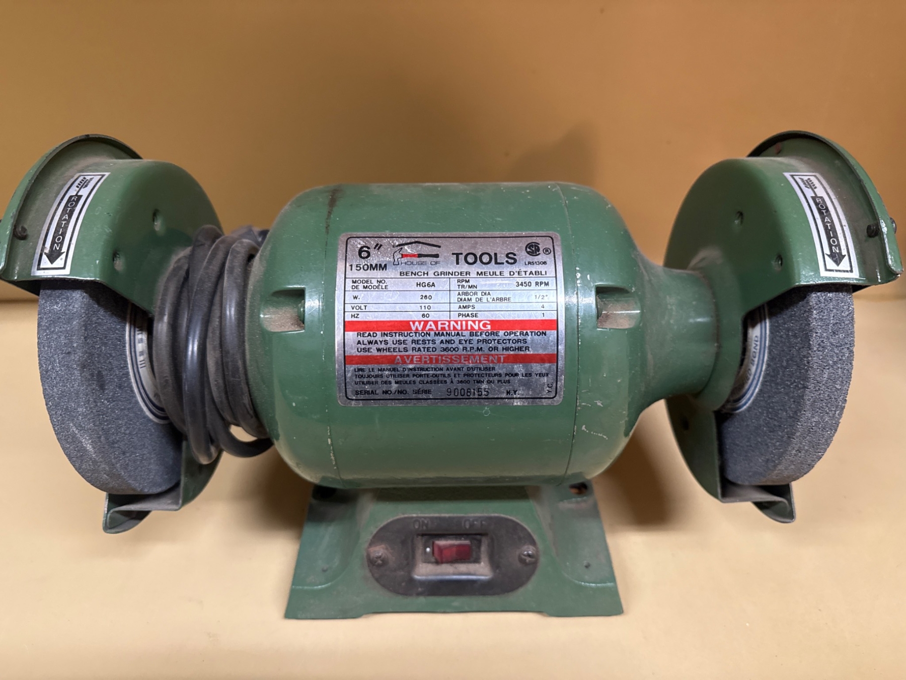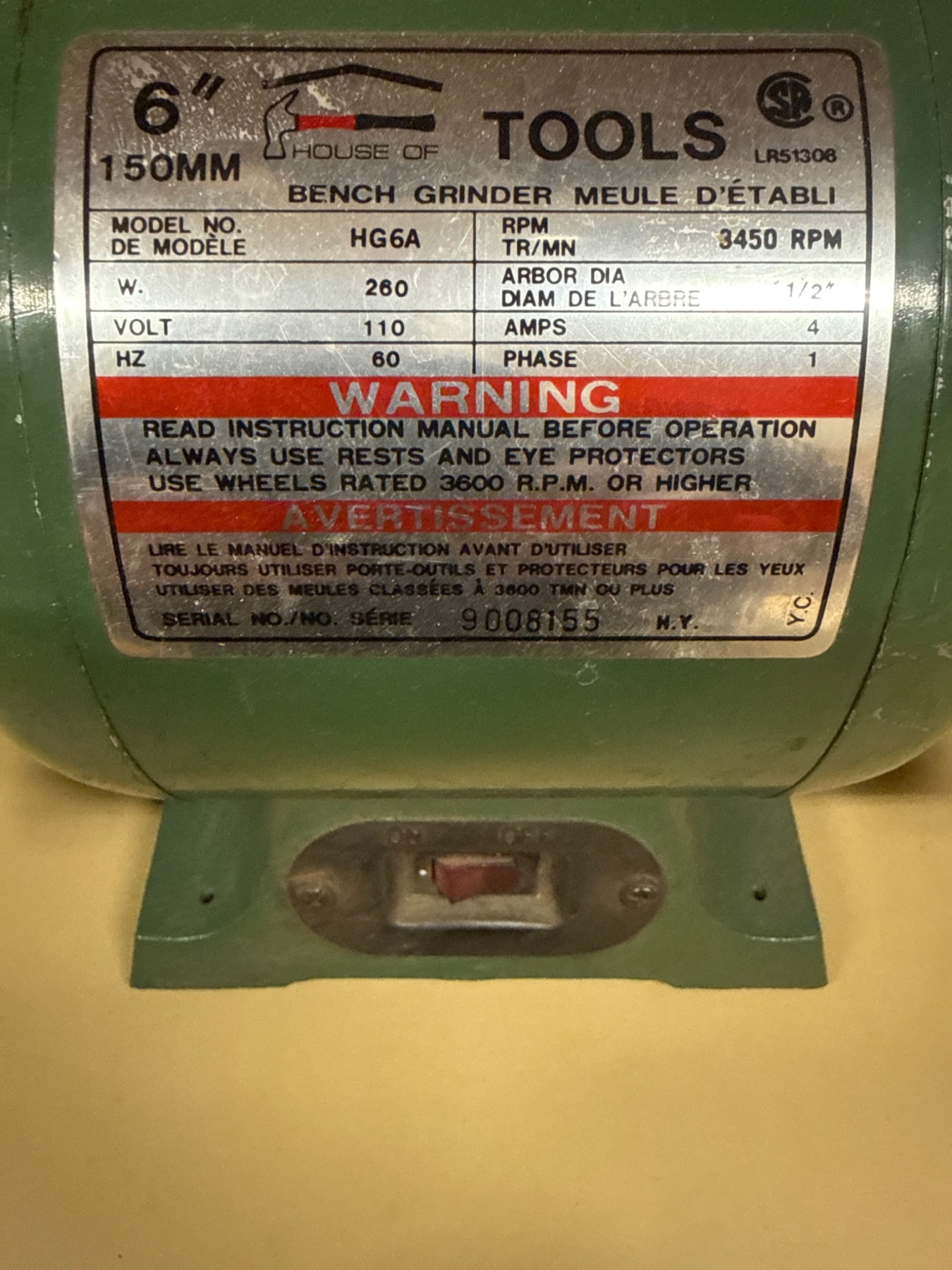 6-Inch Bench Grinder, Model HG6A, 3450 RPM, House of Tools