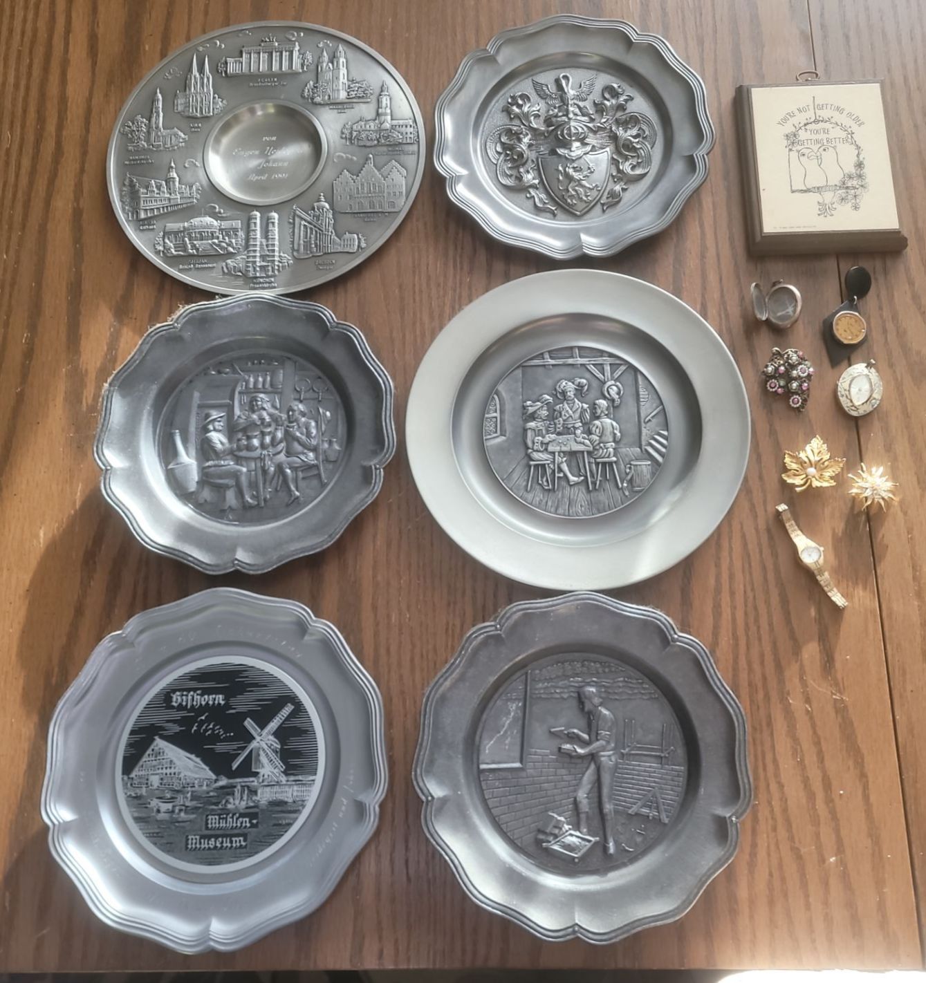 6 Metal Decorative Plates, Wooden Plaque, Brooches, Watches & More