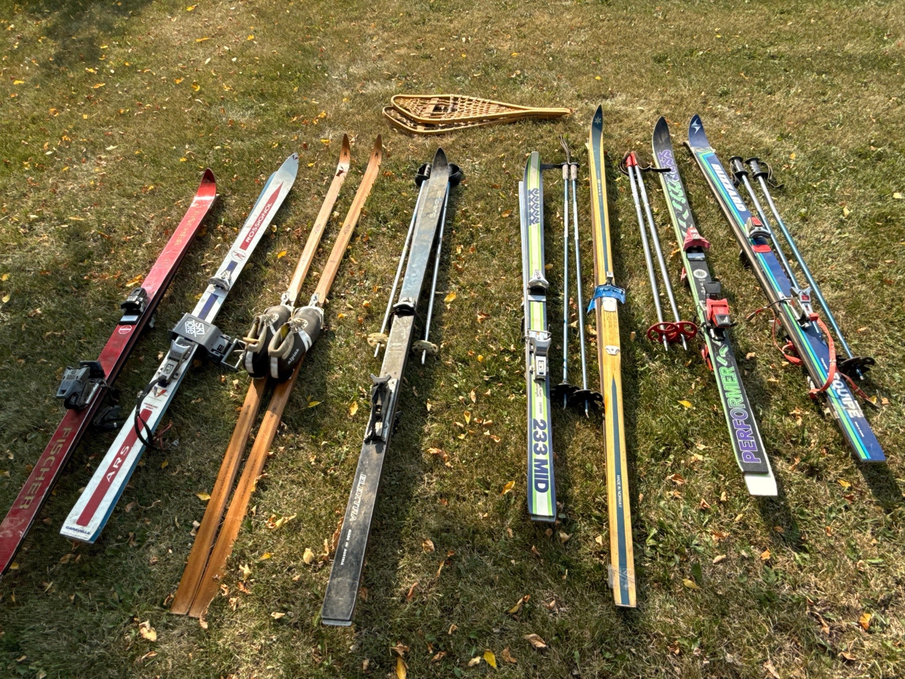 6 Sets Downhill Skis, Poles, 2 Sets Cross Country Skis And Set Of Snow Shoes
