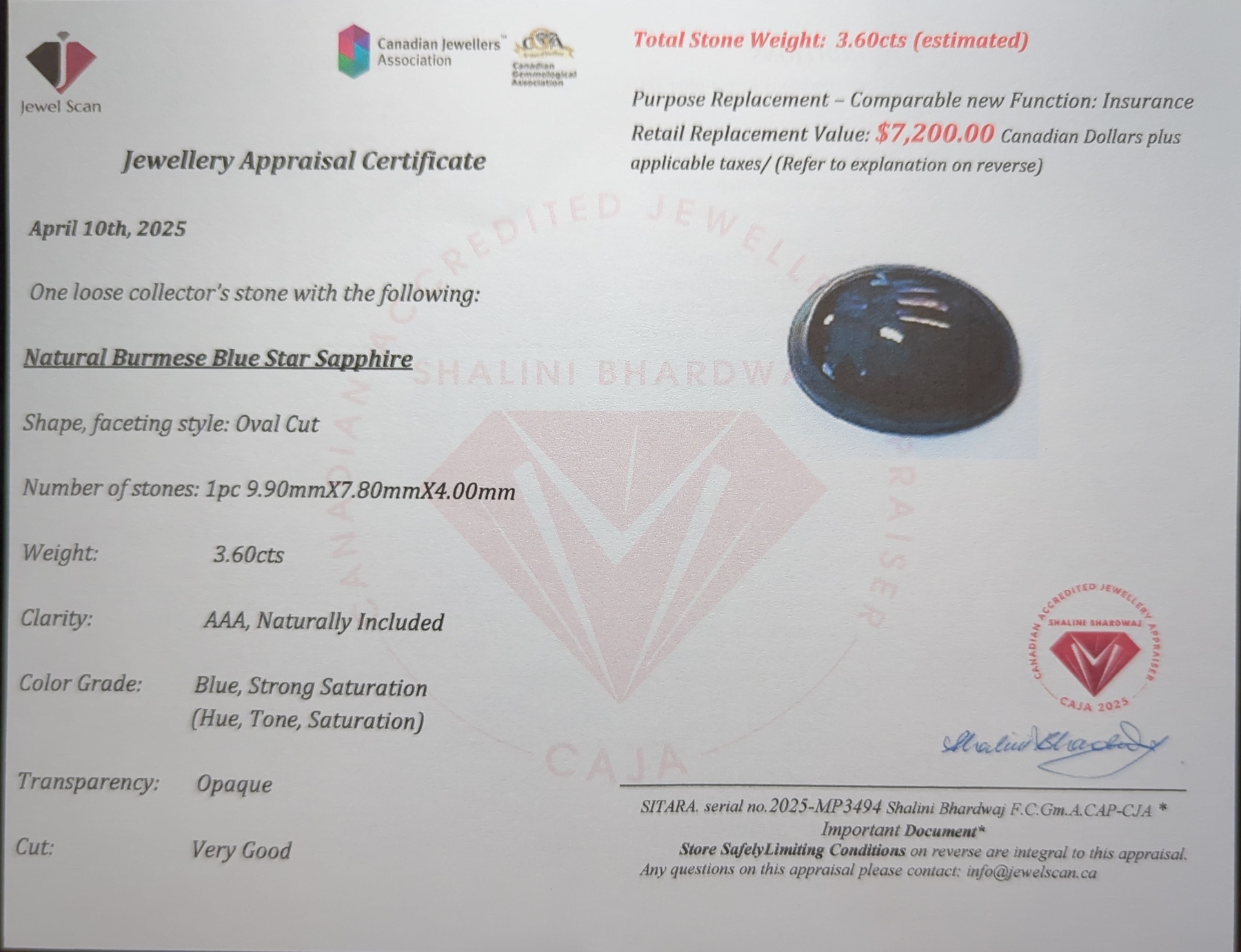 $7,200 Appraisal - 3.6 ct Cert. Blue Star Sapphire Gemstone
