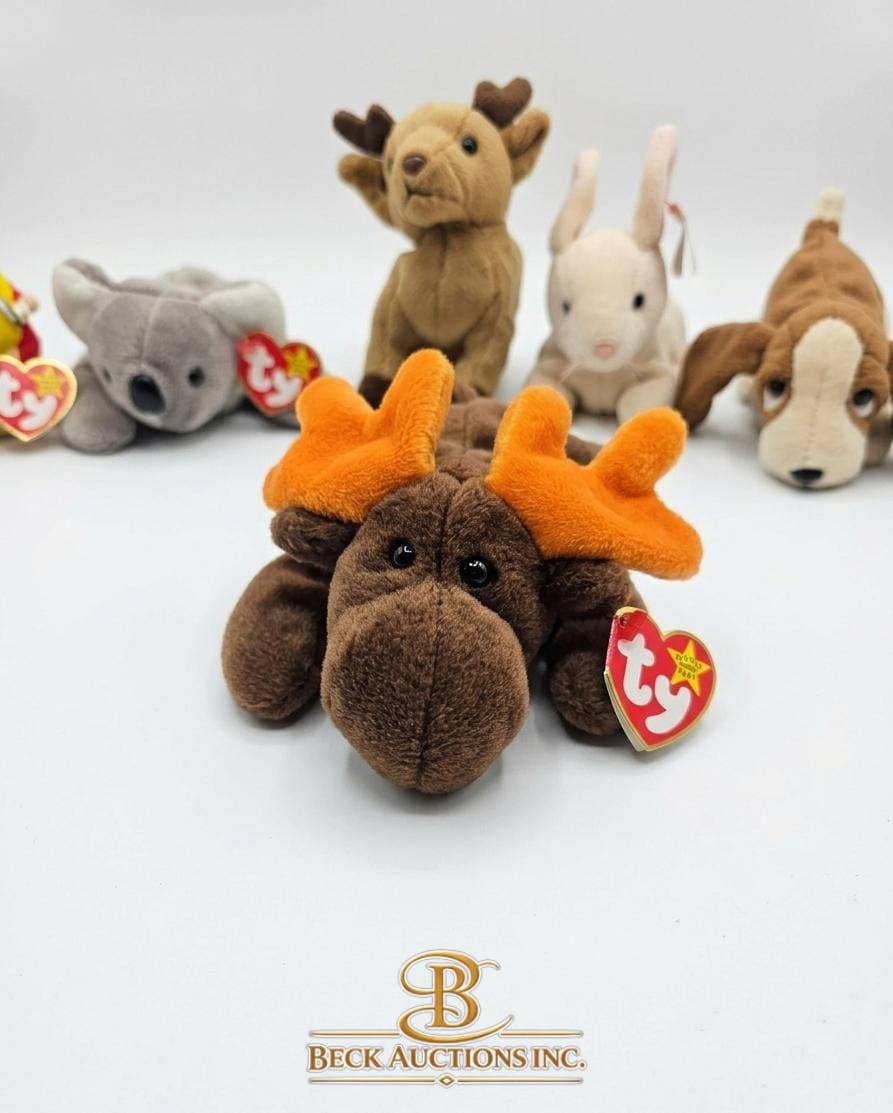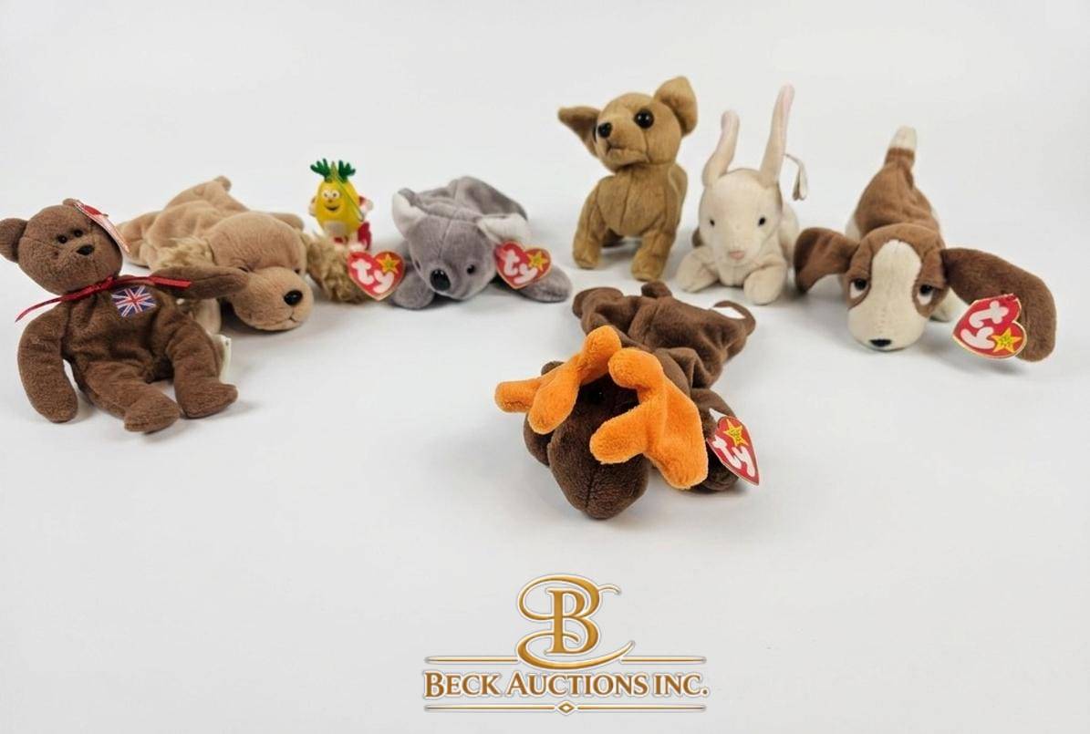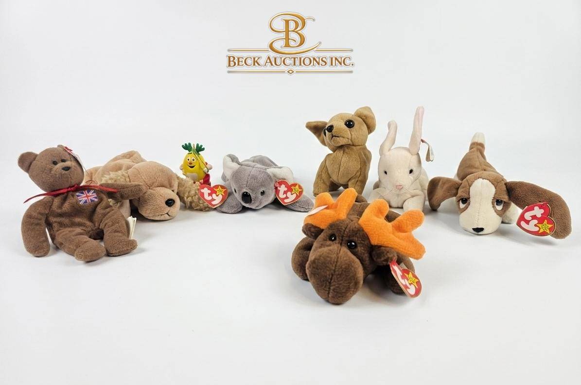 This lot includes seven Ty Beanie Babies, each complete with their original heart-shaped hang tags, ensuring collector appeal. The set consists of endearing animal designs: a moose, a brown bear, a koala, a rabbit, a basset hound, a pineapple-themed critter, and a fawn. Measurements vary slightly with each piece, . Carefully preserved, these Beanie Babies showcase the charming craftsmanship and nostalgic appeal of Ty collectibles.