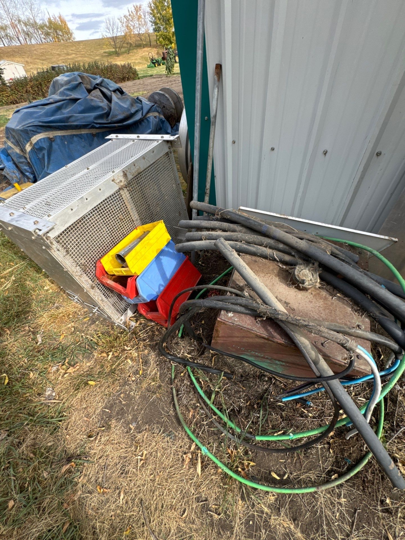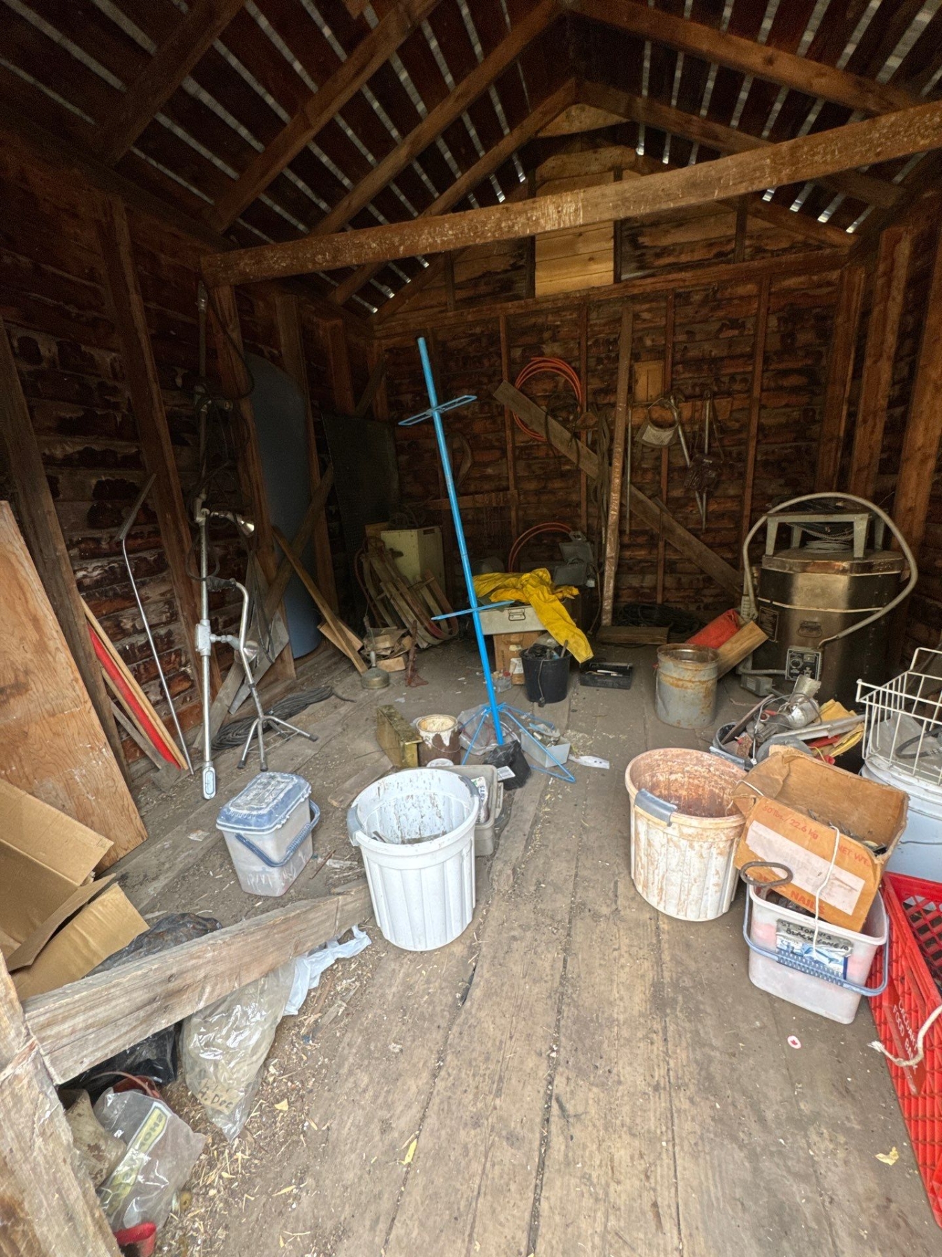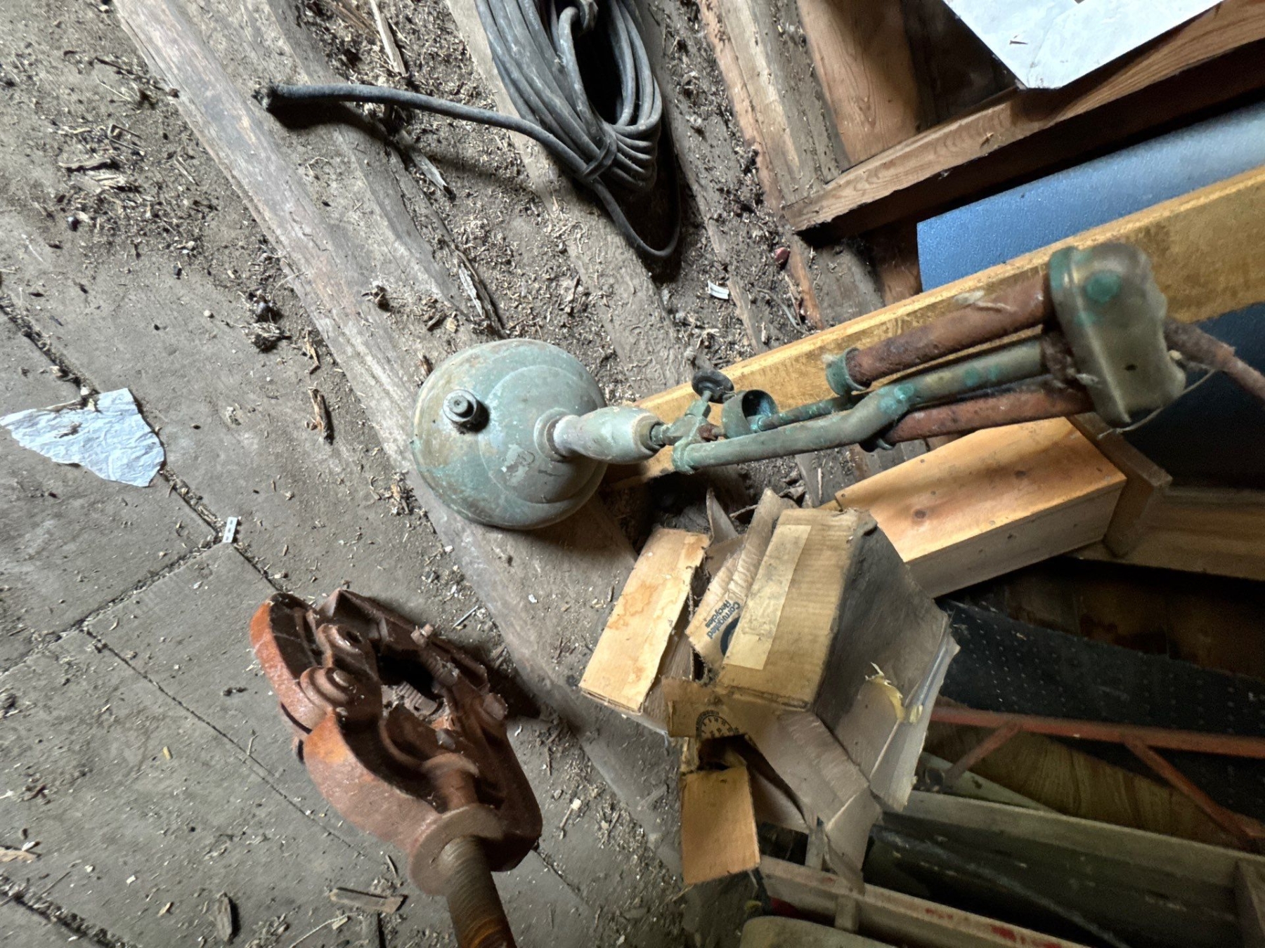 7 all contents in shed included, chicken wire, chain, two antique toboggan, industrial lighting, Paragon Kiln operation unknown, nails, tools, outside contents included