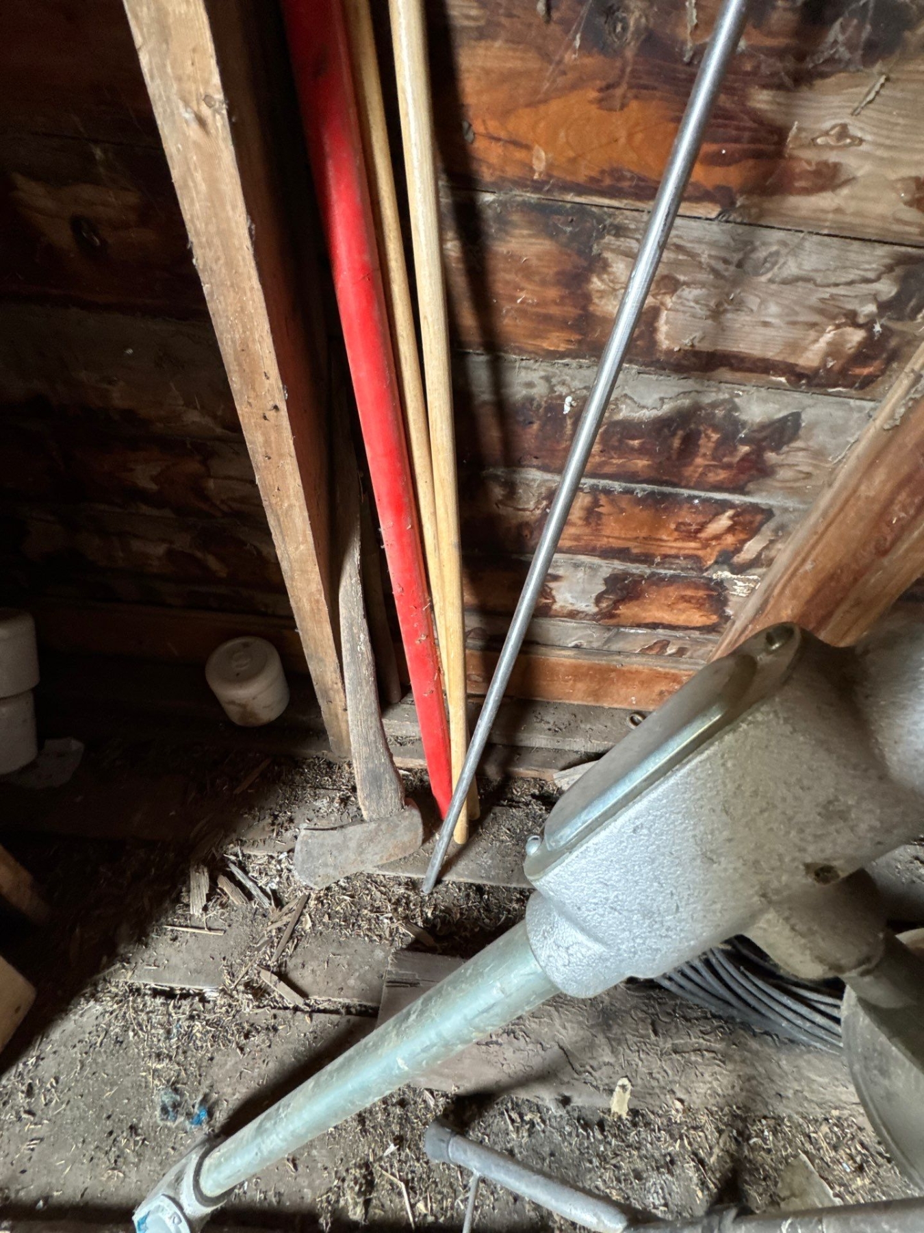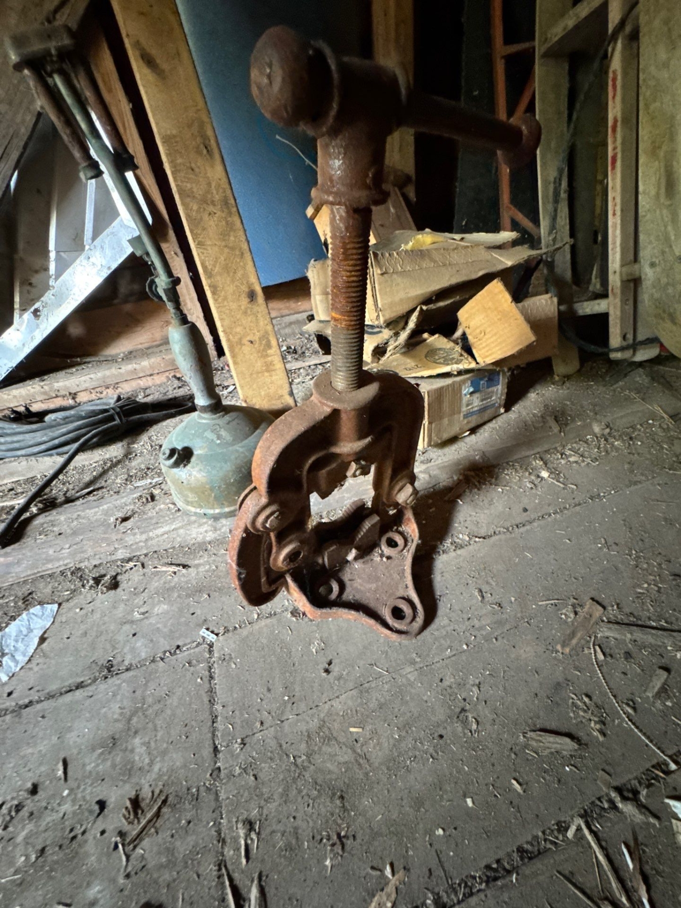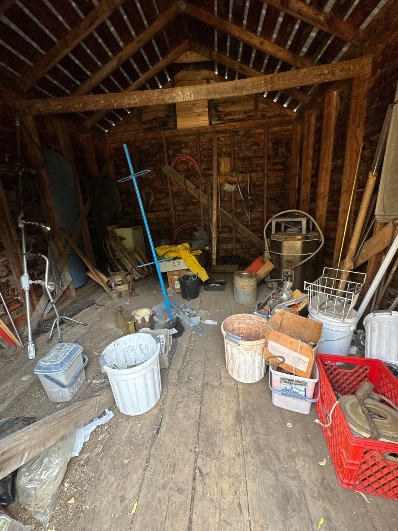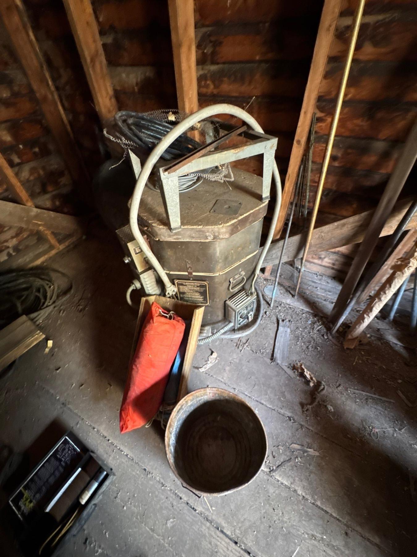7 all contents in shed included, chicken wire, chain, two antique toboggan, industrial lighting, Paragon Kiln operation unknown, nails, tools, outside contents included