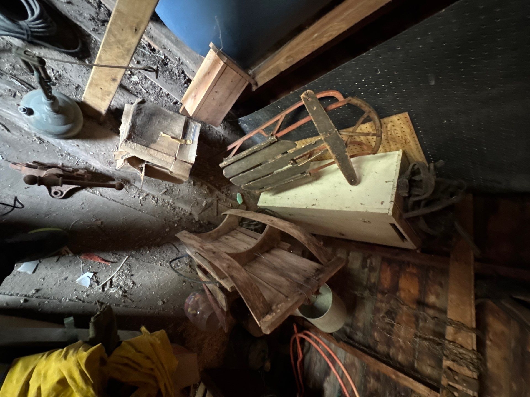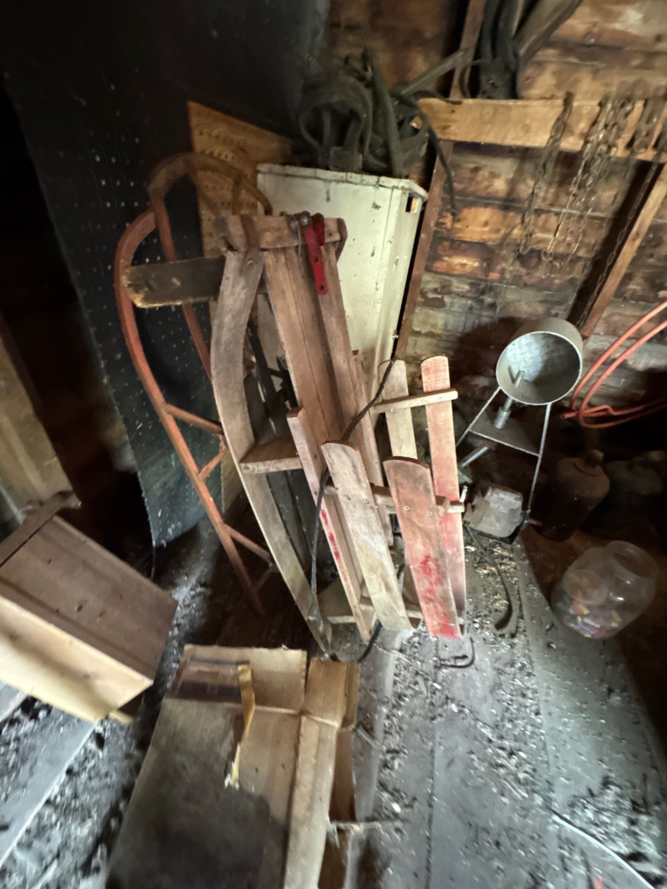 7 all contents in shed included, chicken wire, chain, two antique toboggan, industrial lighting, Par