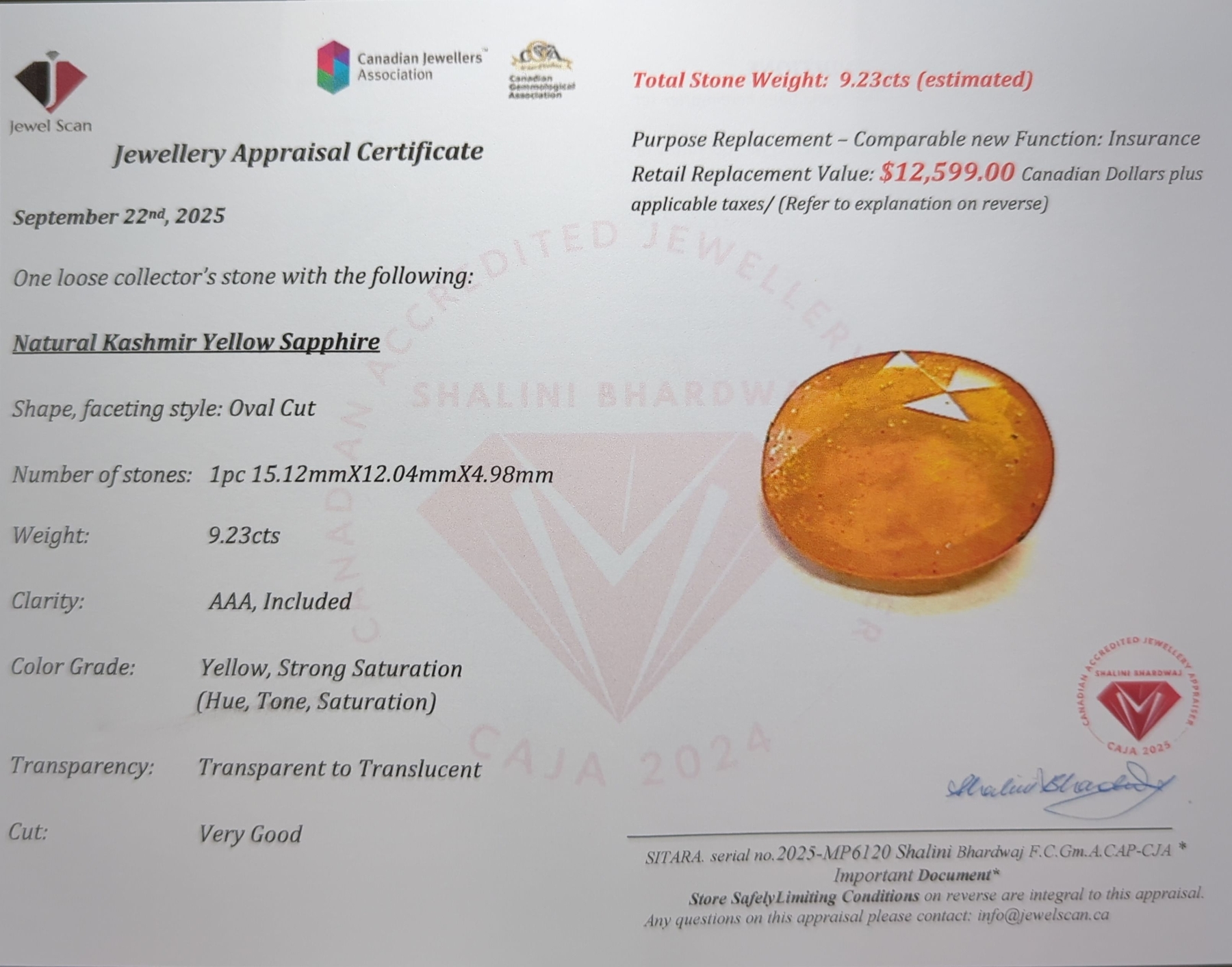 9.23 ct Certified Kashmir Yellow Sapphire Gemstone ($12,599 Appraisal)