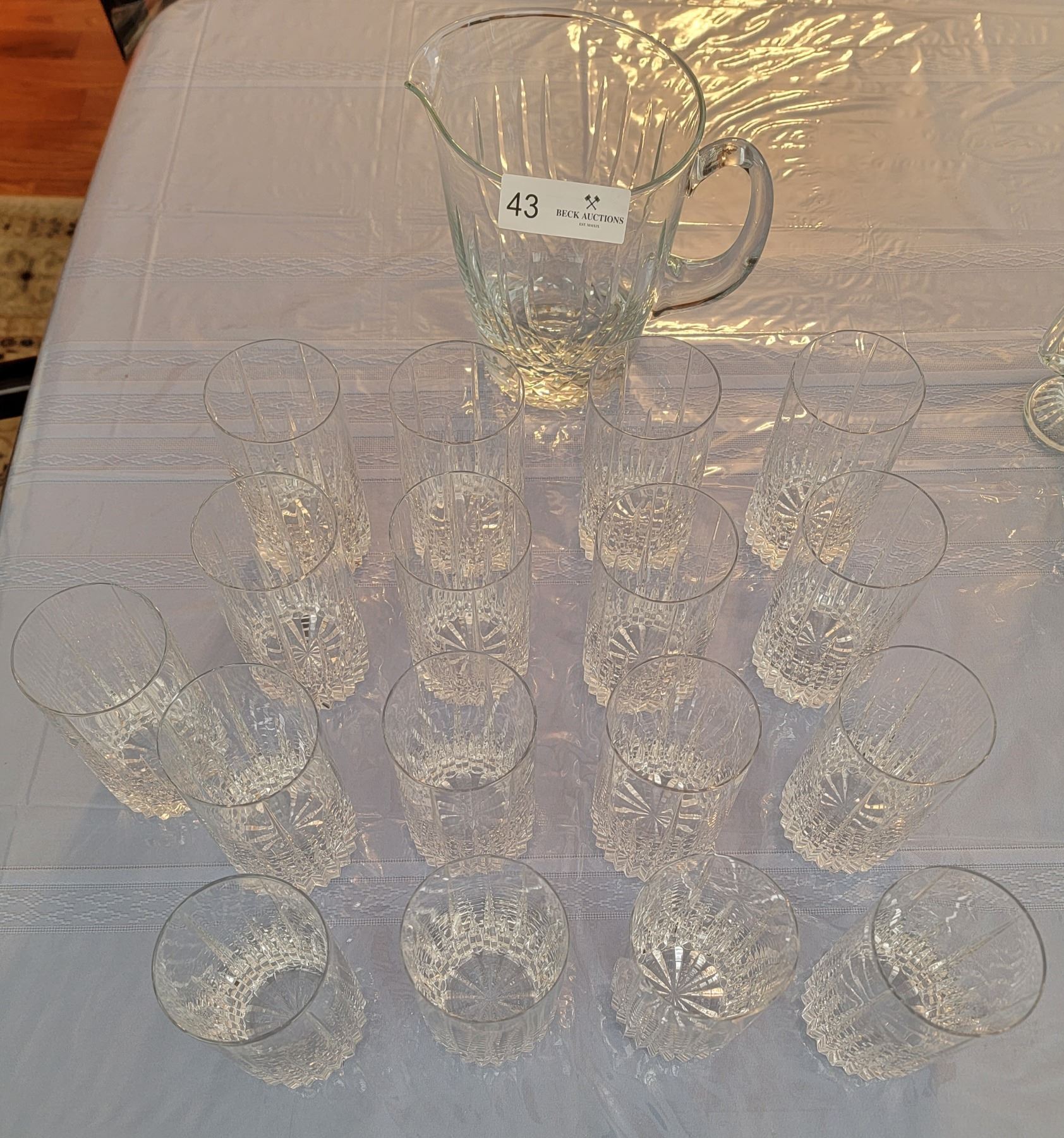 A Beautiful Crystal Water Pitcher, Accompanied By 17 Crystal Water Glasses.