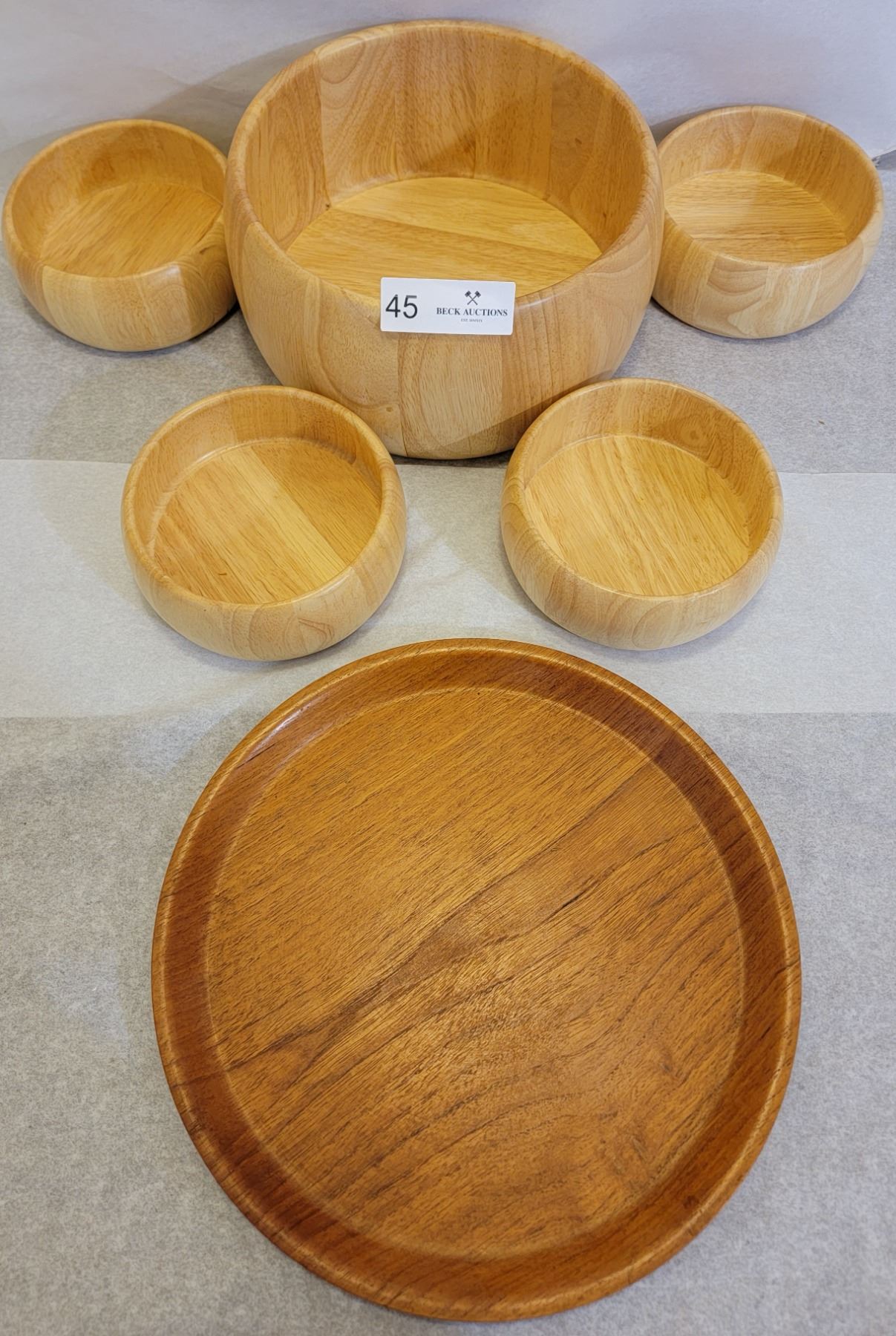 A Collection Of Wooden Salad Dish, Accompanied By A Wooden Serving Tray.