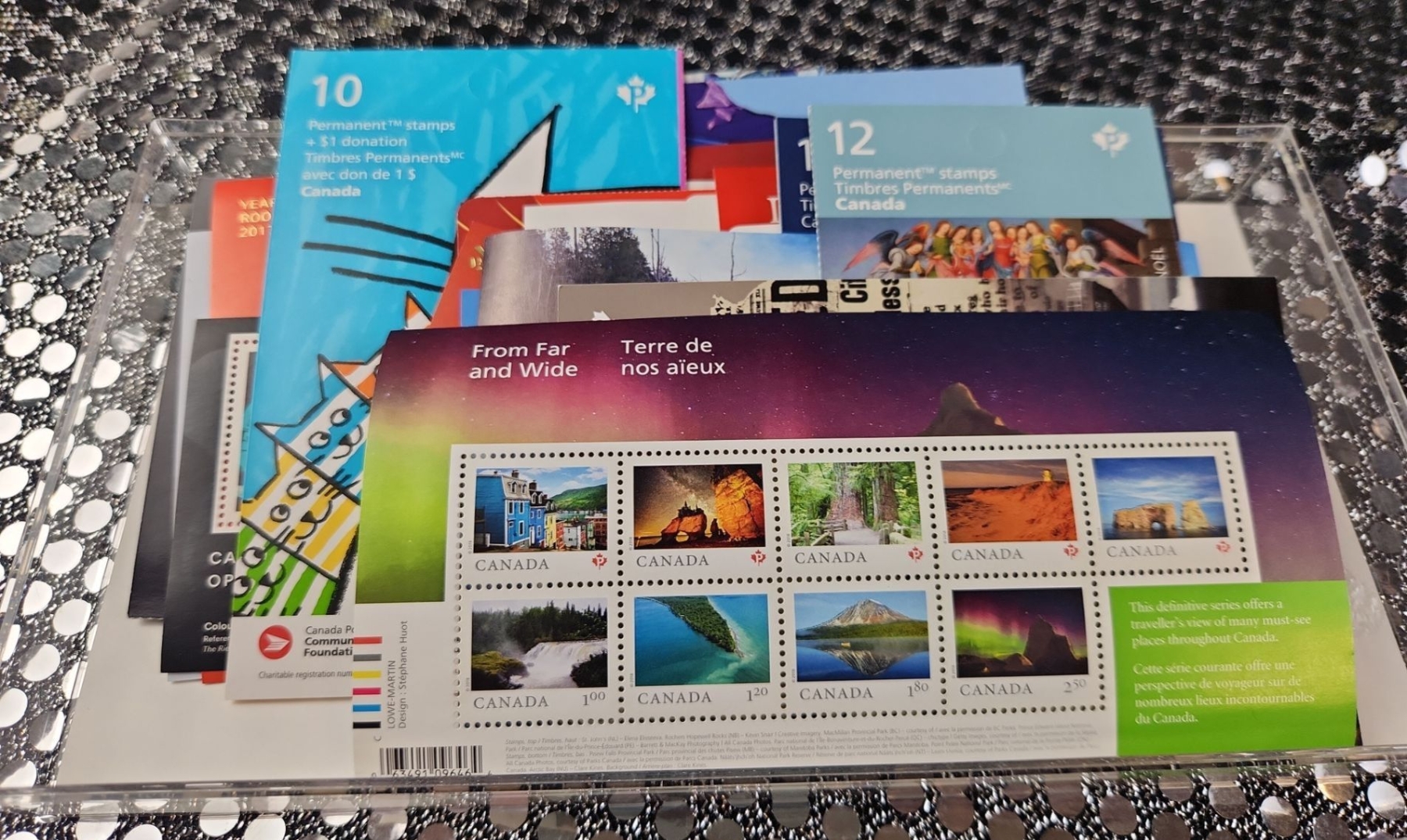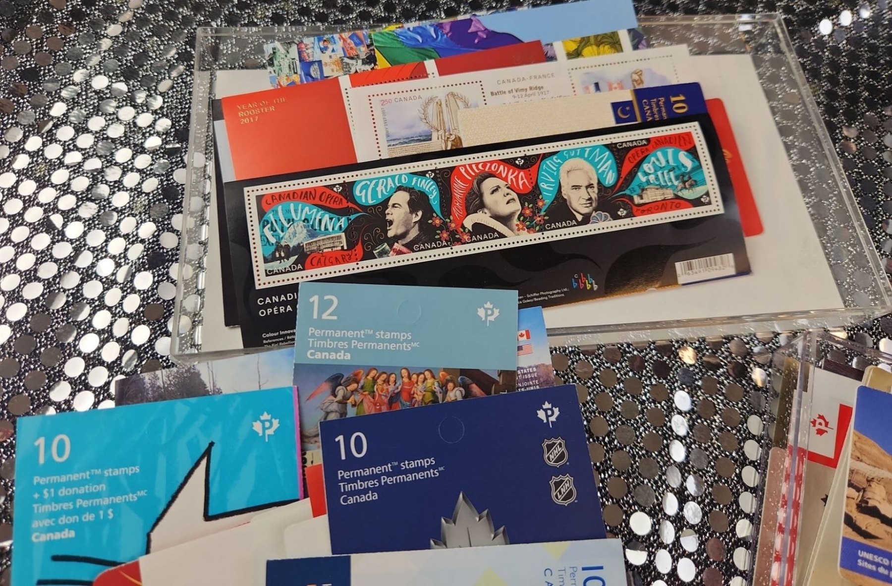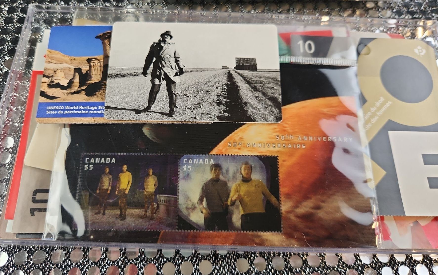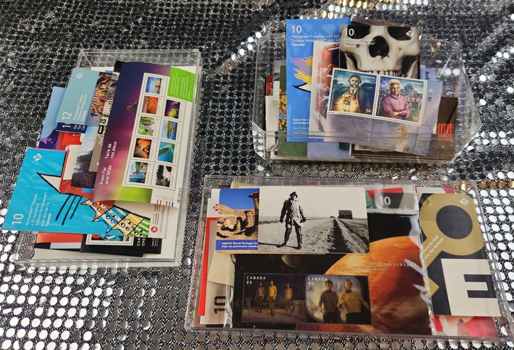 This collection includes various "Permanent" stamps. Many stamps feature Canadian themes, including UNESCO World Heritage Sites, Canadian forwards, historical moments like women's suffrage and Star Trek. They are stored in transparent trays, and original booklets.