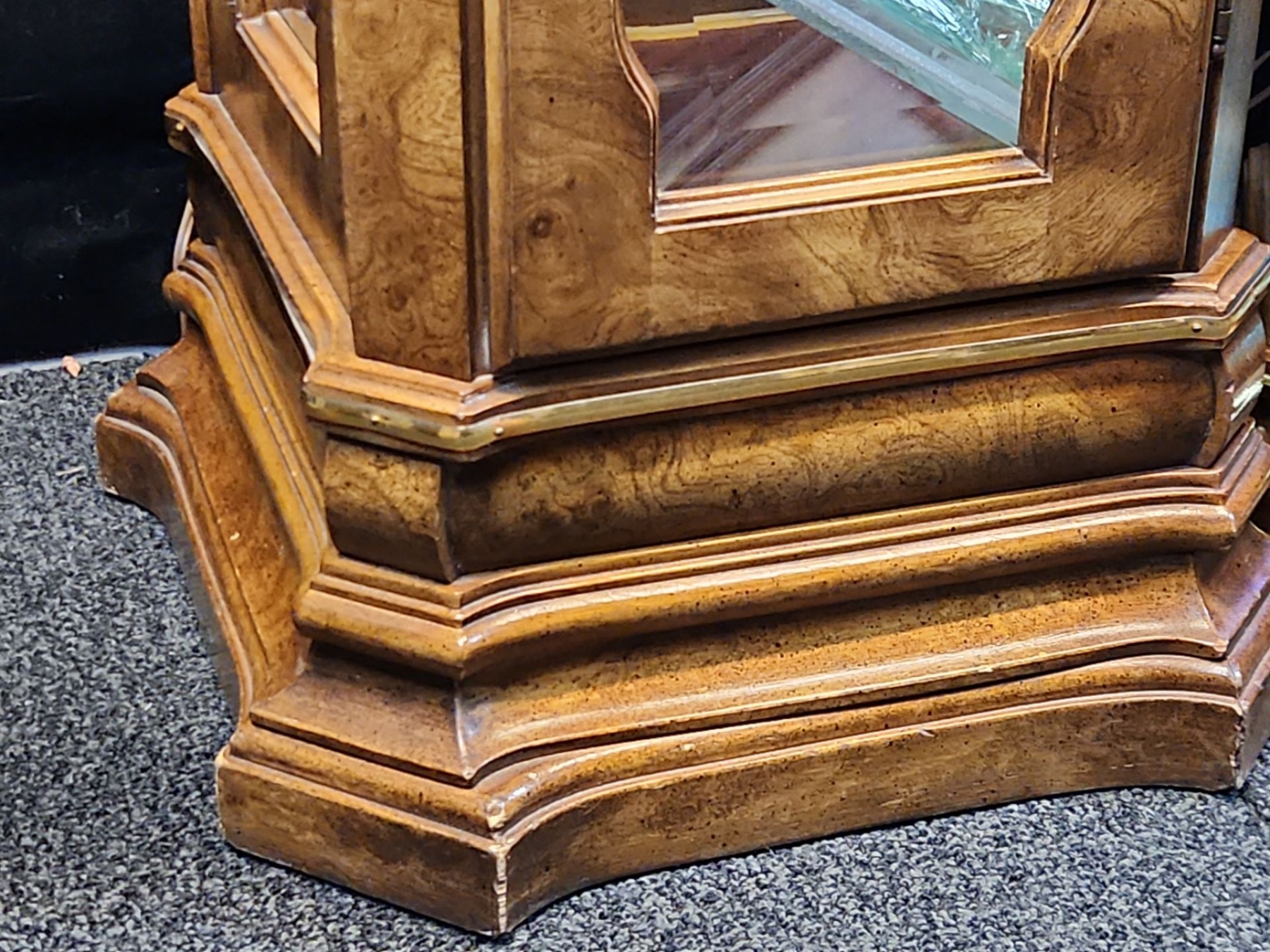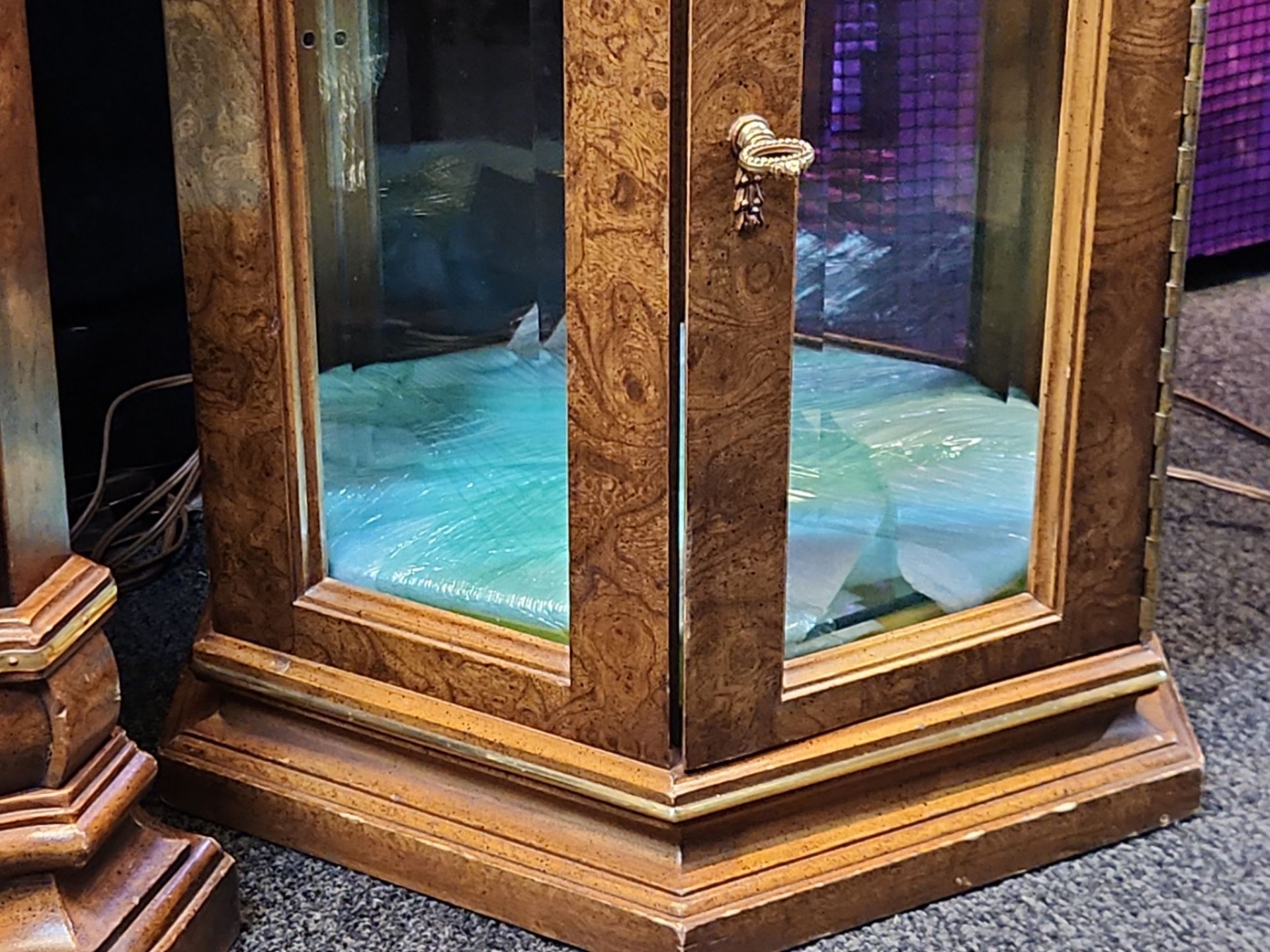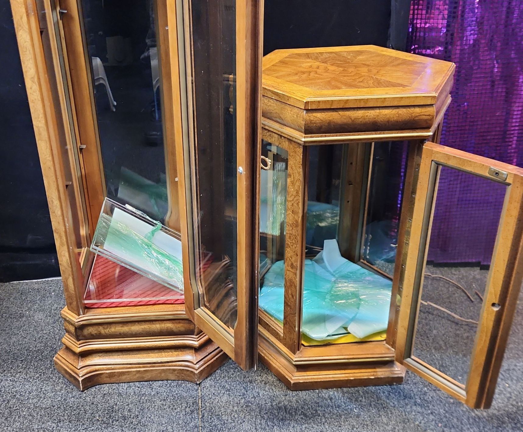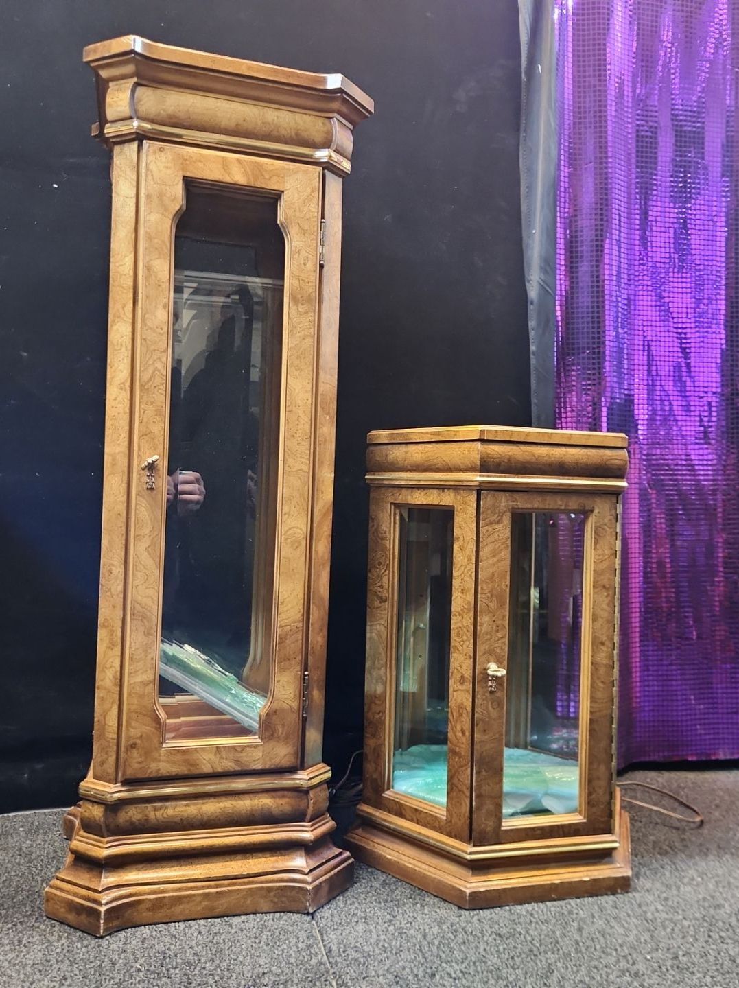 This matching pair of wooden and glass curio cabinets features built-in lighting to beautifully highlight displayed items while adding a warm, elegant touch to any room. Their space-saving size makes them perfect for smaller areas, and being tested means they’re ready to use right away. A coordinated set like this is both functional and visually striking.