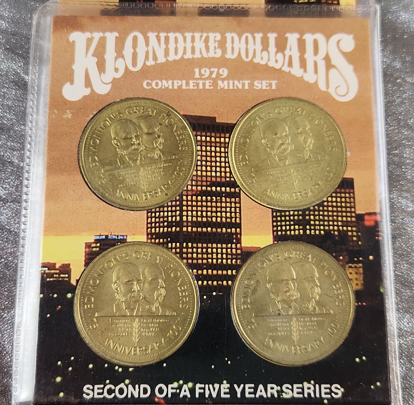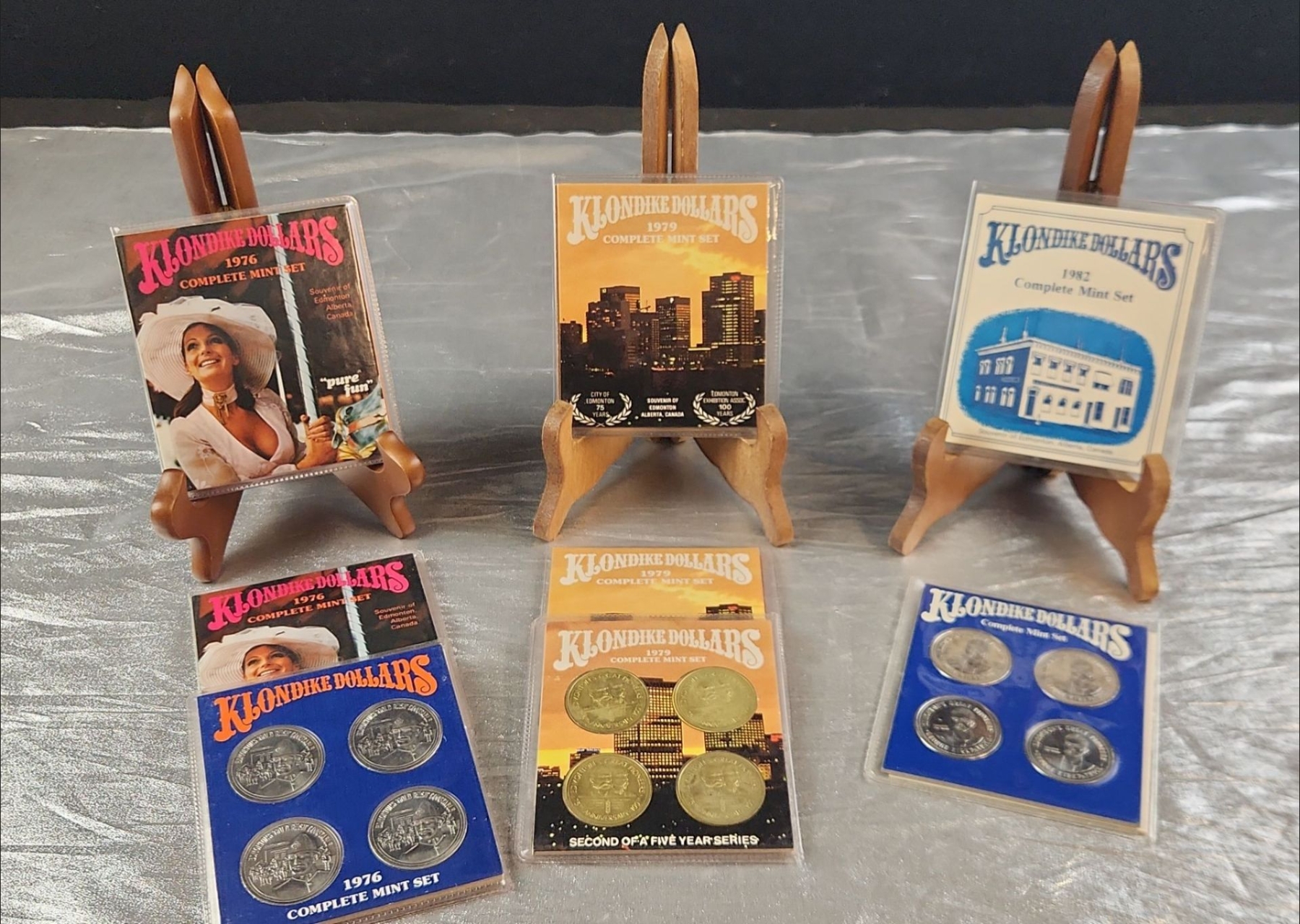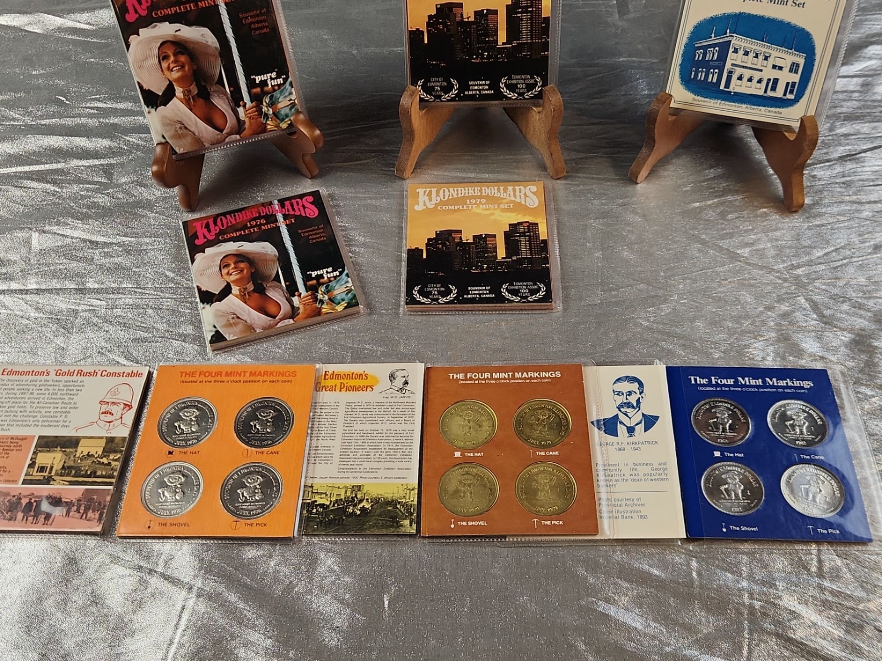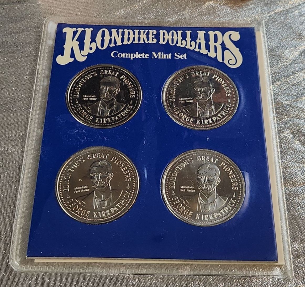 This collection of souvenir trade tokens/coin sets were originally valid for use in participating Edmonton stores during the festival summers in the 1970's, early 1980's. These coins often feature the festival mascot "Klondike Mike" and commemorate the gold rush era in Edmonton. These are uncirculated mint sets.