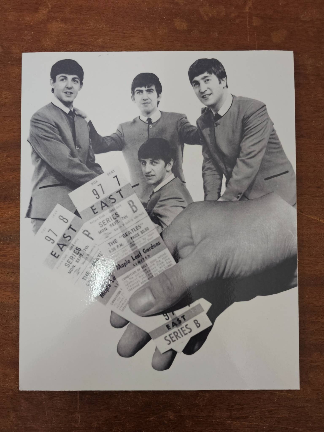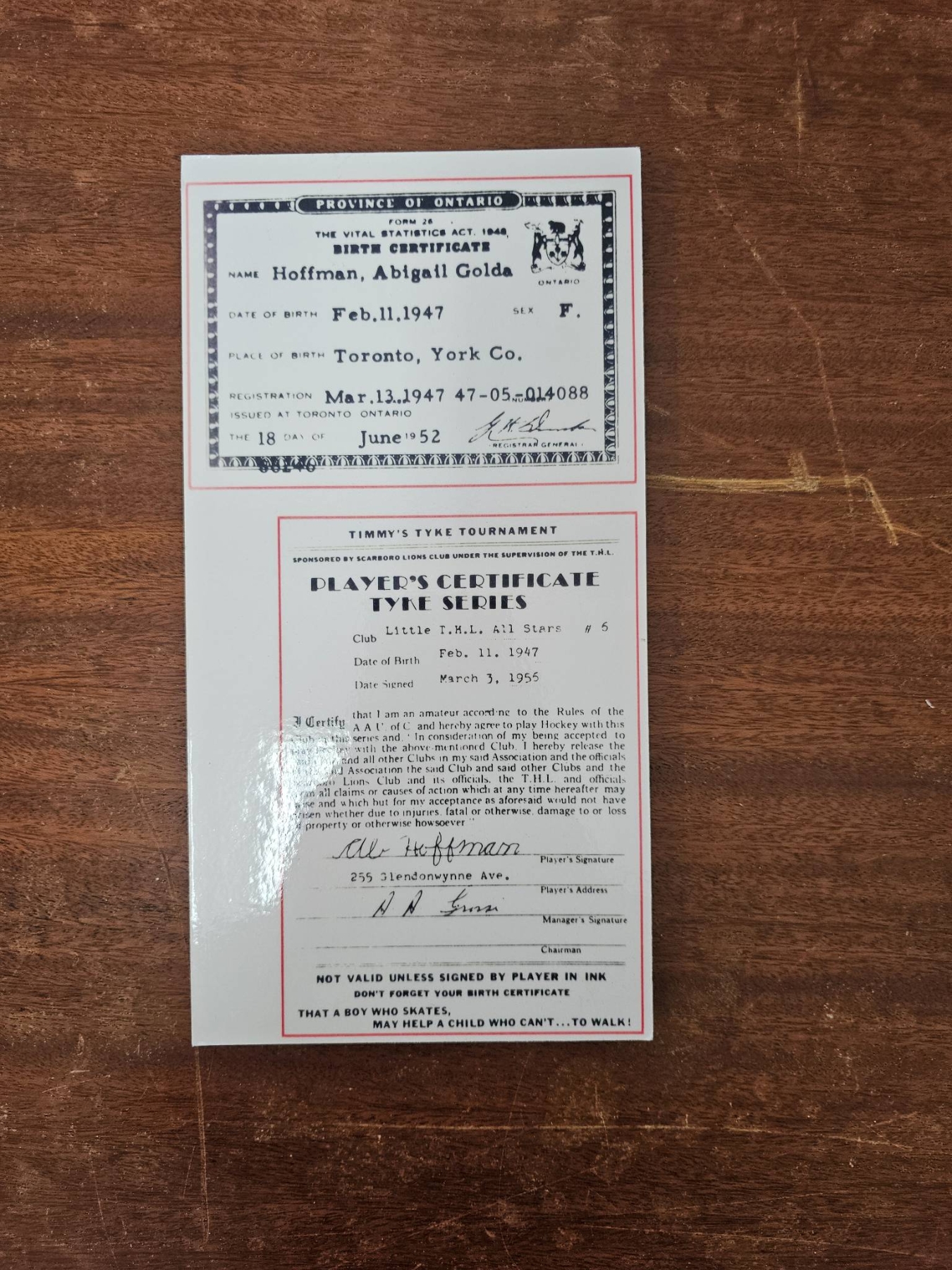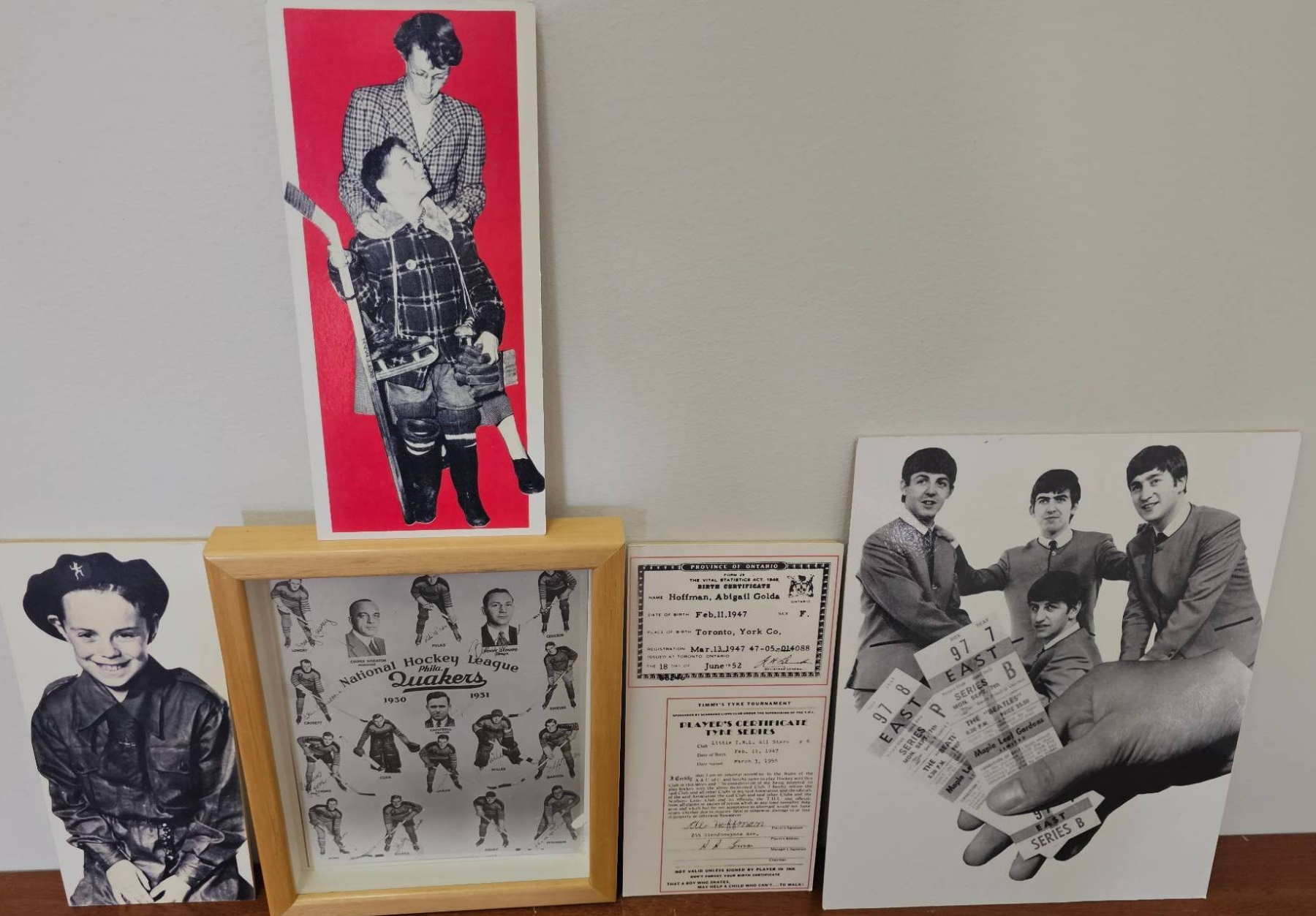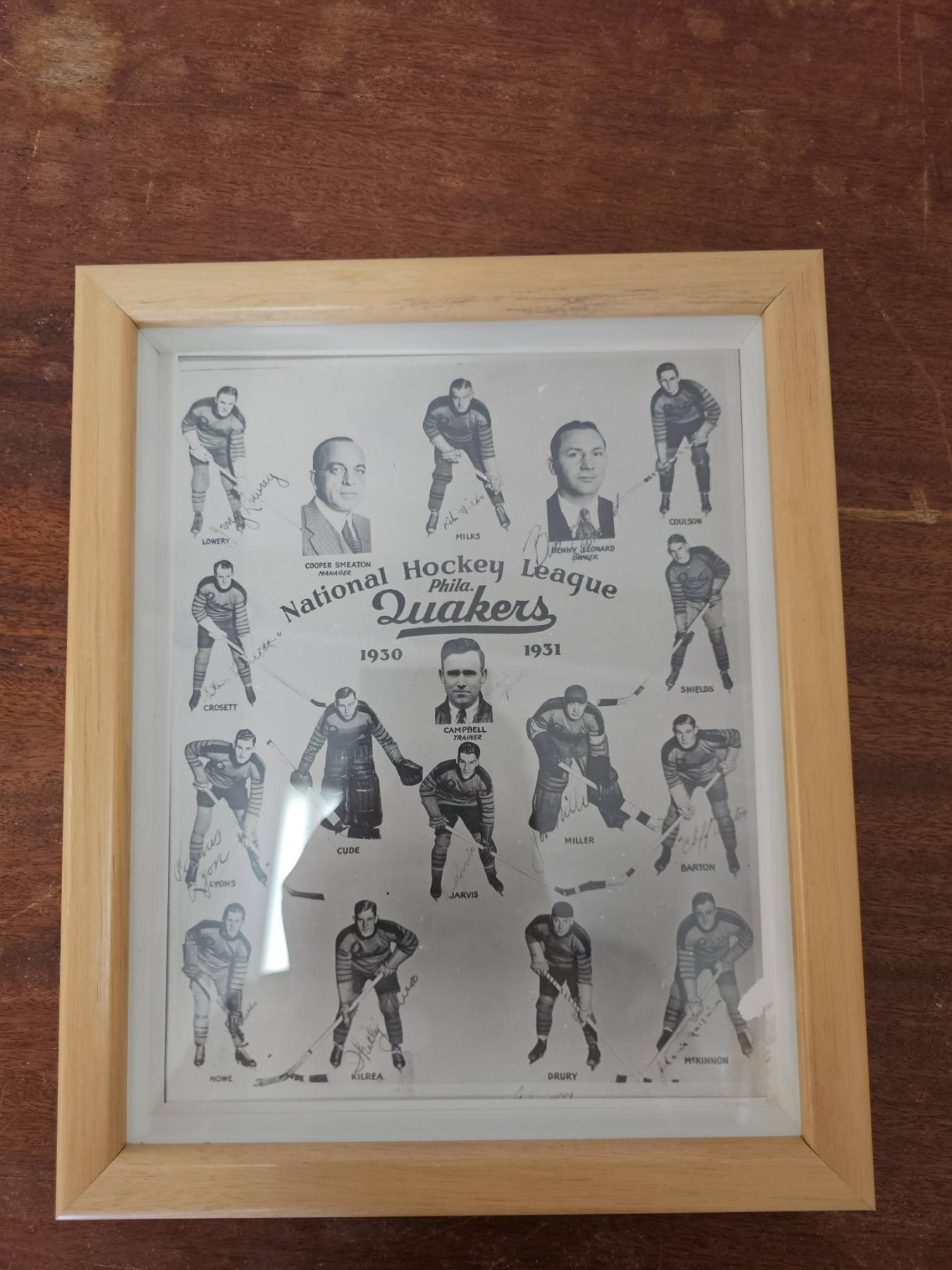 Multiple black-and-white and color prints of varying subjects: individuals, sports teams, and historical ephemera. Highlights include a framed 1930-1931 National Hockey League Philadelphia Quakers team print, a card signed "Hall of Fame" ticket replicas, and other photographic prints. Dimensions are varied, and condition is generally consistent with vintage materials, some wear noted.