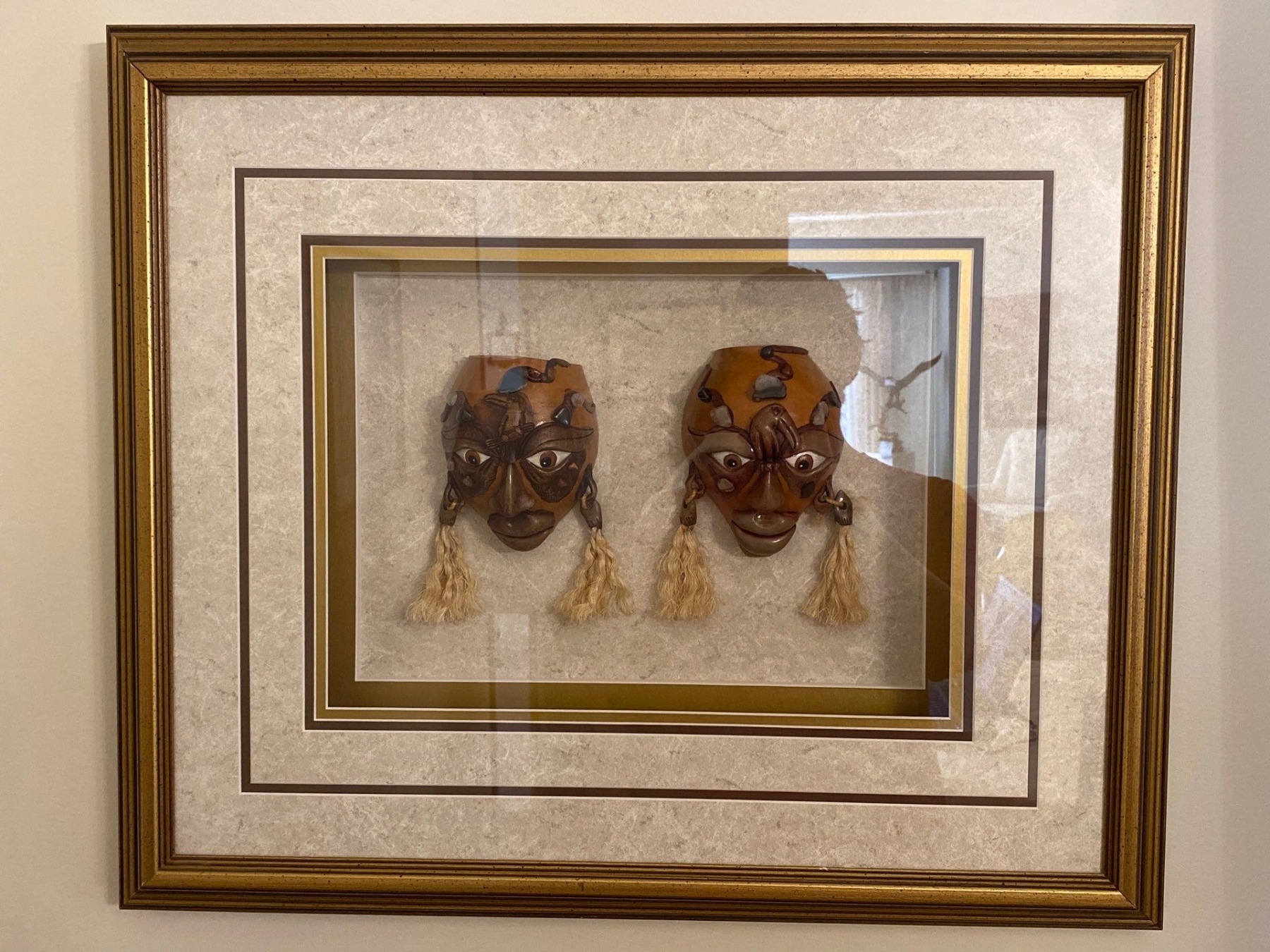 African Masks In Shadow Box Gourd & Pottery Construction 25 x 21