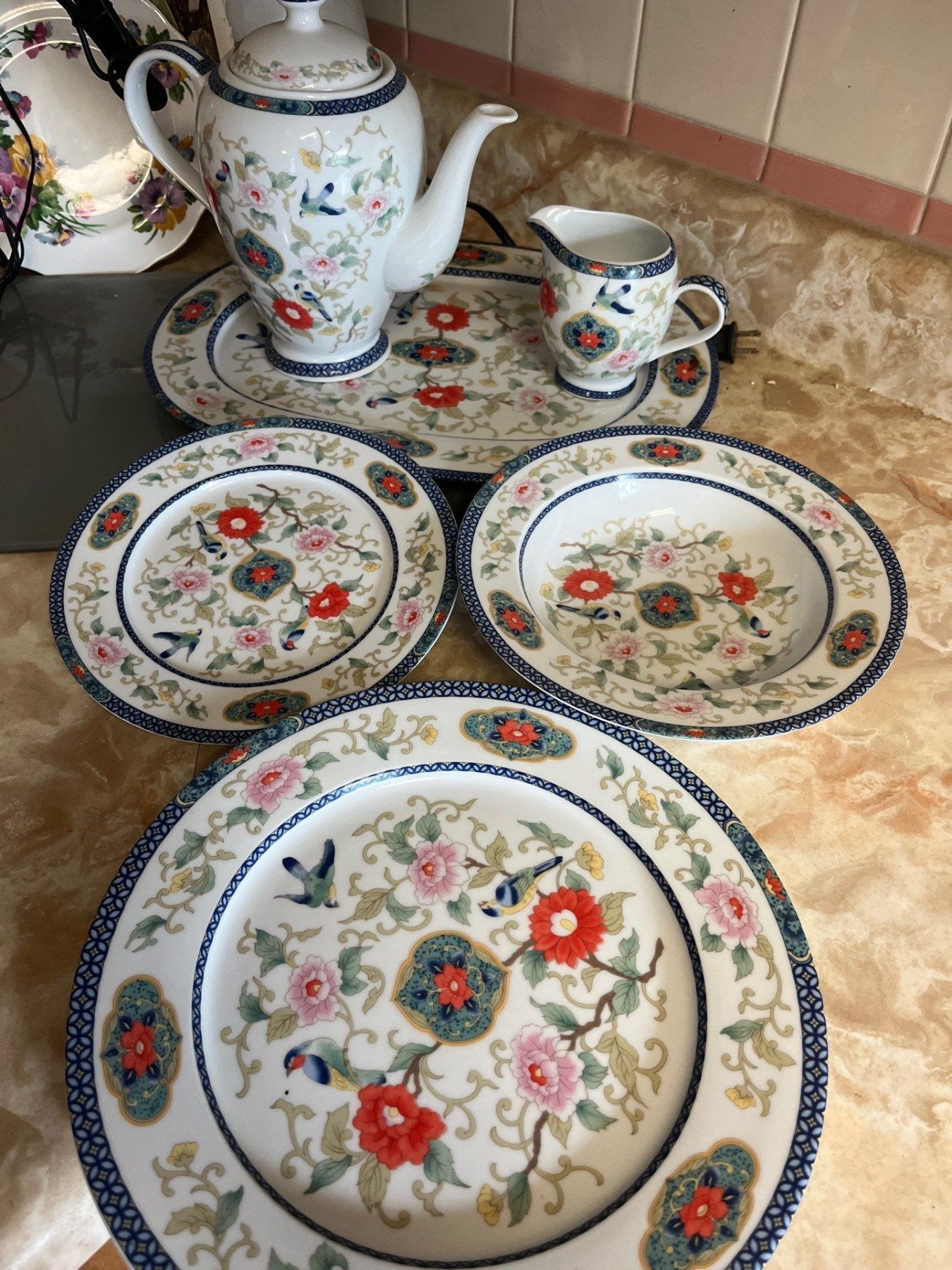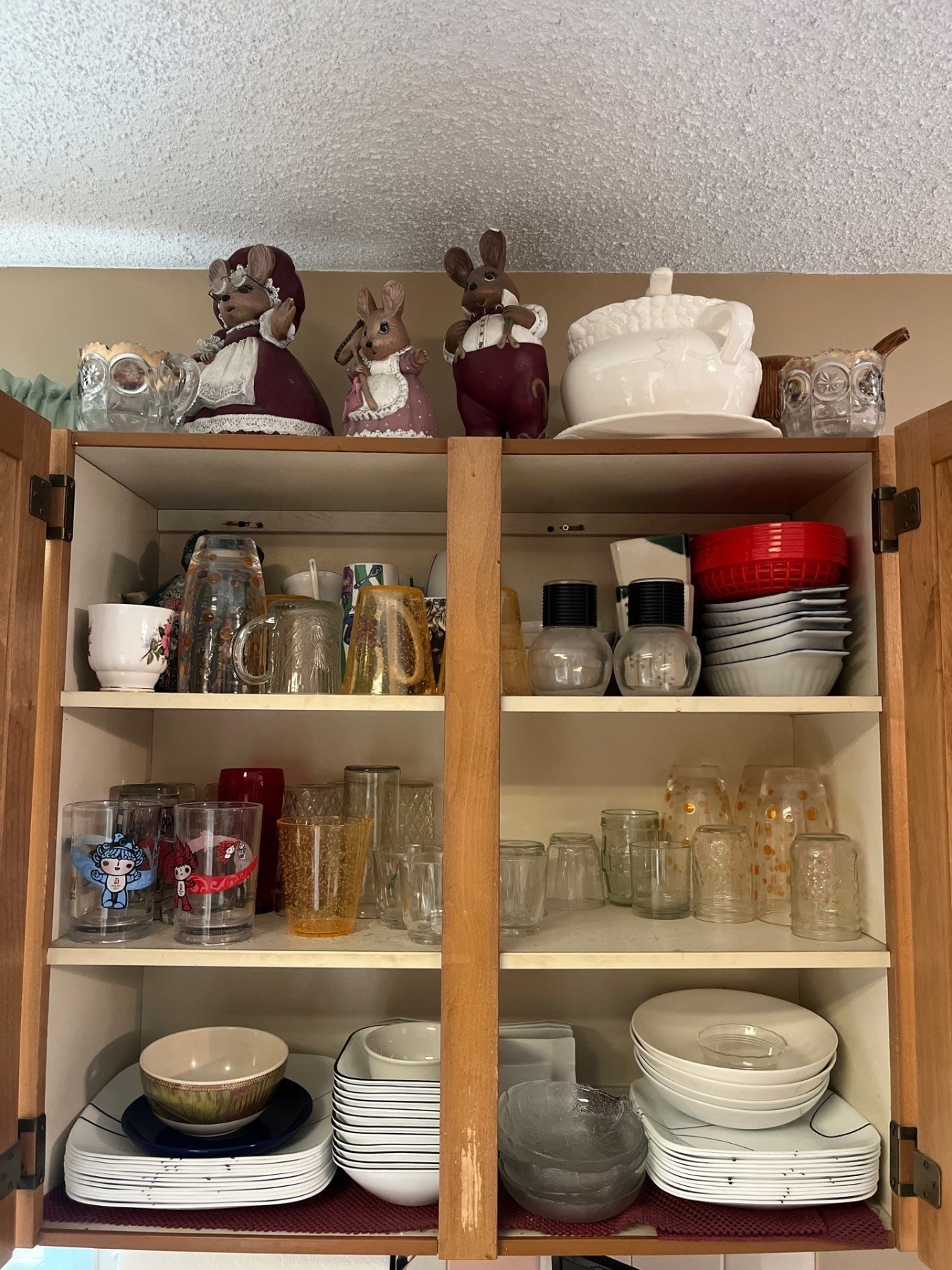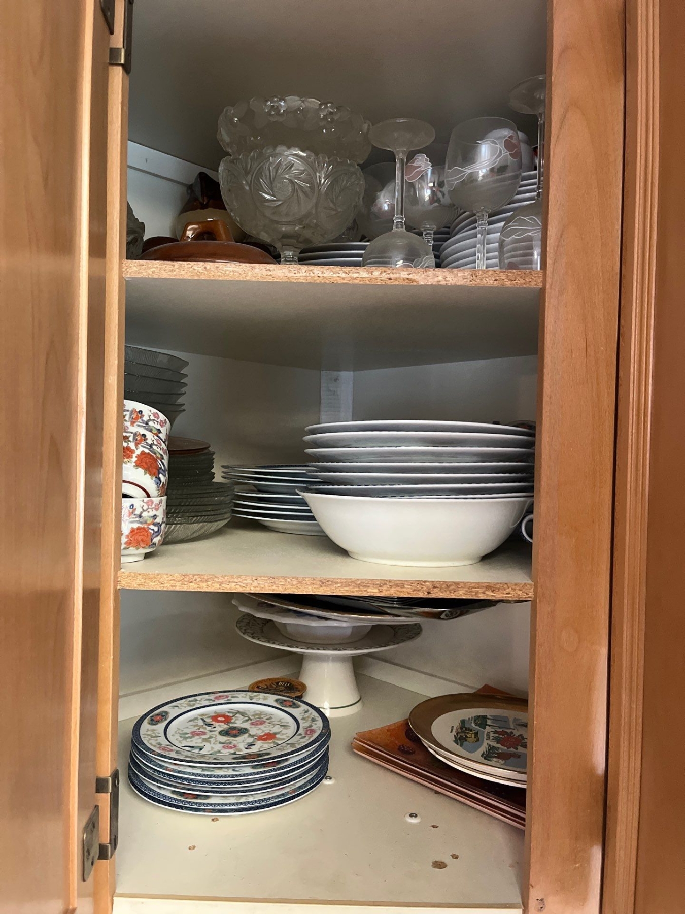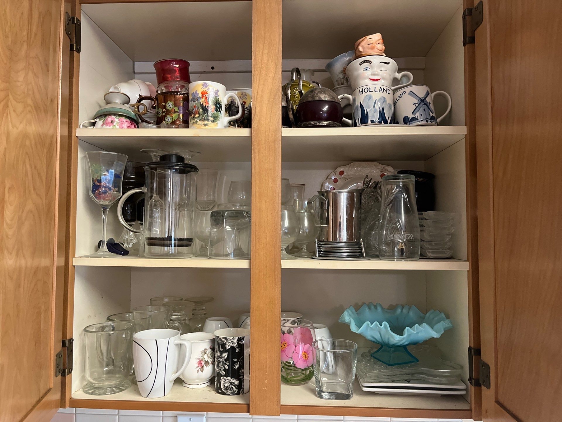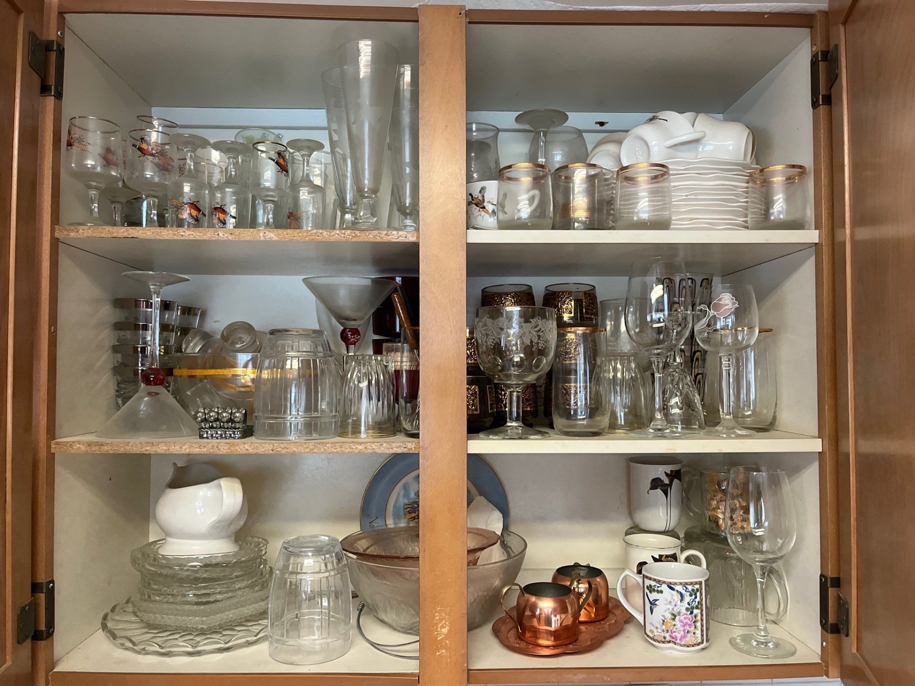 All Contents Of Upper Kitchen Cupboards. Including A Set Of 8 Royal Traditions Ming Dynasty Fine Porcelain. Contains Serving Dishes, Pie Plate, Tea Cups And Teapot. Along With Several Retro Glassware Sets. Also Including Corelle Sets, Sunbeam Mixer, Salton Milkshake Mixer. Buyer Must Bring Boxes To Load it Out