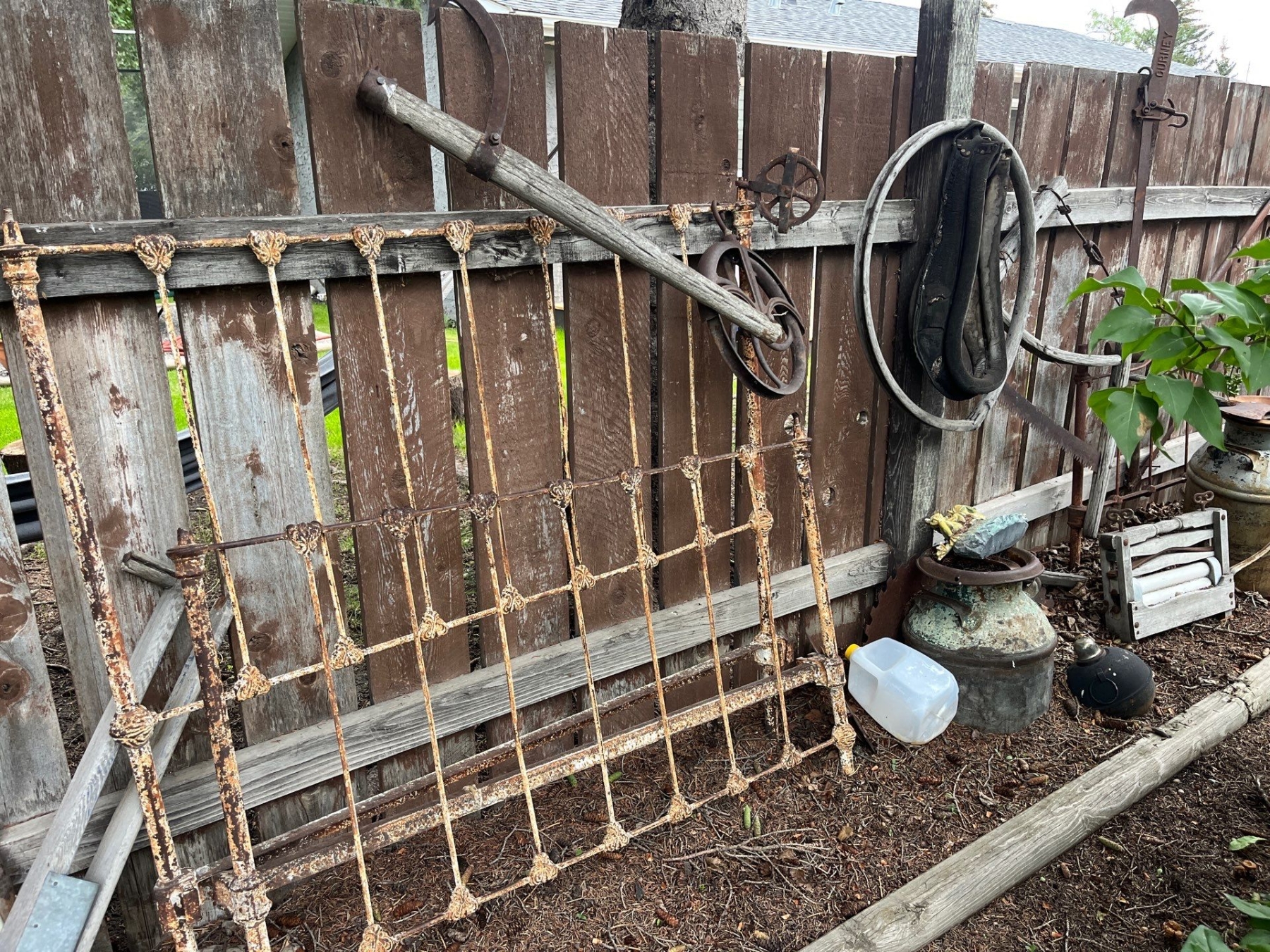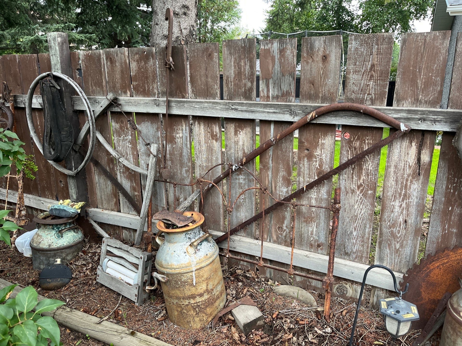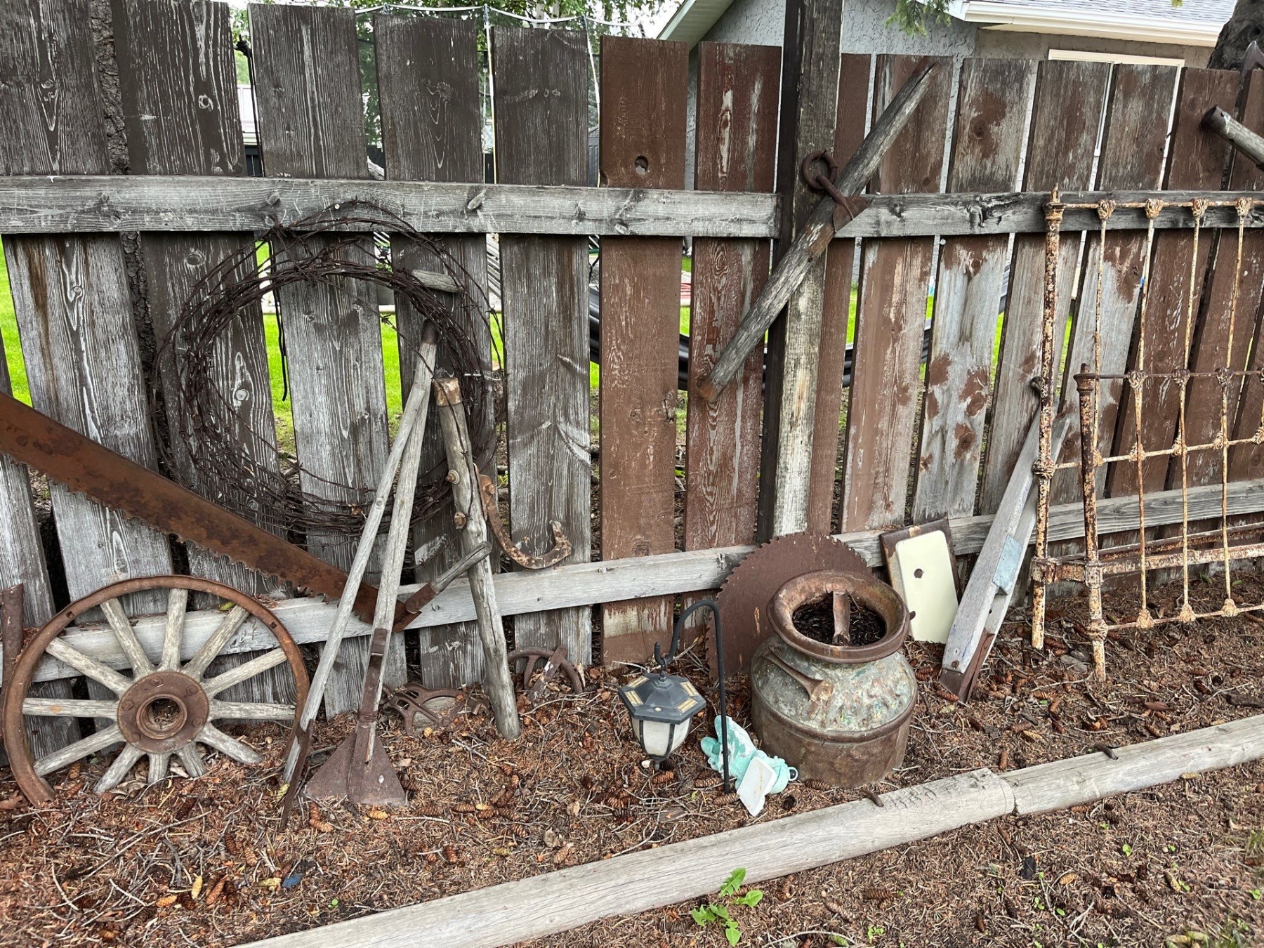 All backyard, decorations, saw blades, saws, antique milk, jugs, wagon, wheels, and another decorative items Buyer must Pick Up No Delivery