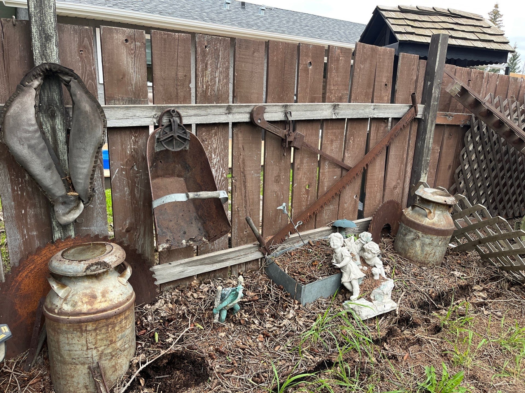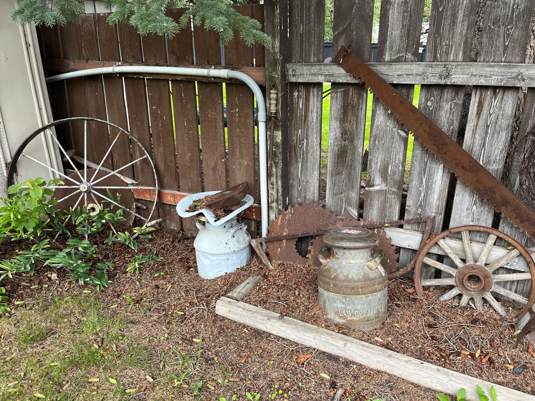 All backyard, decorations, saw blades, saws, antique milk, jugs, wagon, wheels, and another decorati