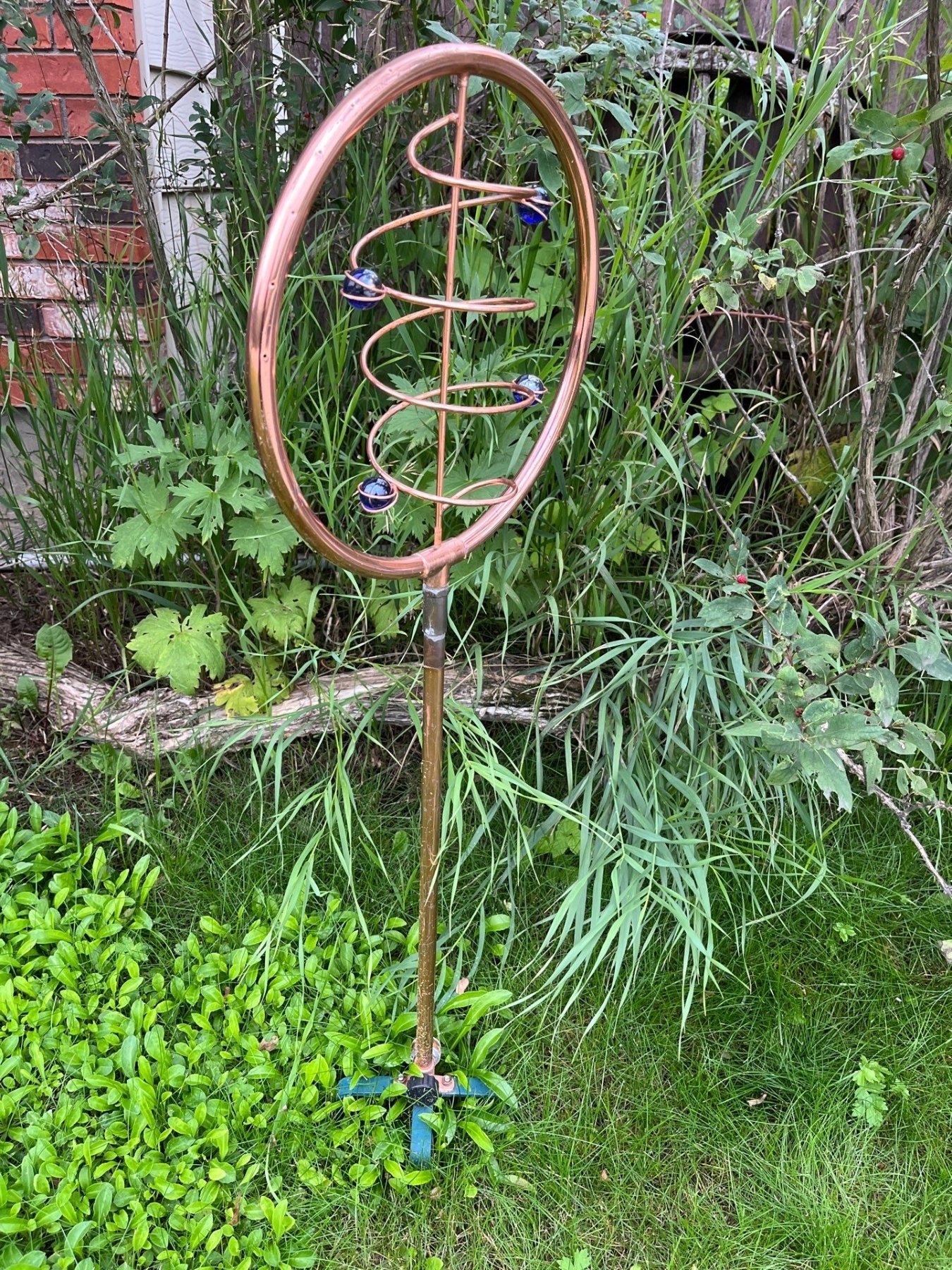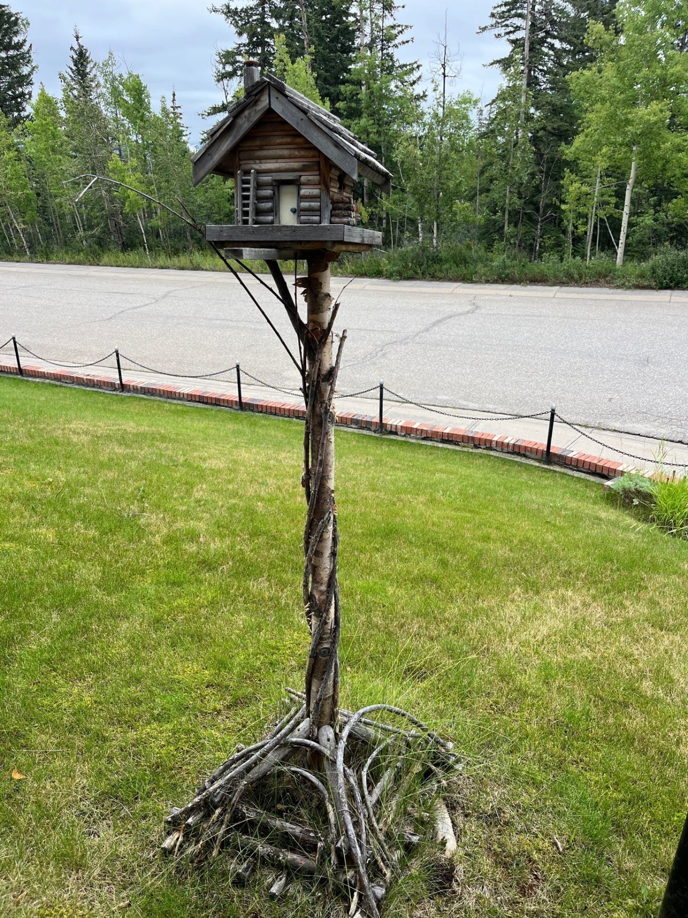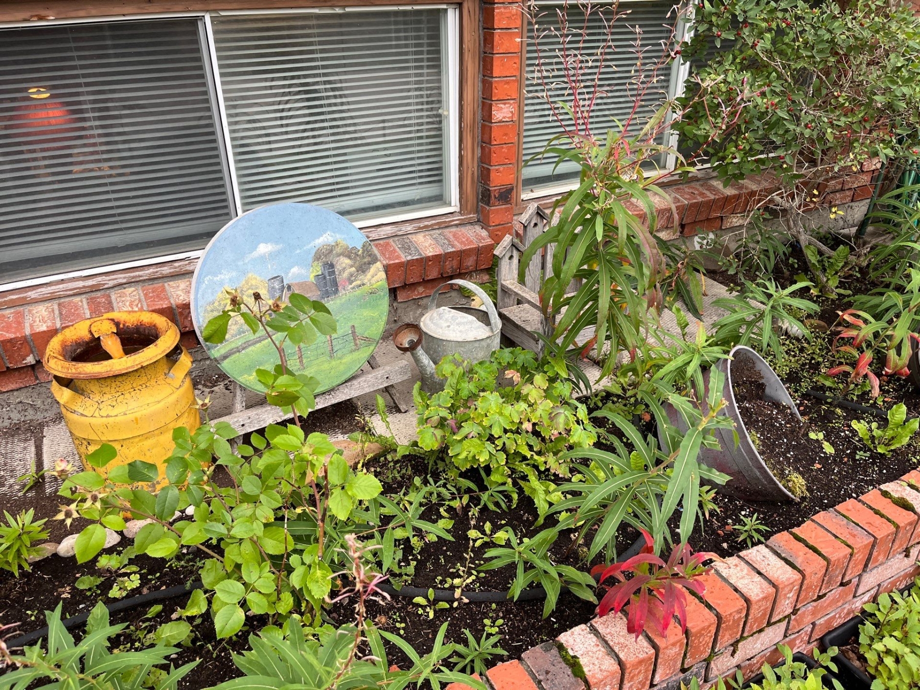 All front yard, lawn, ornaments, saw blades, milk, cans, wagon, wheels, sprinklers, and a birdhouse and a little red waggon