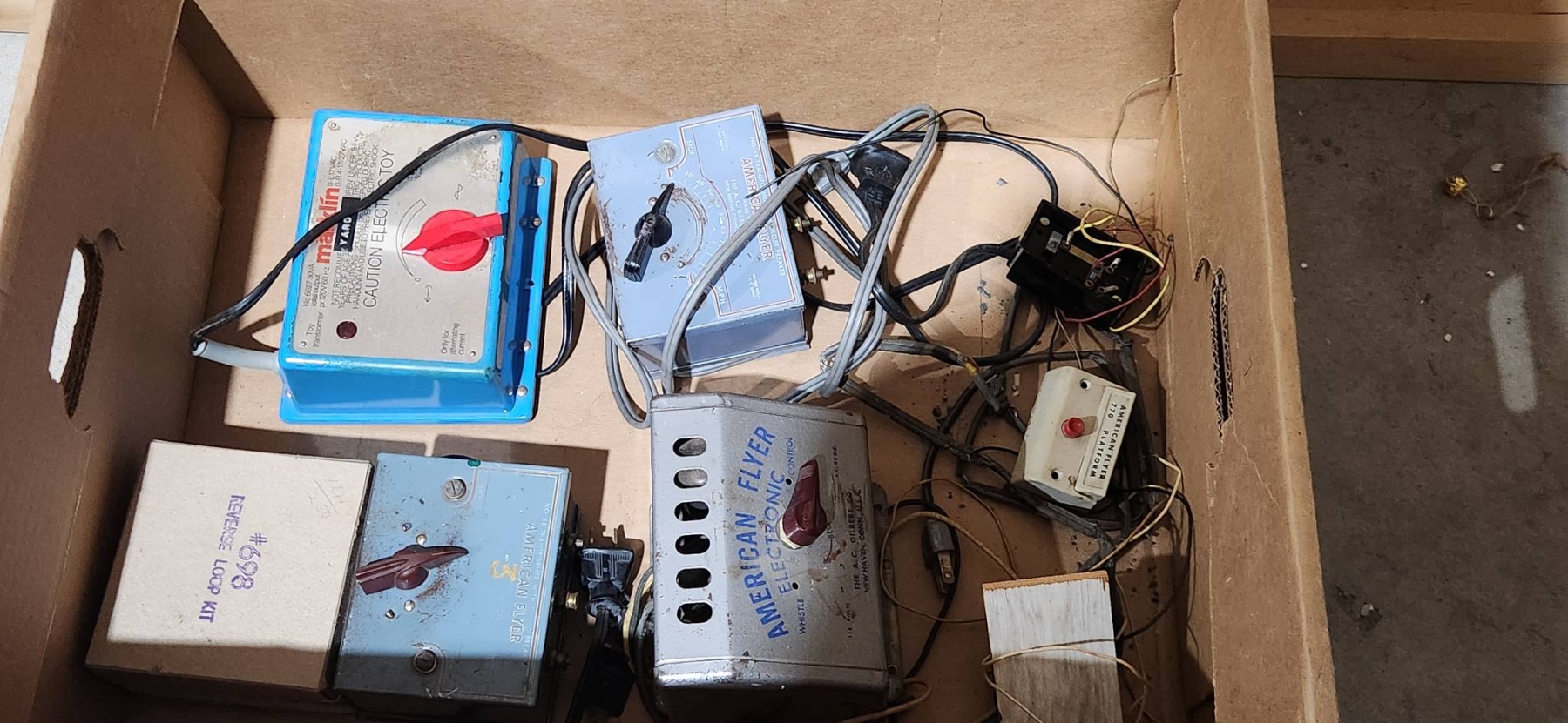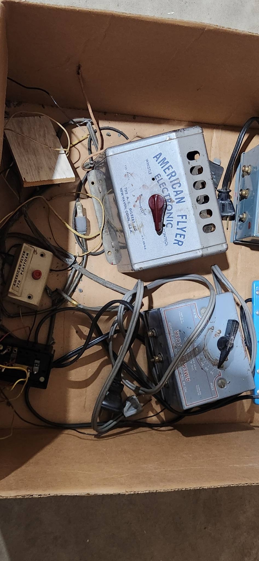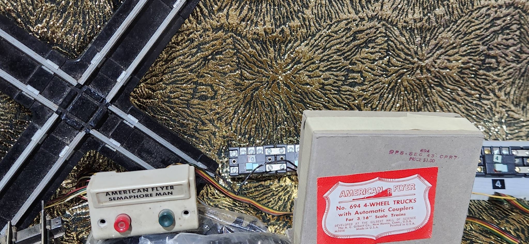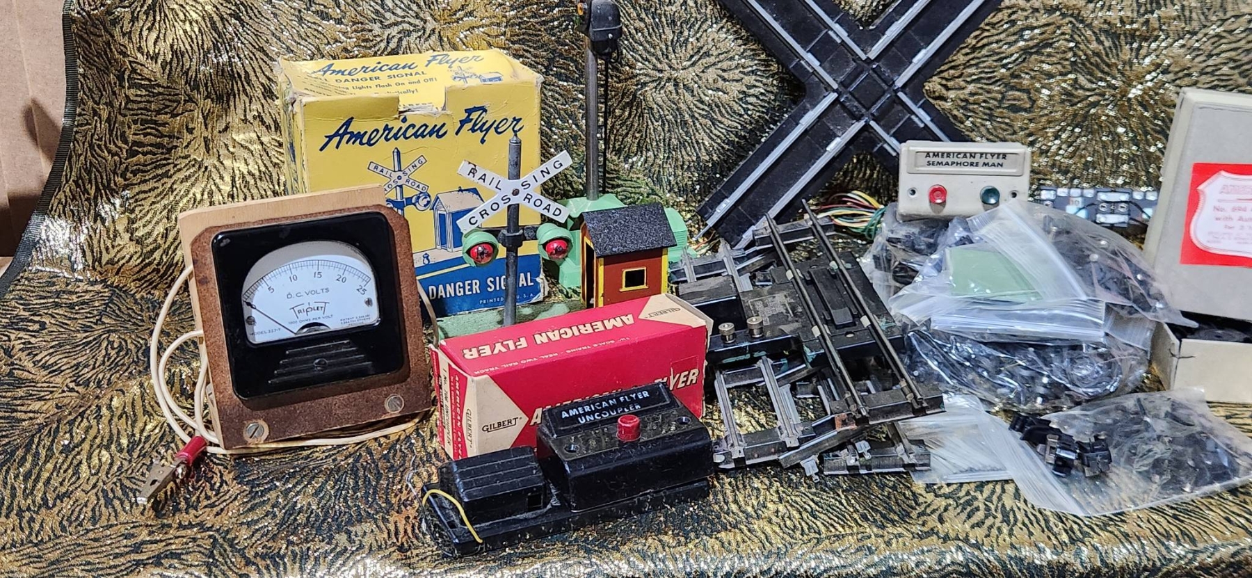 This is a notable collection of American Flyer model railroad items, ideal for enthusiasts or collectors. | | | Included are several vintage pieces such as a Rail Crossing Signal (approx. 6" tall, 8" wide), a No. 702 4-Wheel Trucks Coupler Kit, Reverse Loop Kit, track sections, and multiple transformers and electrical components. | | | Additional items include original paperwork, signal systems, and a control board (approx. 24" long), offering the opportunity to expand a model rail system with authentic parts. | | | These components are well-suited to integrate into an American Flyer model train setup.