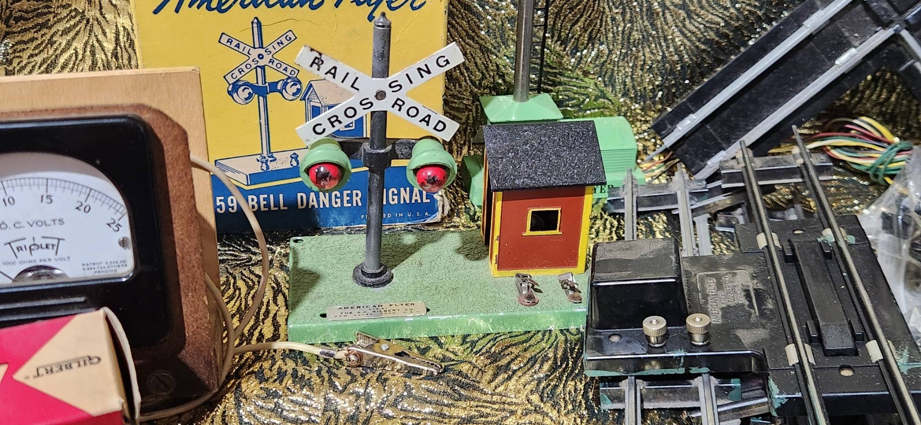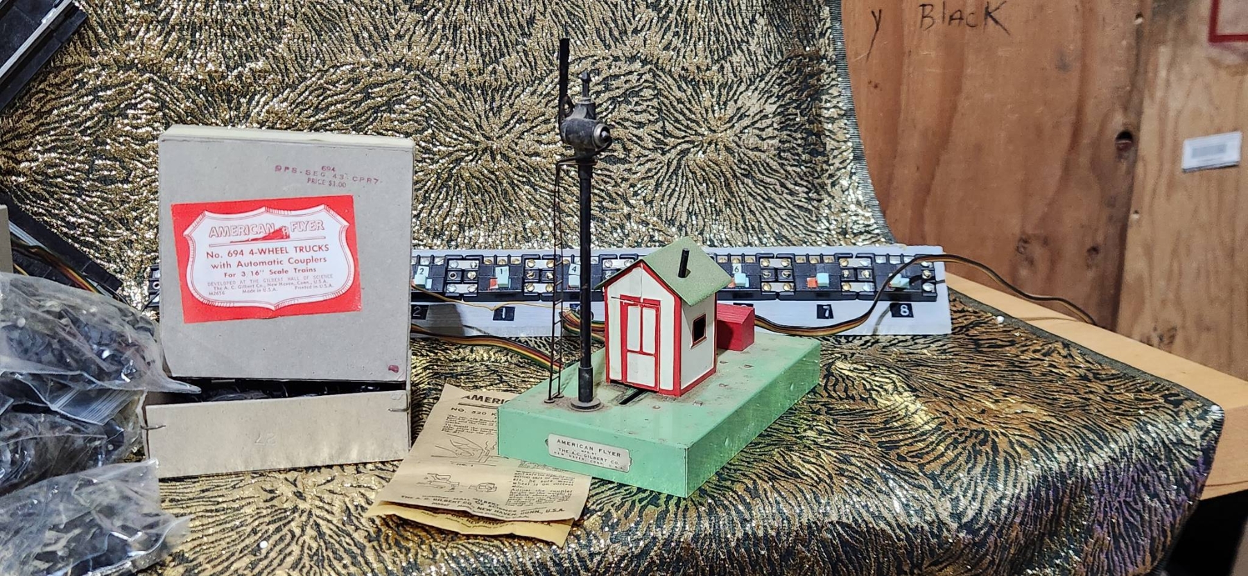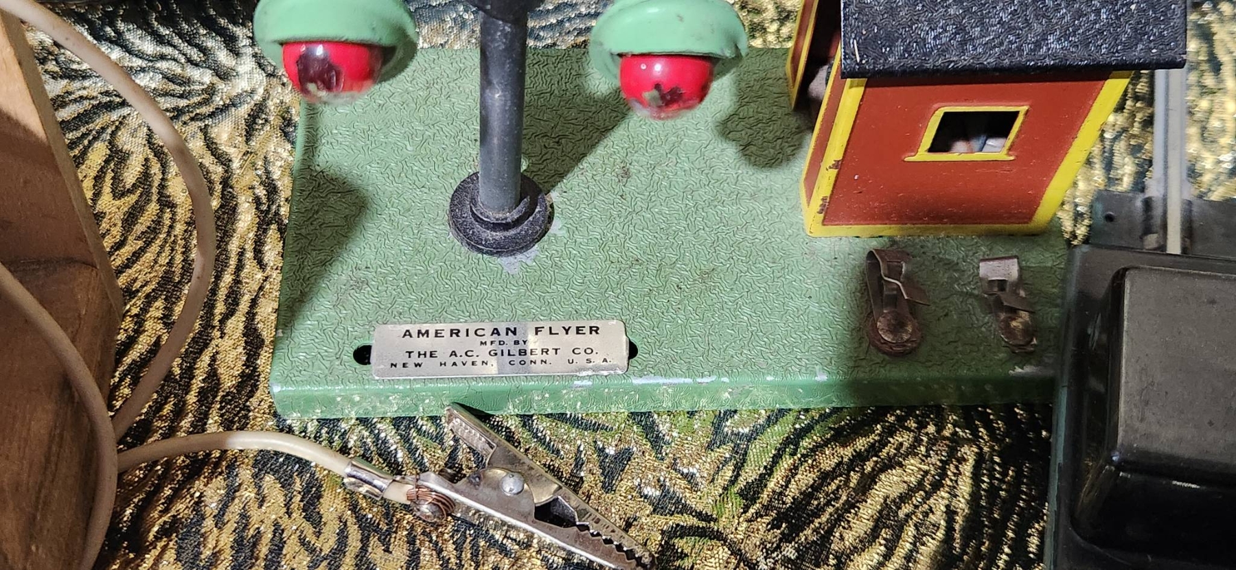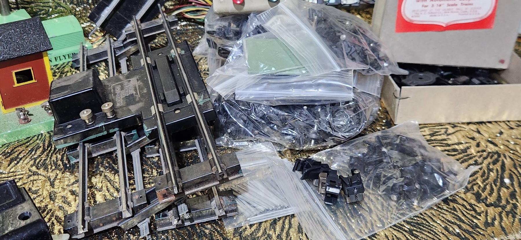 This is a notable collection of American Flyer model railroad items, ideal for enthusiasts or collectors. | | | Included are several vintage pieces such as a Rail Crossing Signal (approx. 6" tall, 8" wide), a No. 702 4-Wheel Trucks Coupler Kit, Reverse Loop Kit, track sections, and multiple transformers and electrical components. | | | Additional items include original paperwork, signal systems, and a control board (approx. 24" long), offering the opportunity to expand a model rail system with authentic parts. | | | These components are well-suited to integrate into an American Flyer model train setup.