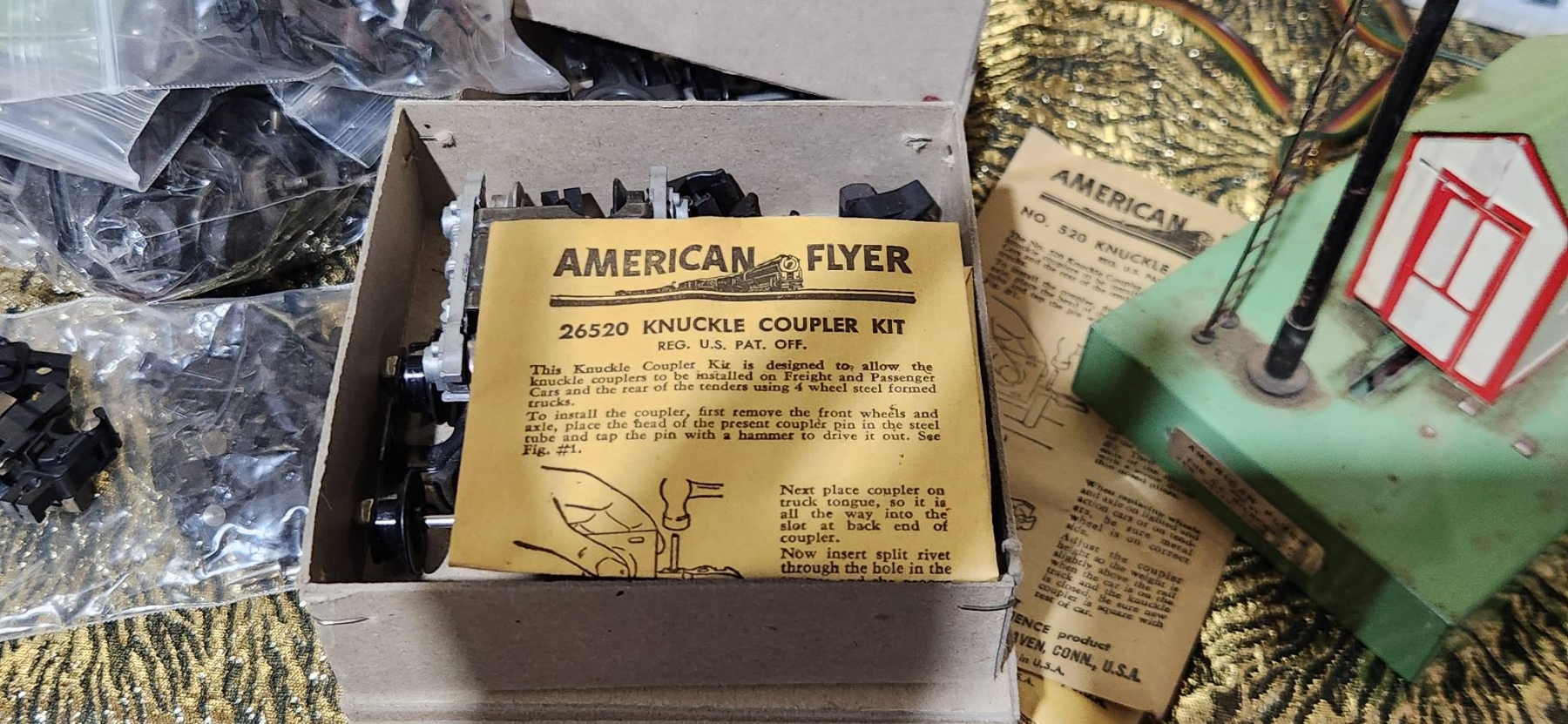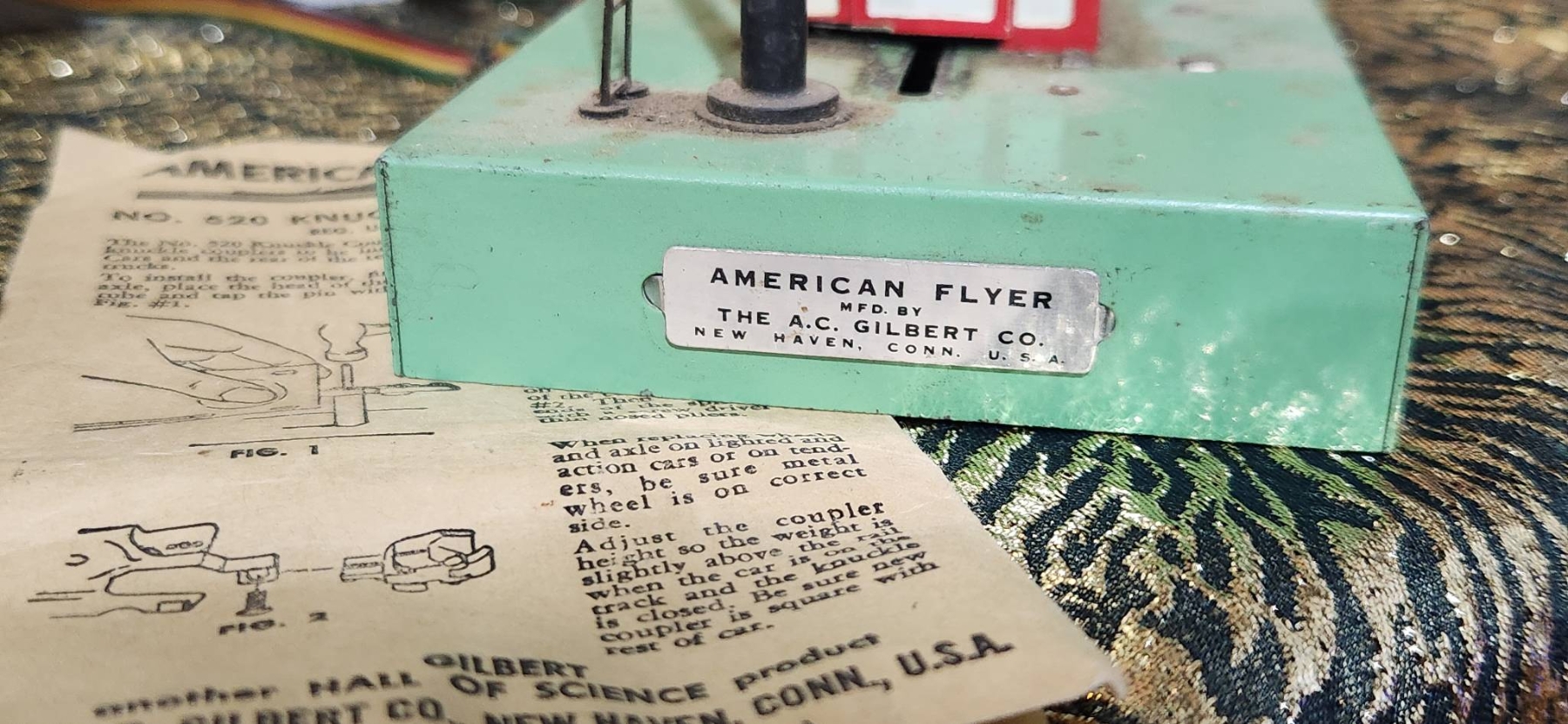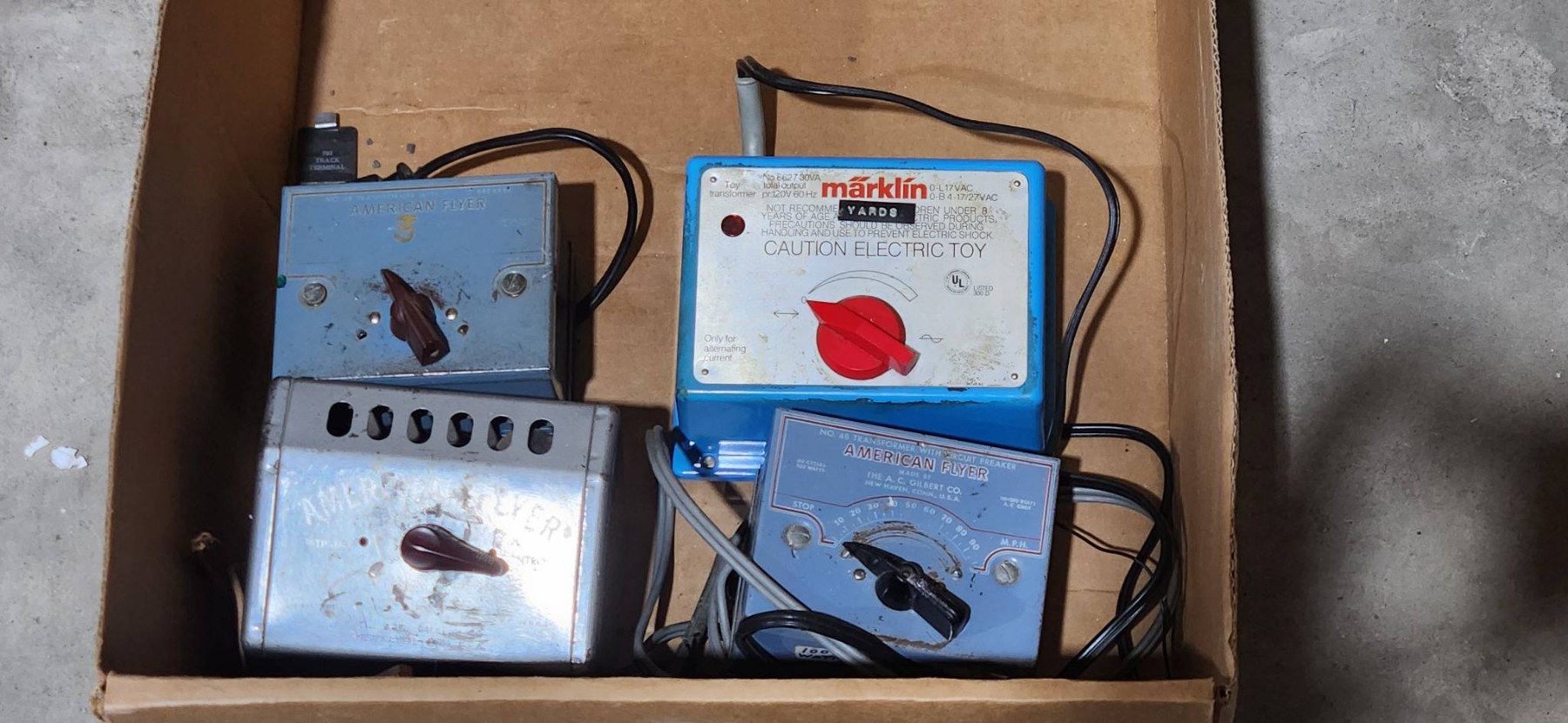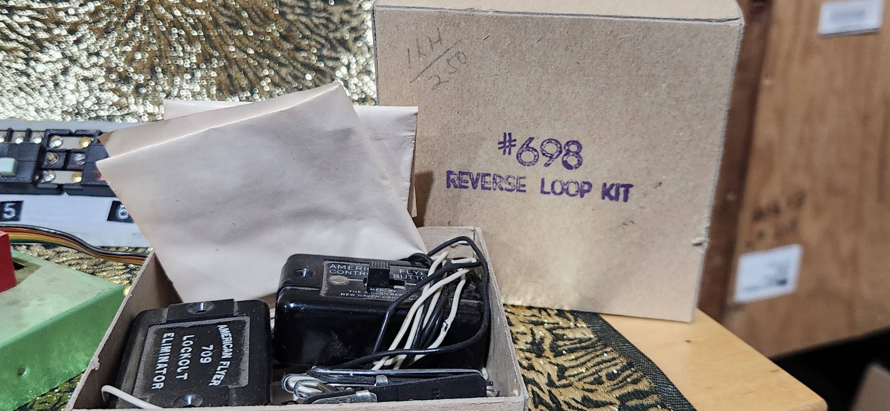 This is a notable collection of American Flyer model railroad items, ideal for enthusiasts or collectors. | | | Included are several vintage pieces such as a Rail Crossing Signal (approx. 6" tall, 8" wide), a No. 702 4-Wheel Trucks Coupler Kit, Reverse Loop Kit, track sections, and multiple transformers and electrical components. | | | Additional items include original paperwork, signal systems, and a control board (approx. 24" long), offering the opportunity to expand a model rail system with authentic parts. | | | These components are well-suited to integrate into an American Flyer model train setup.