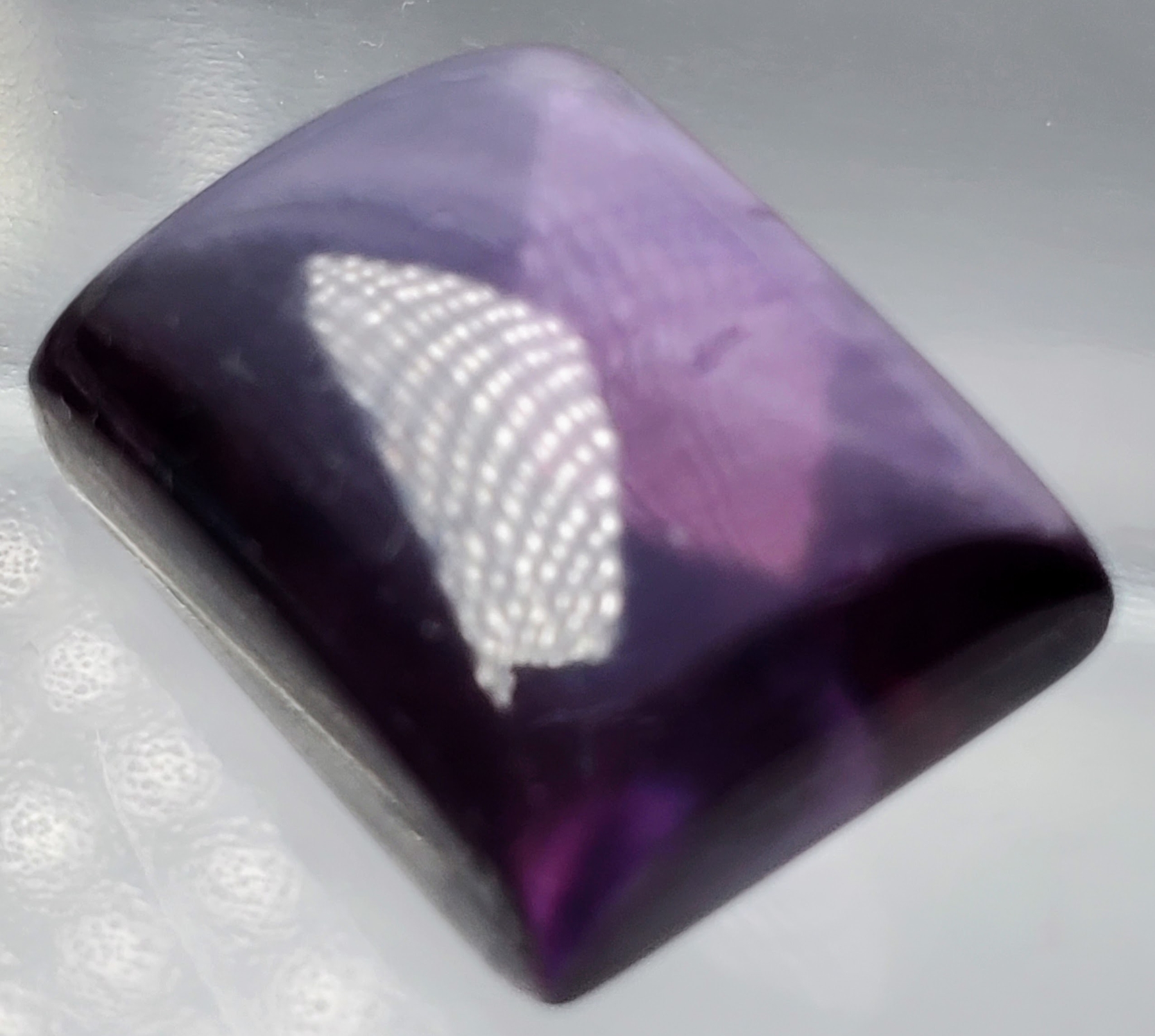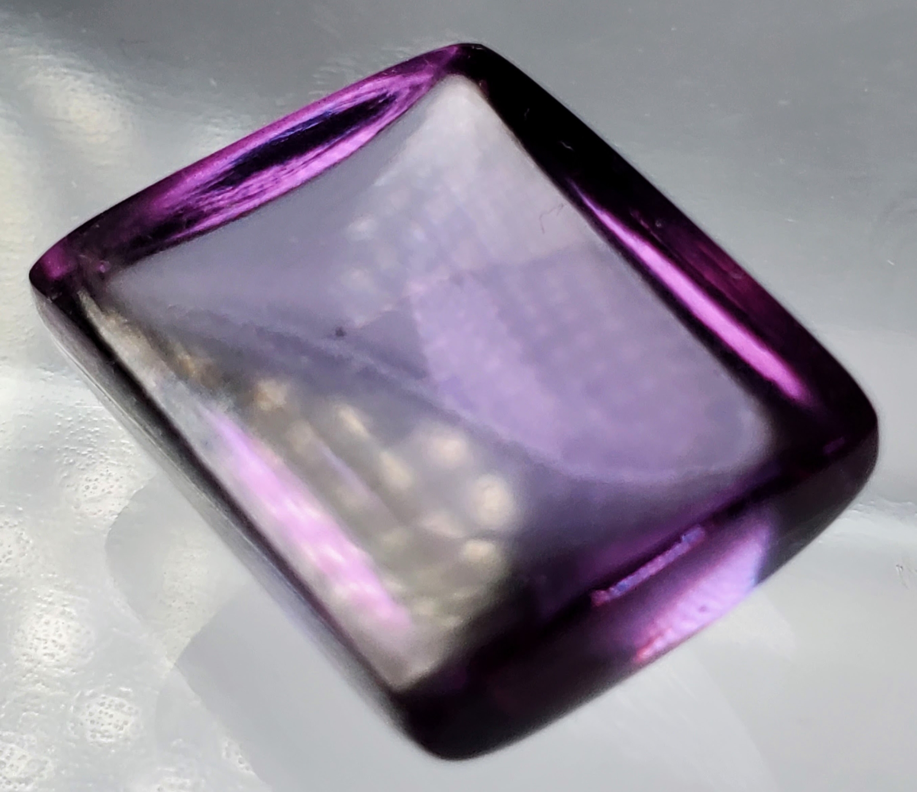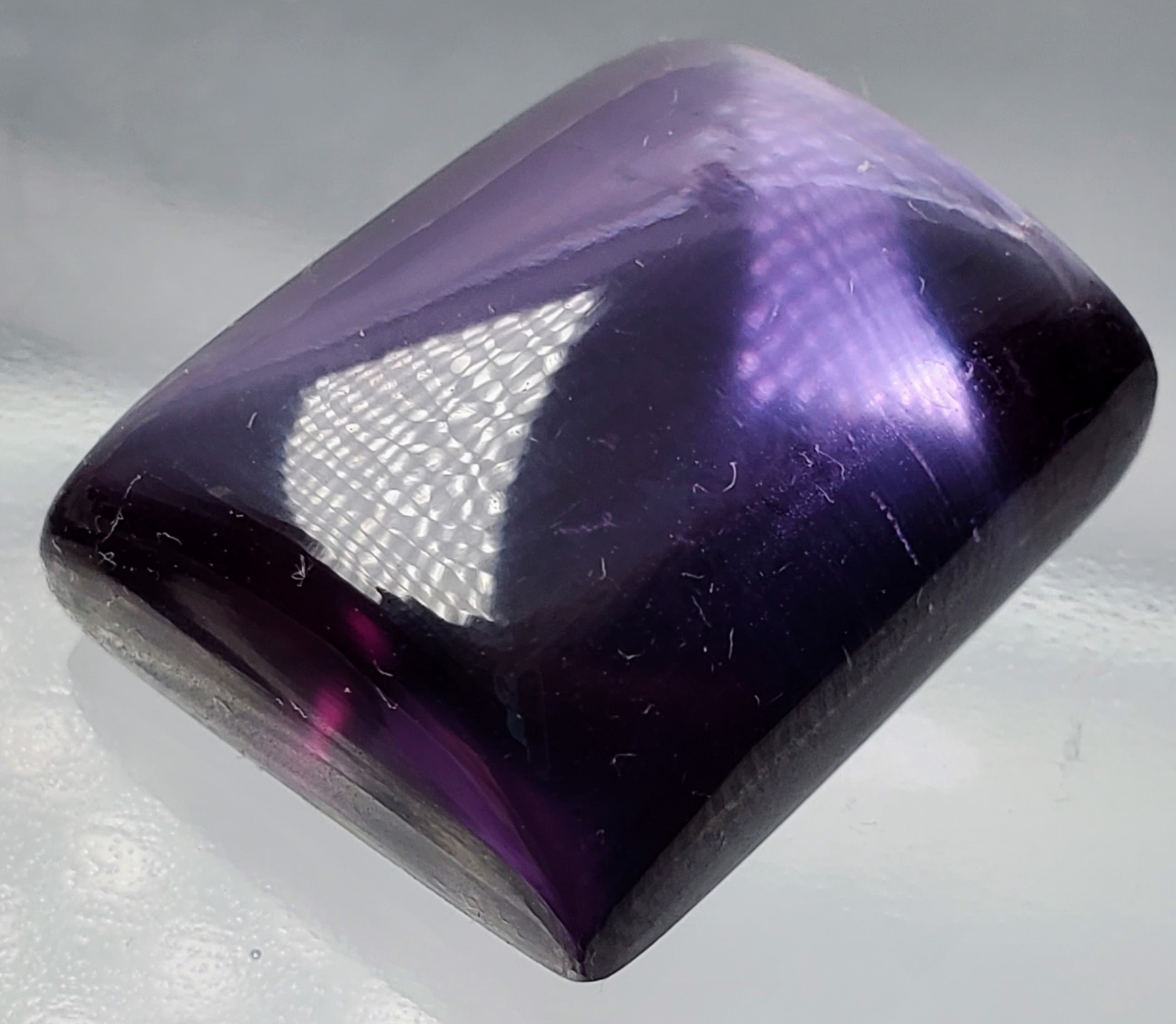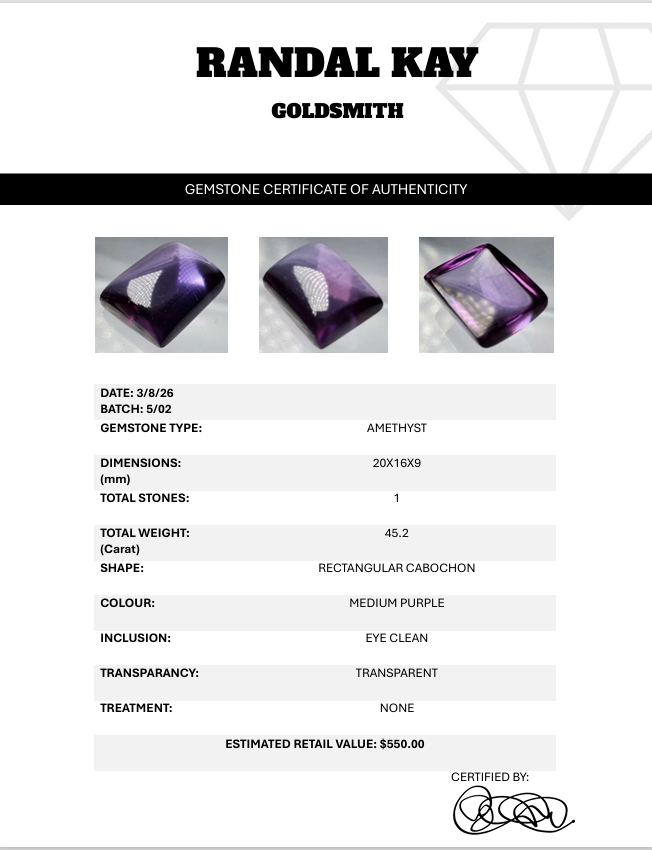A 45.2-carat medium-purple amethyst cabochon featuring transparent clarity, smooth rectangular dome, and strong color. Untreated and eye-clean, it provides impressive size and visual impact. Estimated retail price is $550.