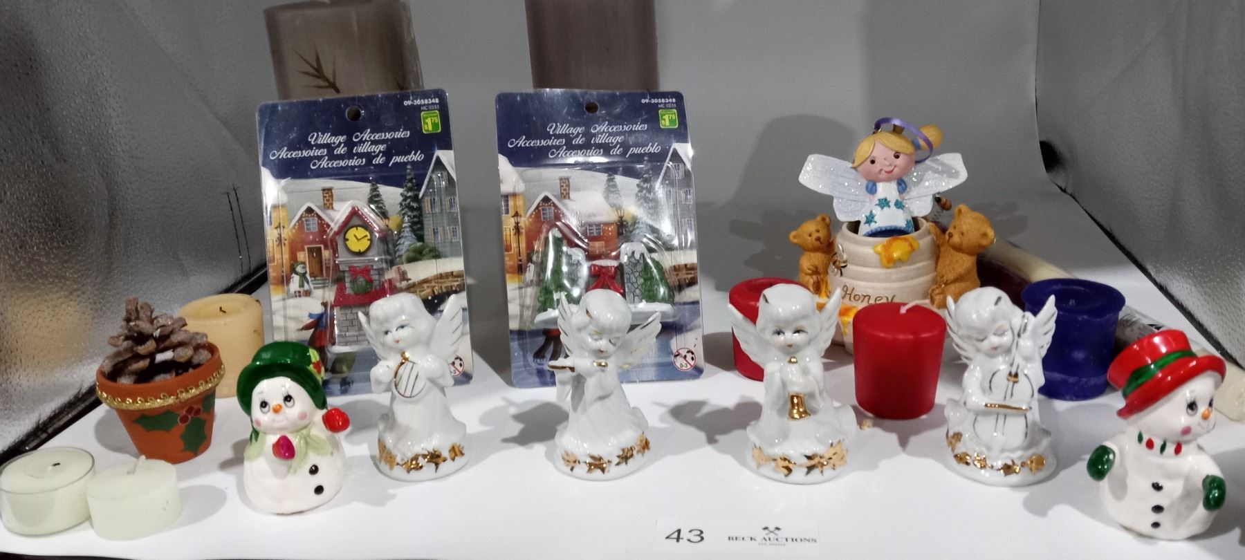 An Assortment of Xmas-Themed Ornaments/Candles; Including 4 Angel-Themed Porcelain Figurines,a Pair of Holland-Themed Wooden Shoes, 2 Porcelain Snow Men, 1 Bear/Honey-Themed Candle Holder, 6 Small Candles, 2 Tall/Thin Candels, 2 Tall/Thick Candles, 2 Village Accessories,