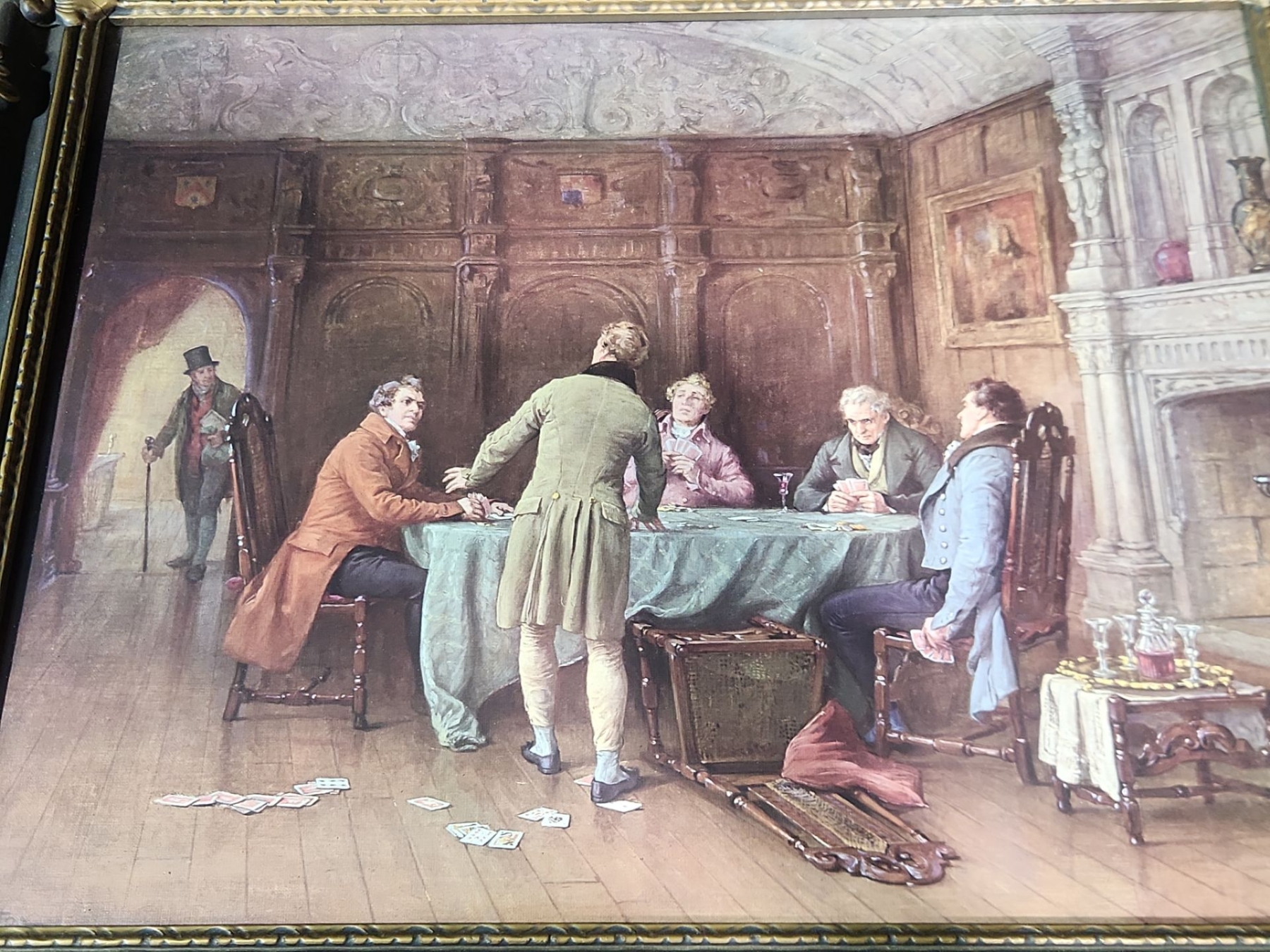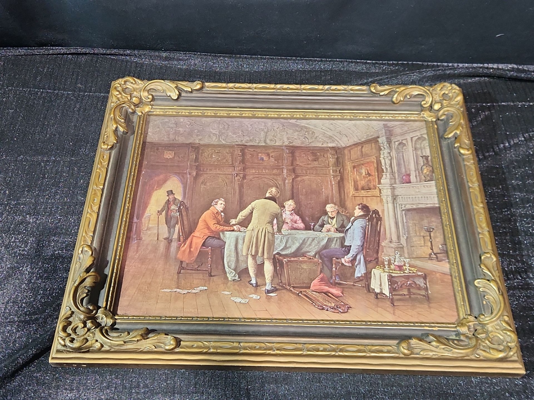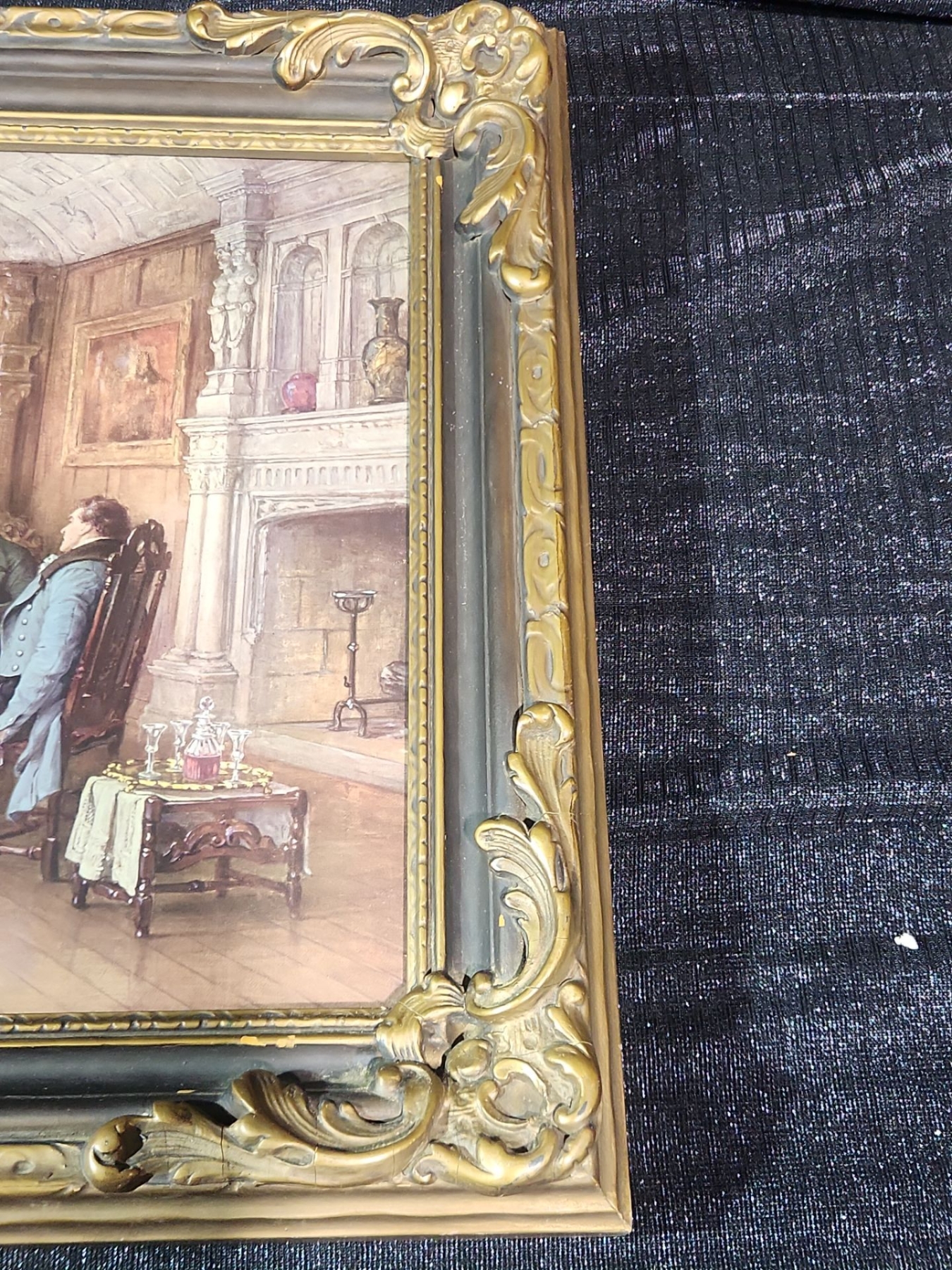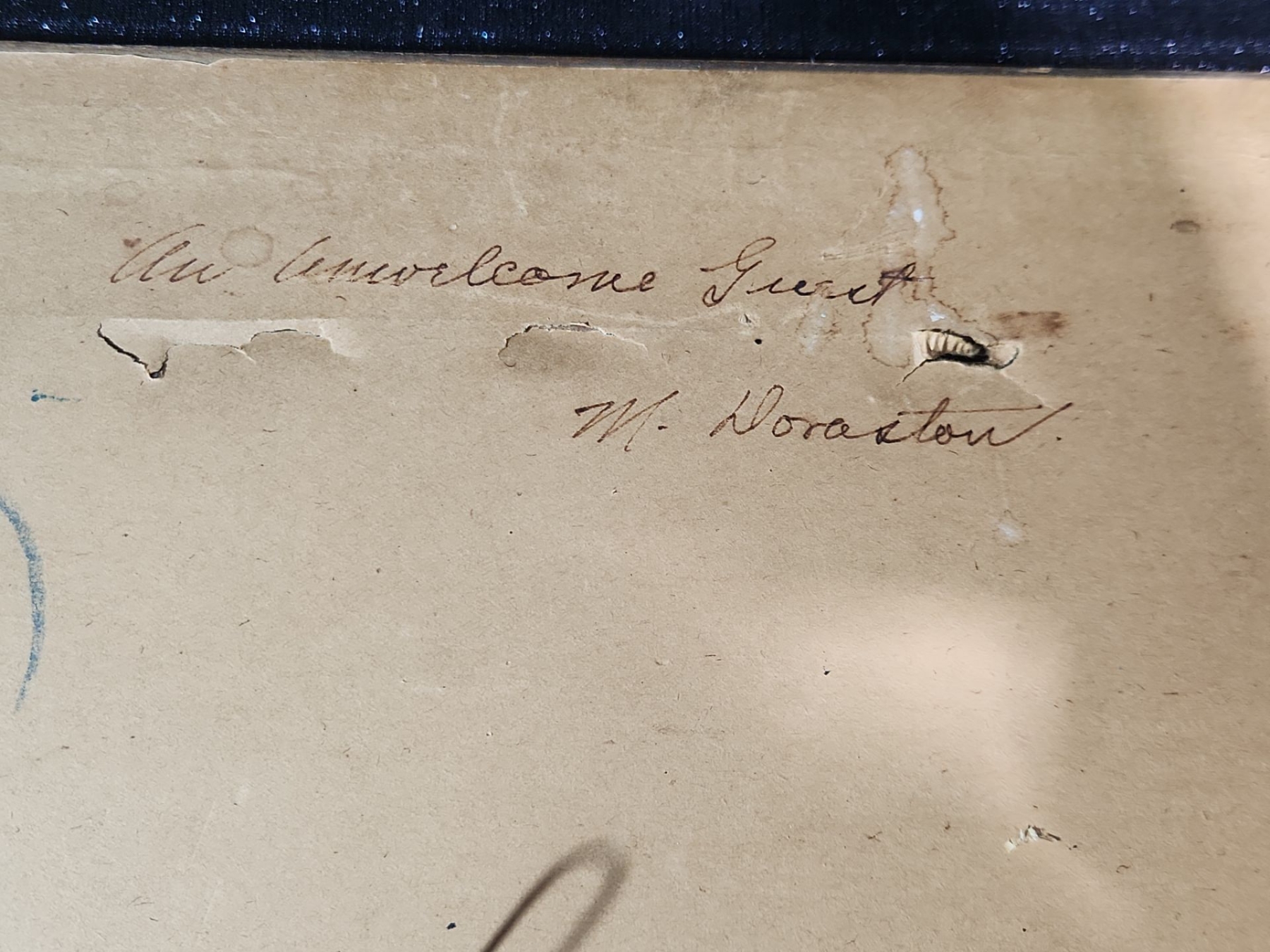This is a framed print of a painting titled " An Unwelcome Guest" by Margaret Dovaston. She's know for her detailed paintings of historical scenes and imagined English interiors.