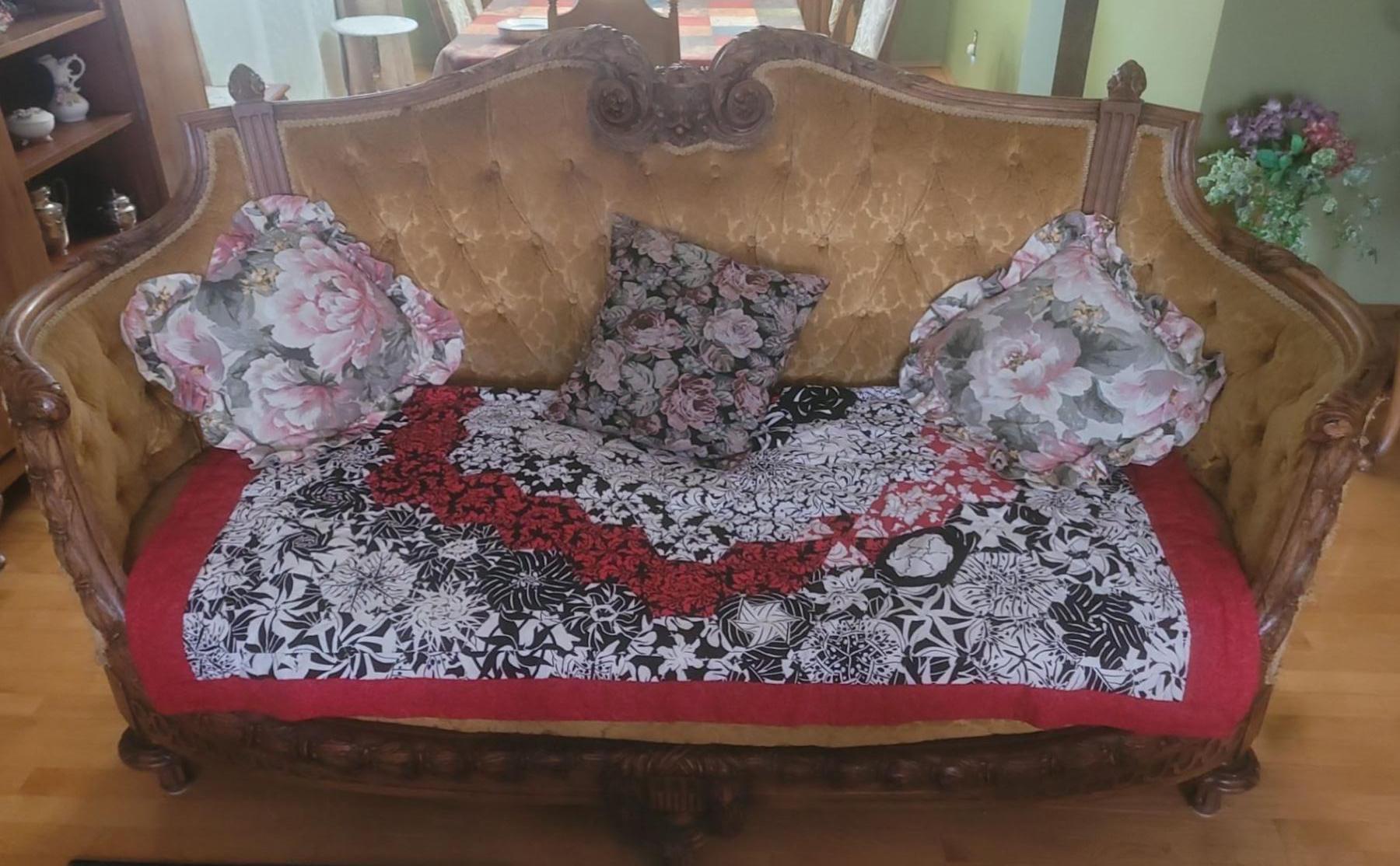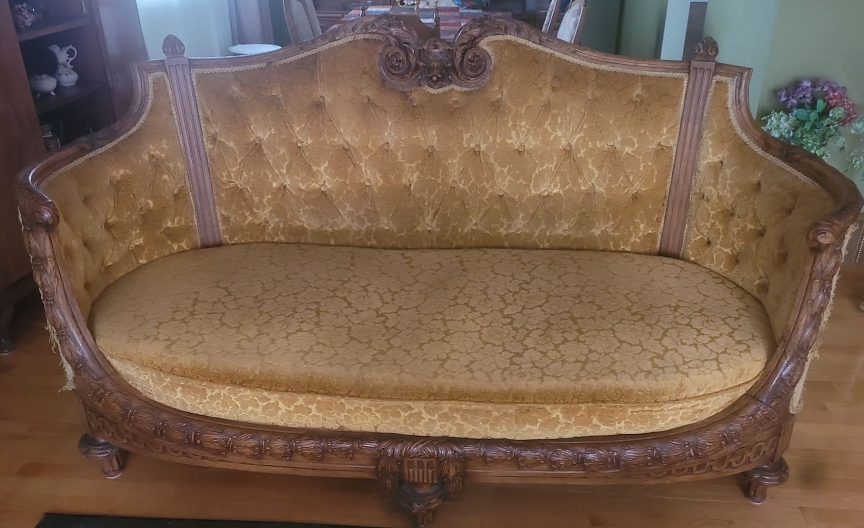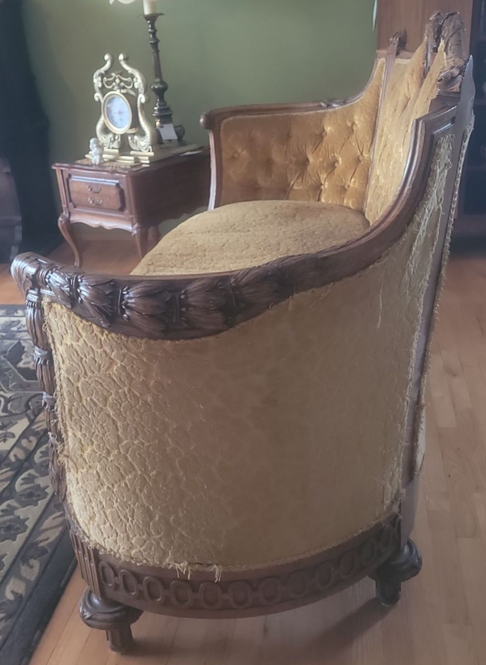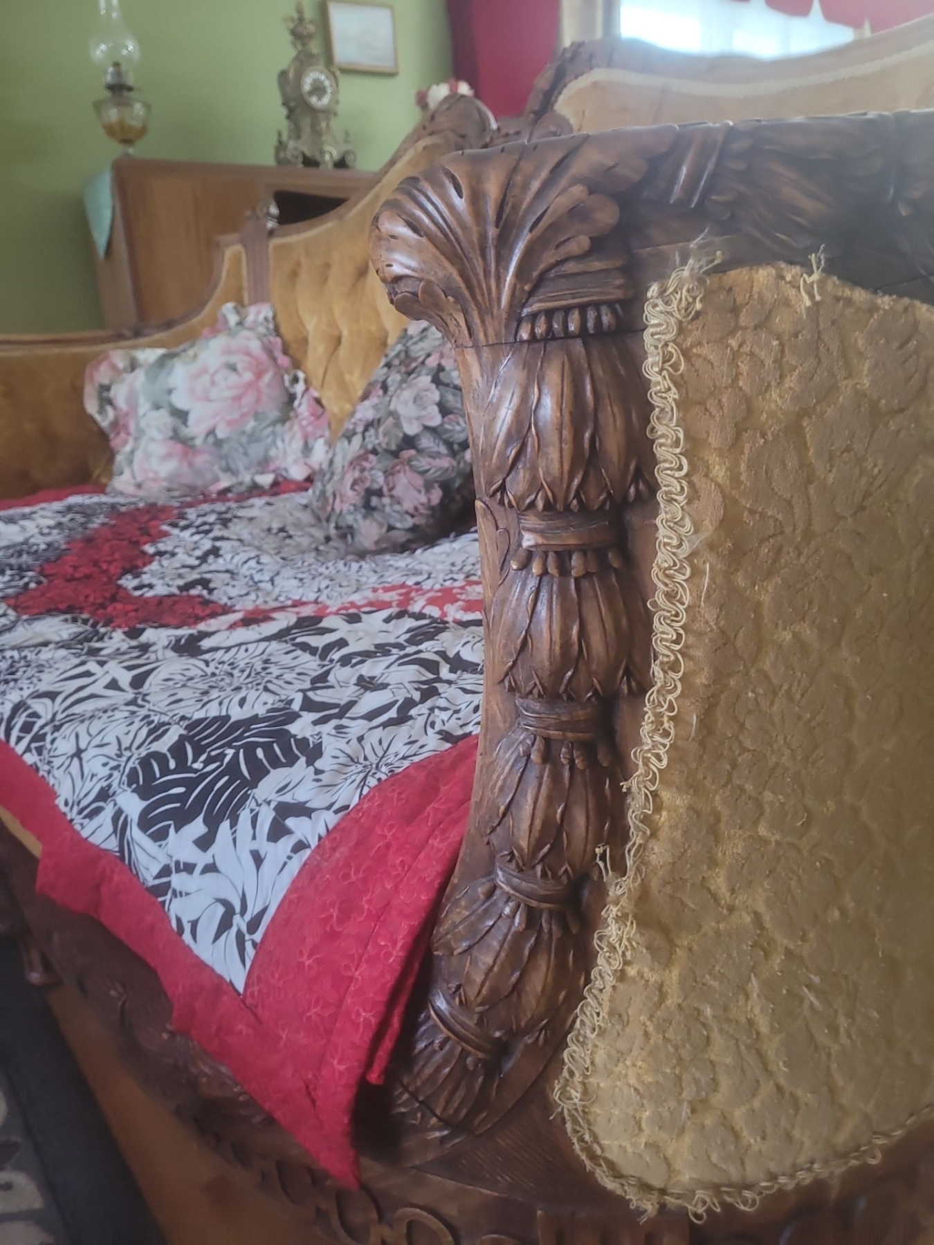 Antique 1600's Ornate Wooden & Fabric Chesterfield (Some Fraying on Fabric) - 77W, 33D, 43T