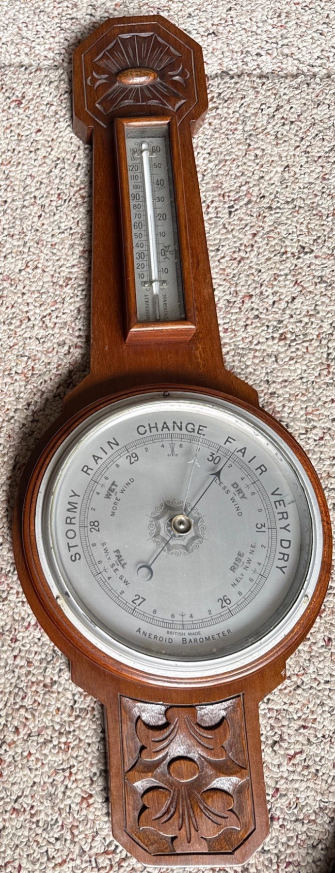 Antique Aneroid Barometer 17T w/ Western Equestrian Print & Burlwood Coin