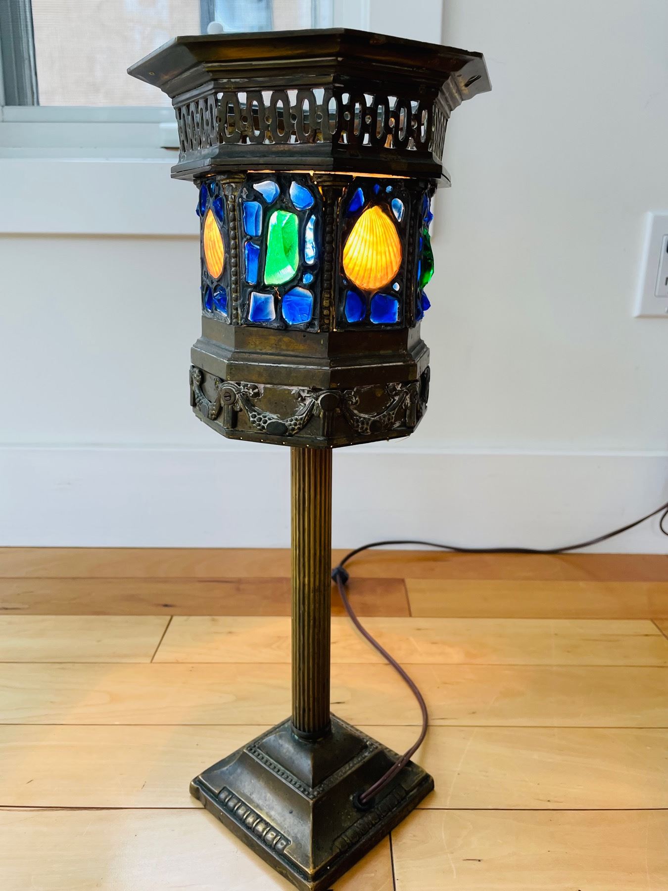 This 1930's or 40's lamp was re-wired in the 90's. It has beautiful sea glass and shell mosaic details on the lampshade. measures 17-1/4 inches tall.