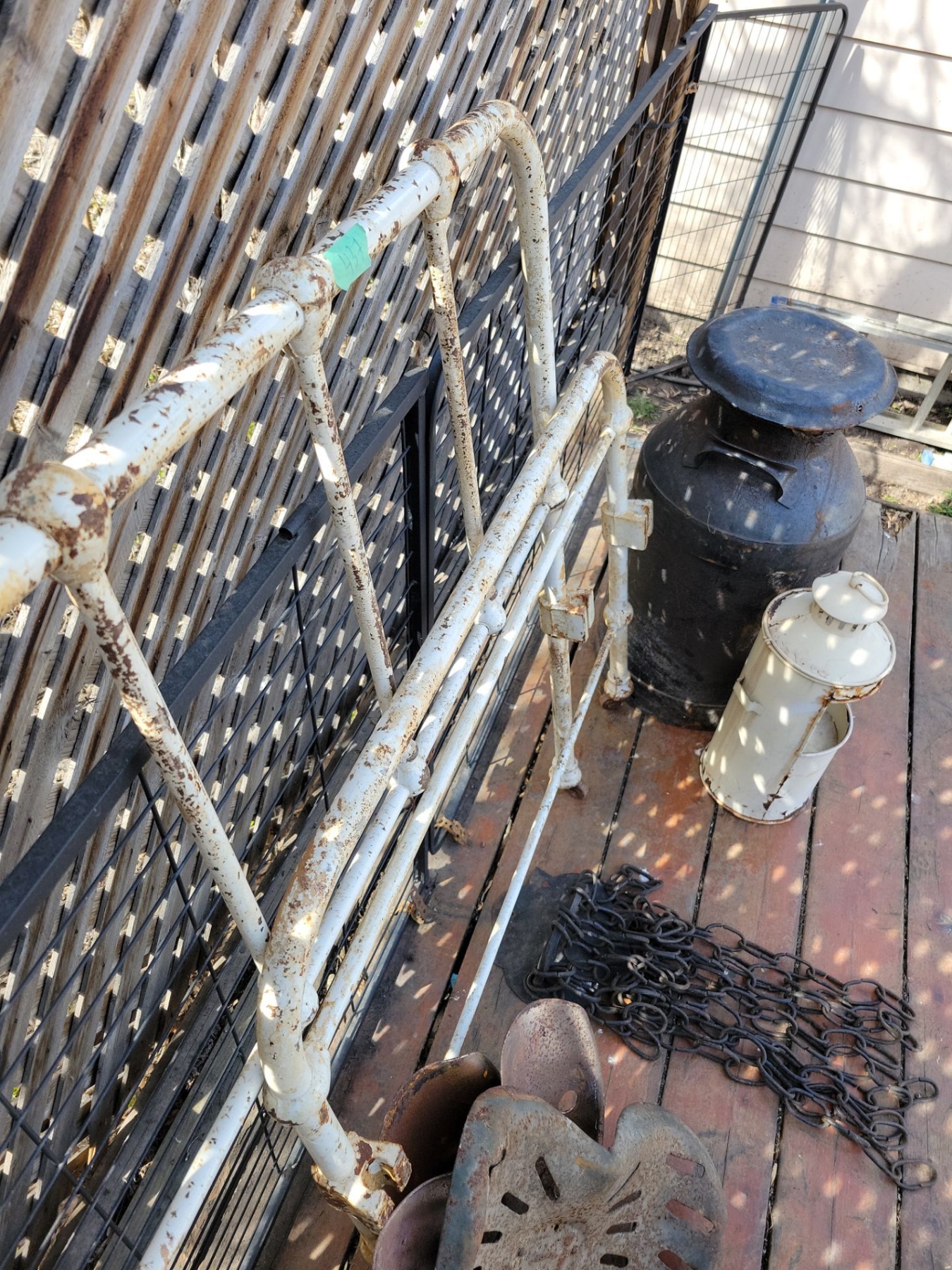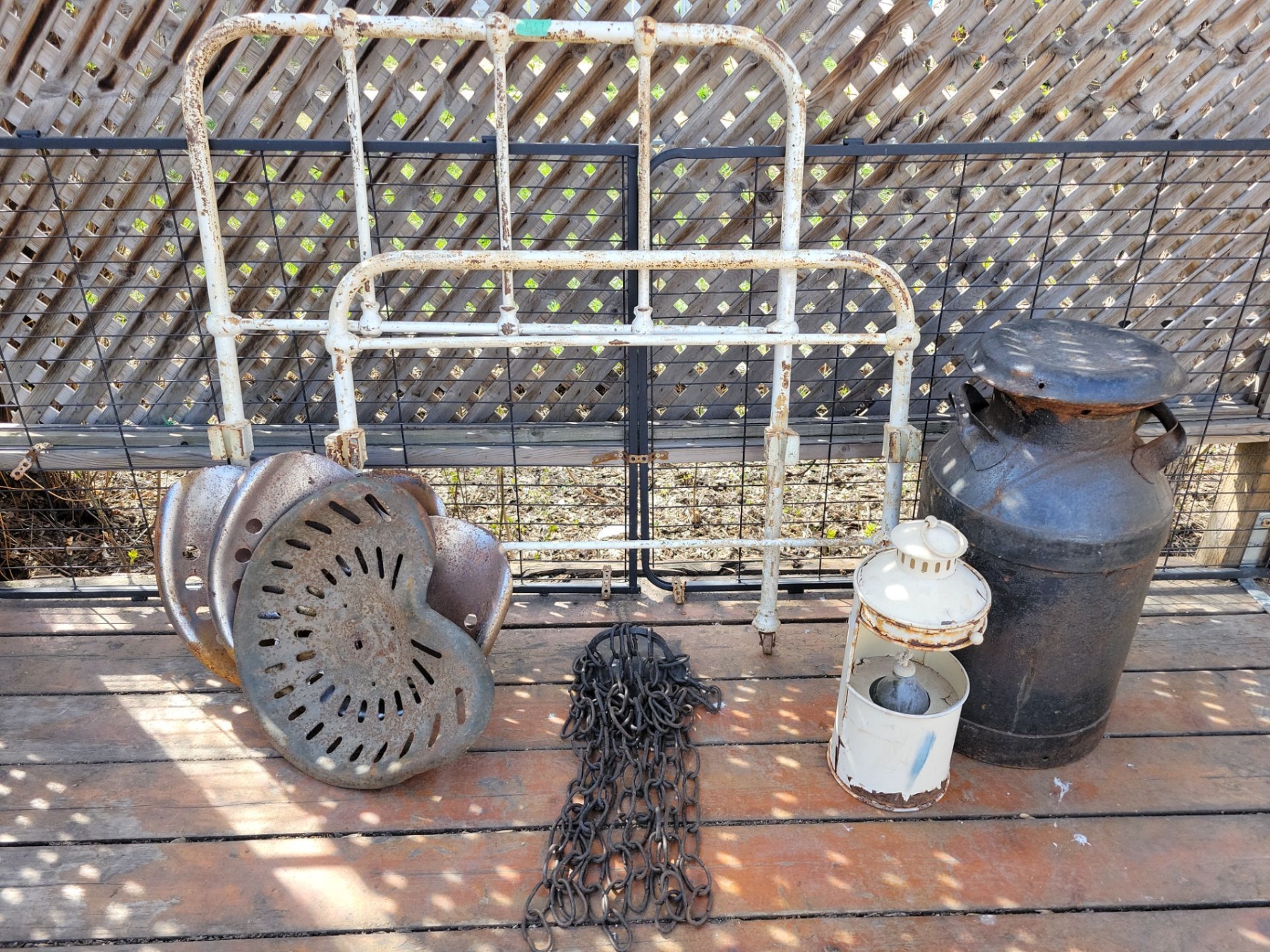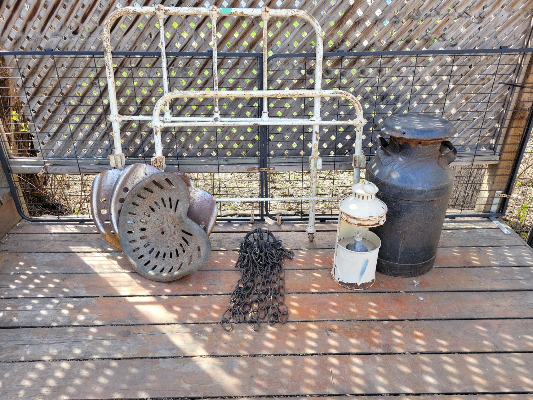 Antique Cast Iron Collection. Bed Frame, Milk Can, Tractor Seat and more.