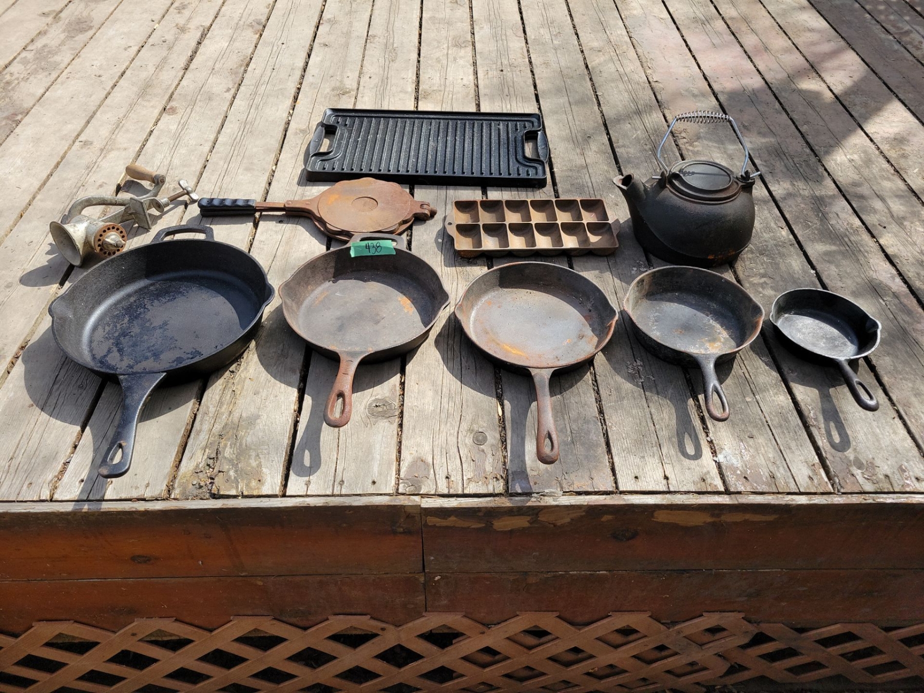 Antique Cast Iron Collection of Cookware. 5 Cast Iron Frying pans, Cast Iron Kettle and more.