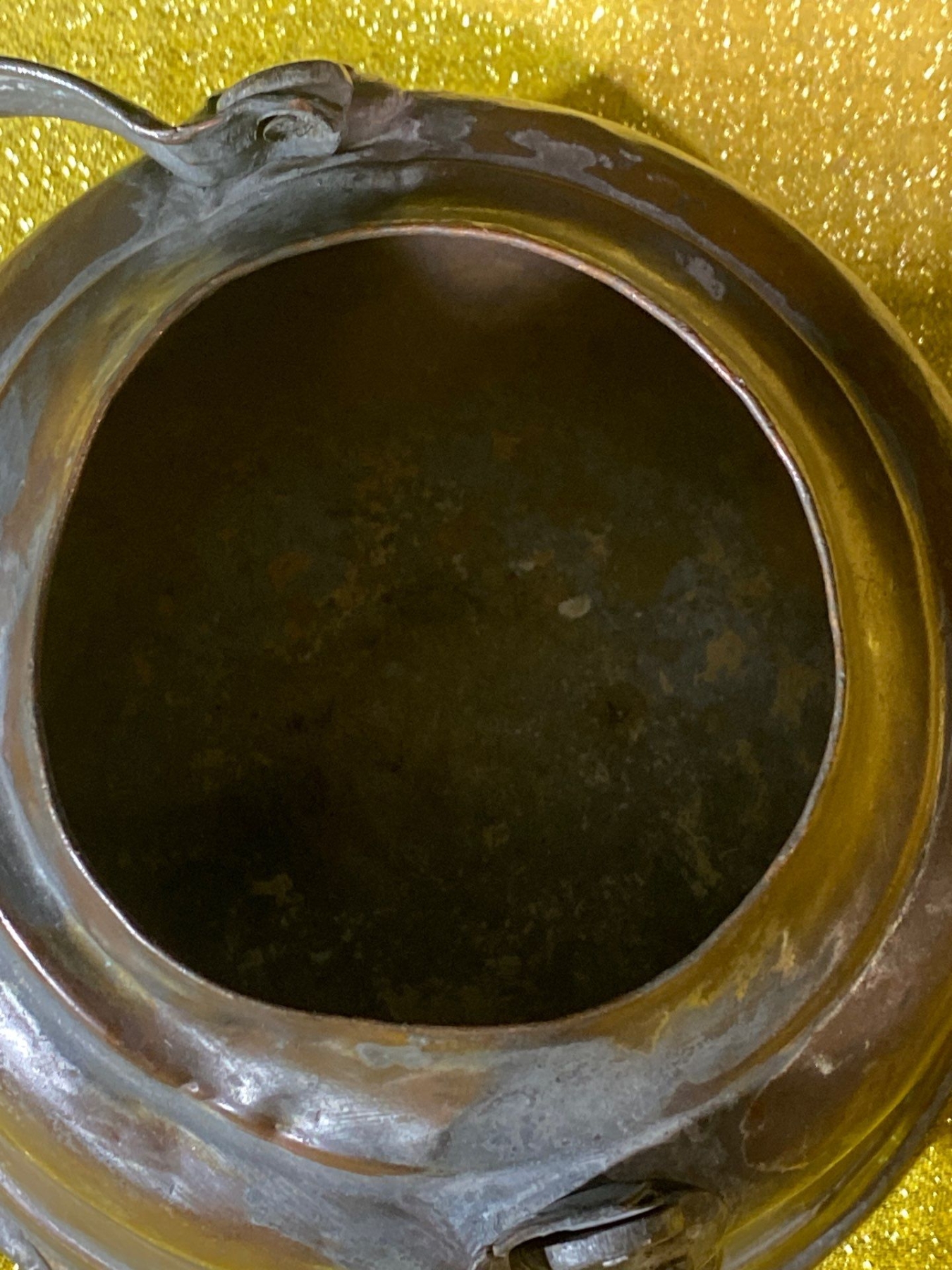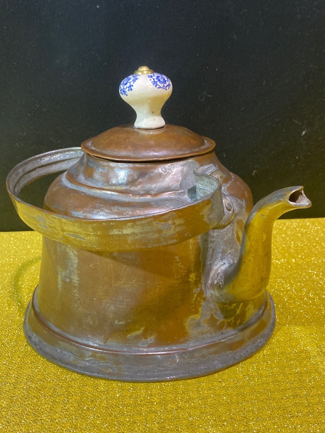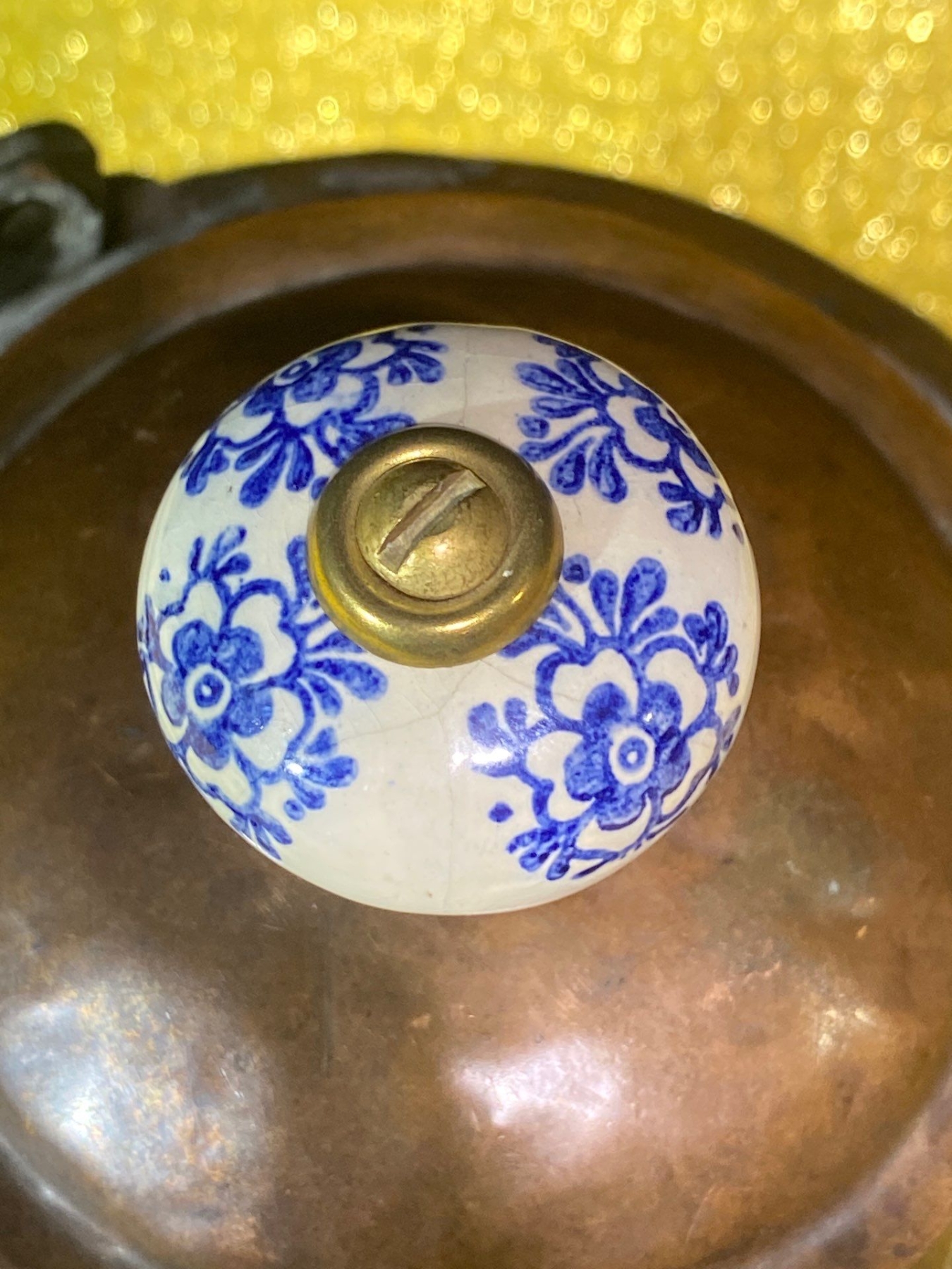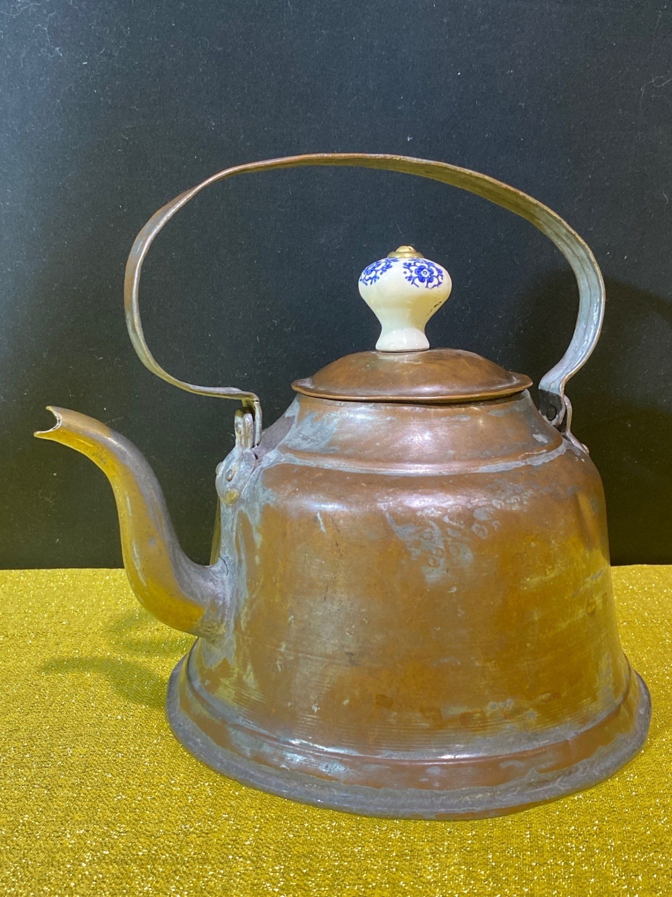 A charming antique copper kettle featuring a beautifully crafted blue and white porcelain handle. The warm copper body and delicate porcelain detail combine functionality with classic decorative appeal, making it a standout piece for collectors of vintage kitchenware or decorative antiques.