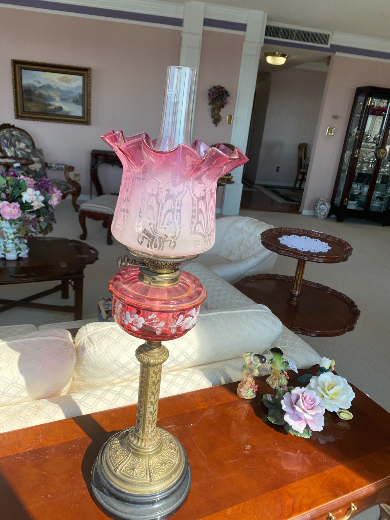 Antique Cranberry Glass Kersosine Lamp with Brass Base - Size: 29"H
