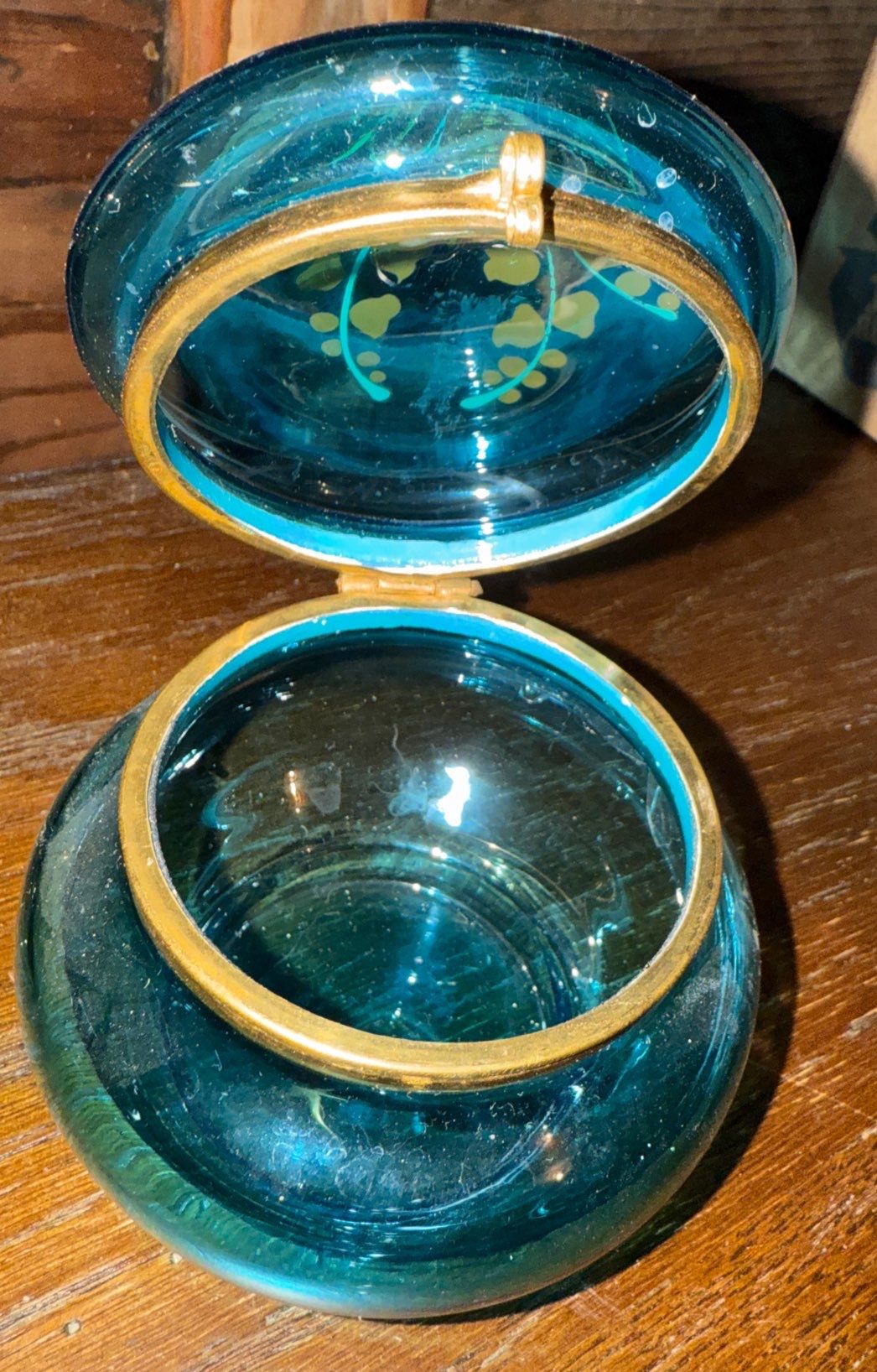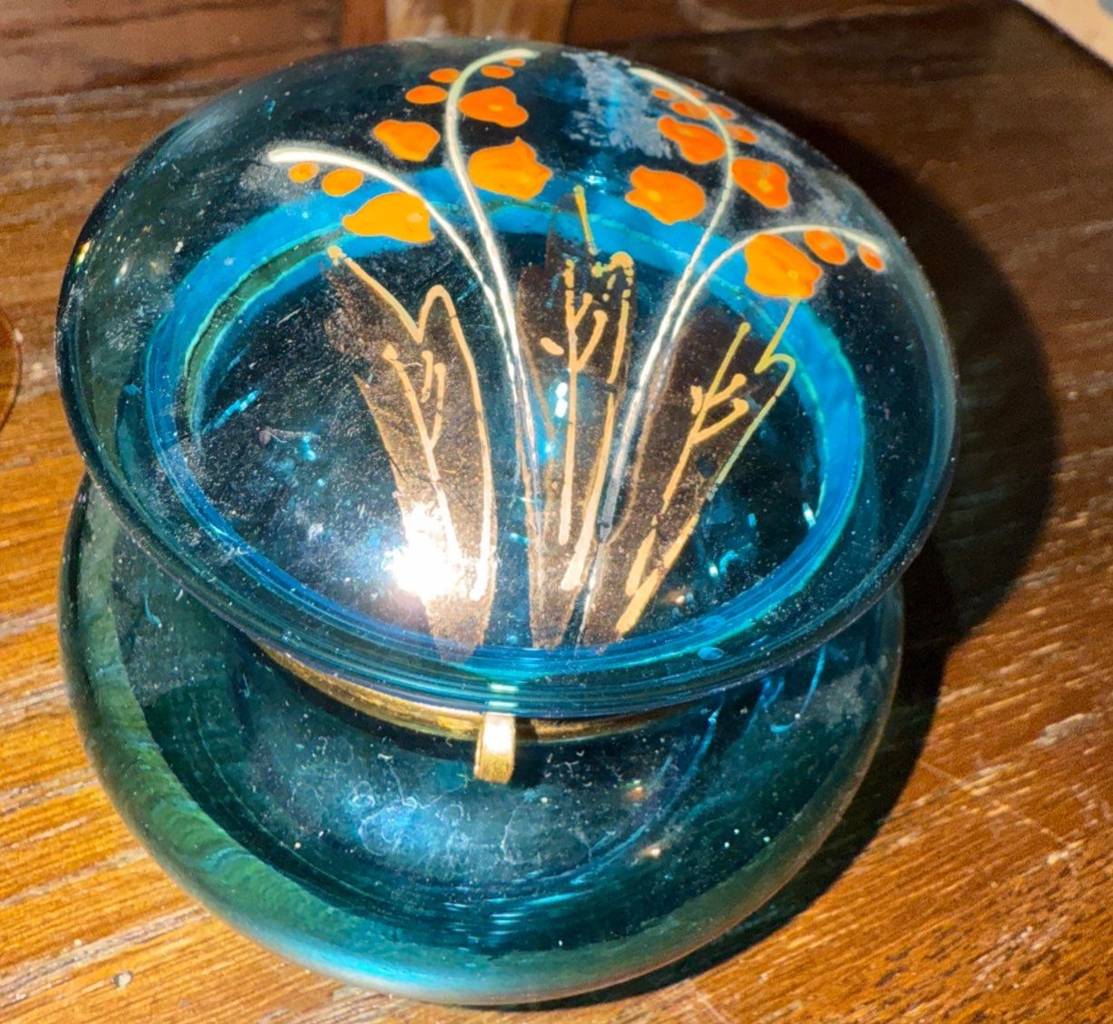 Antique Hand Enameled Blue Bohemian Hinged-Lid & Brass Clasp Trinket Box