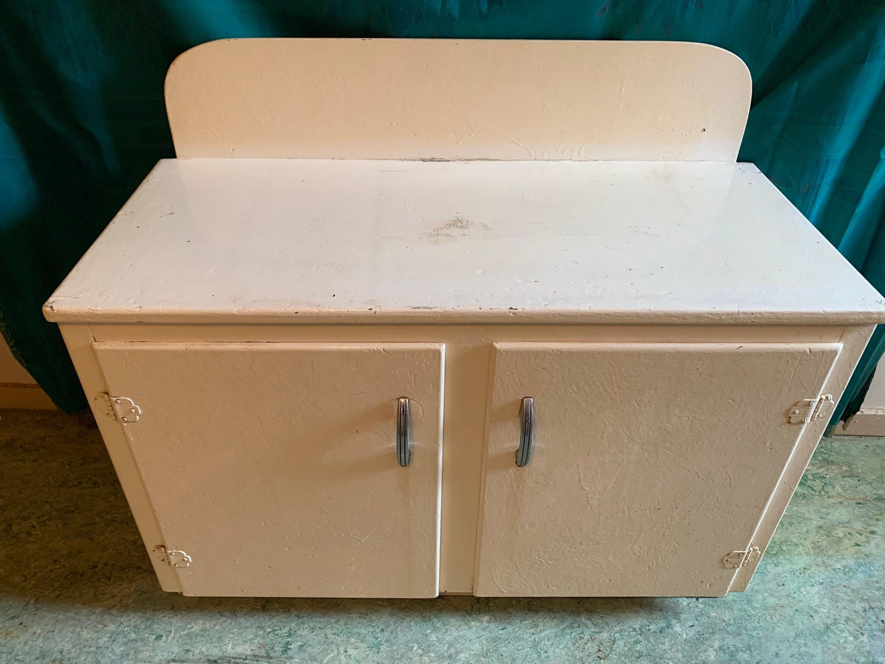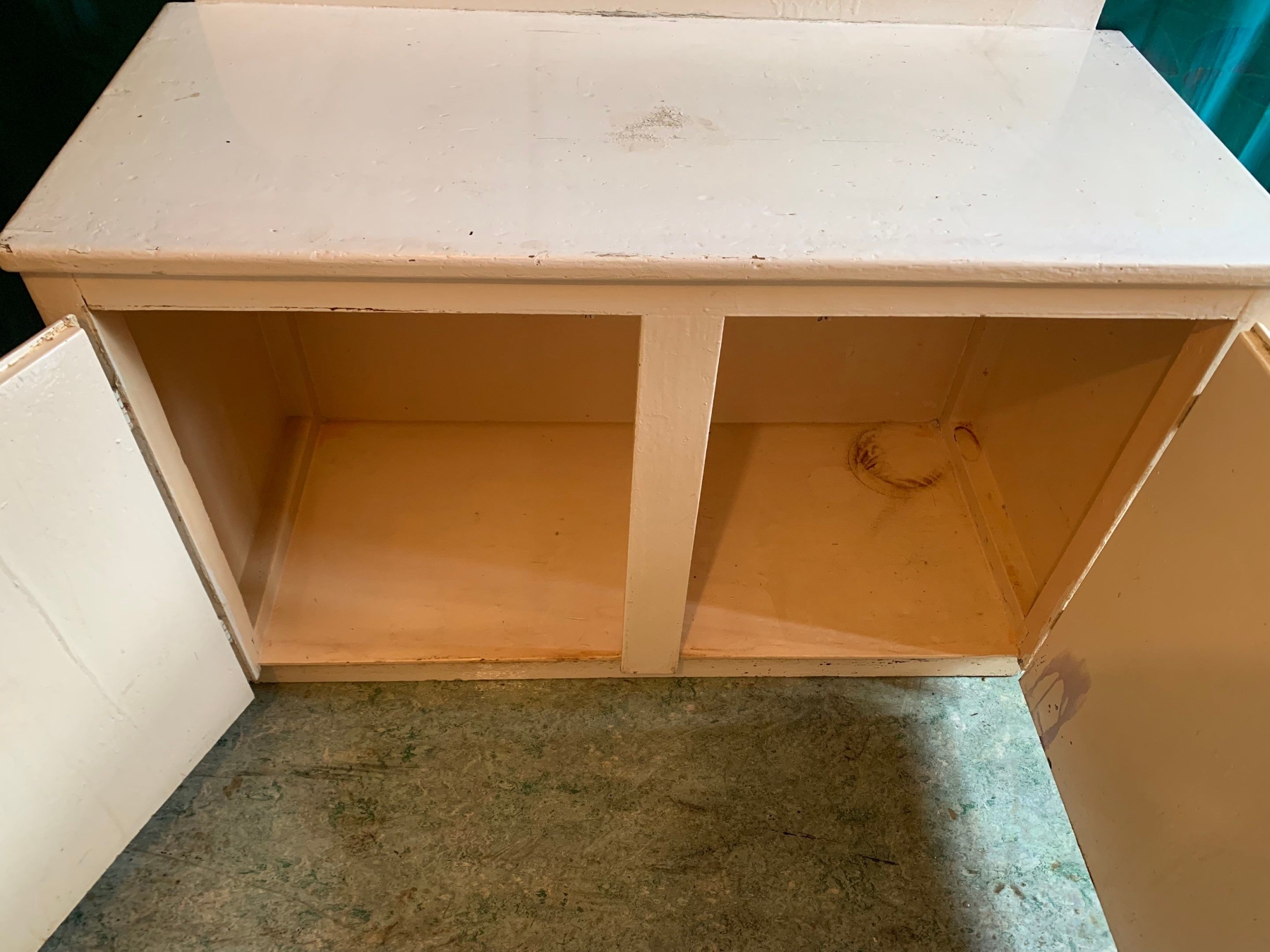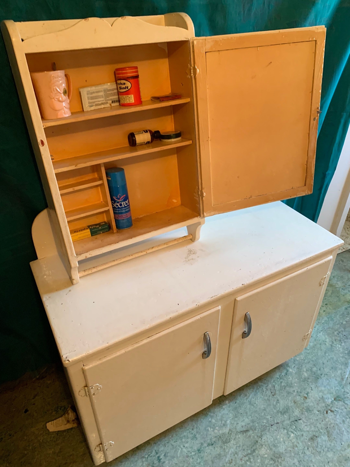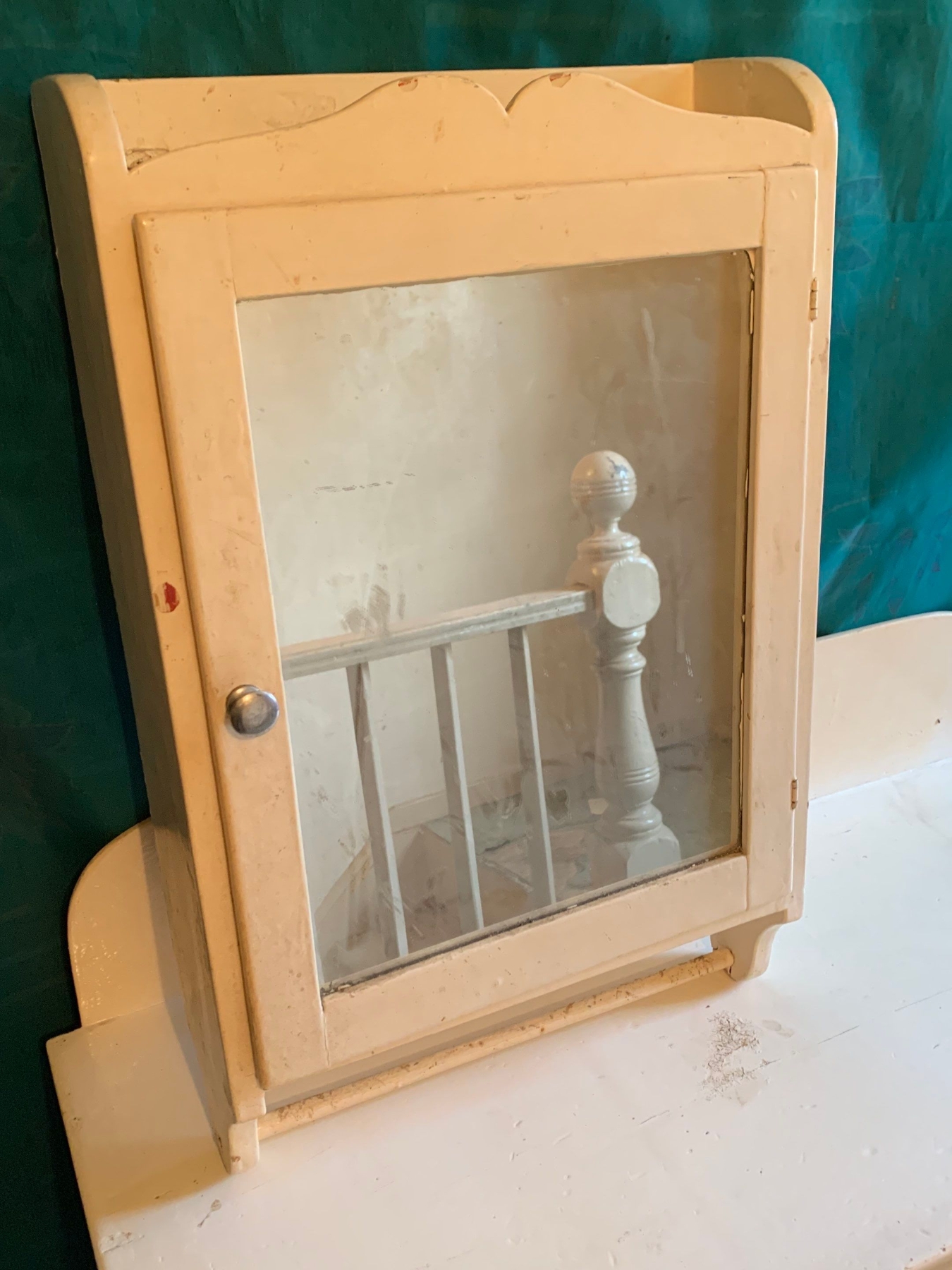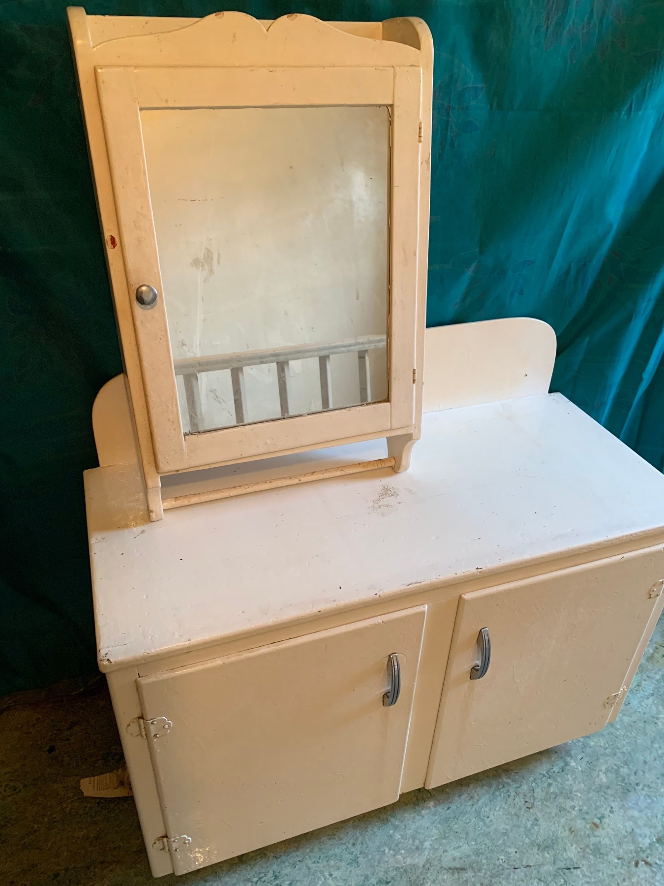 Antique Handmade Cabinet 36”L 16”W 24”T, comes with antique wall mounted medicine cabinet with vintage products