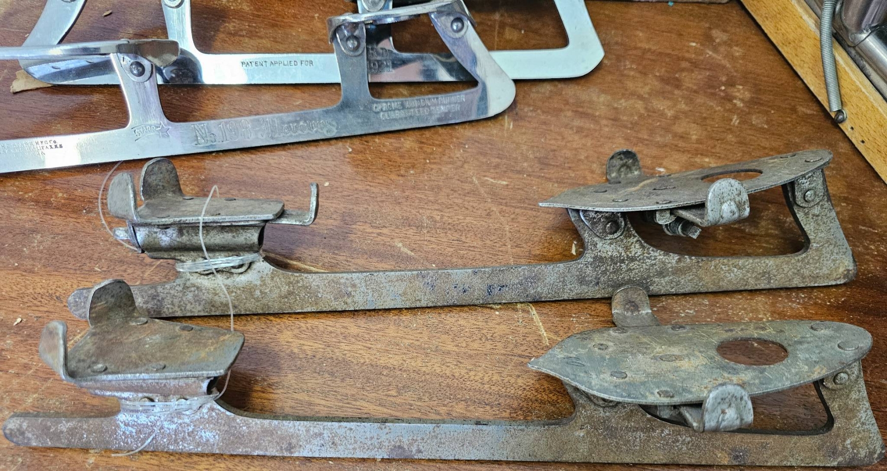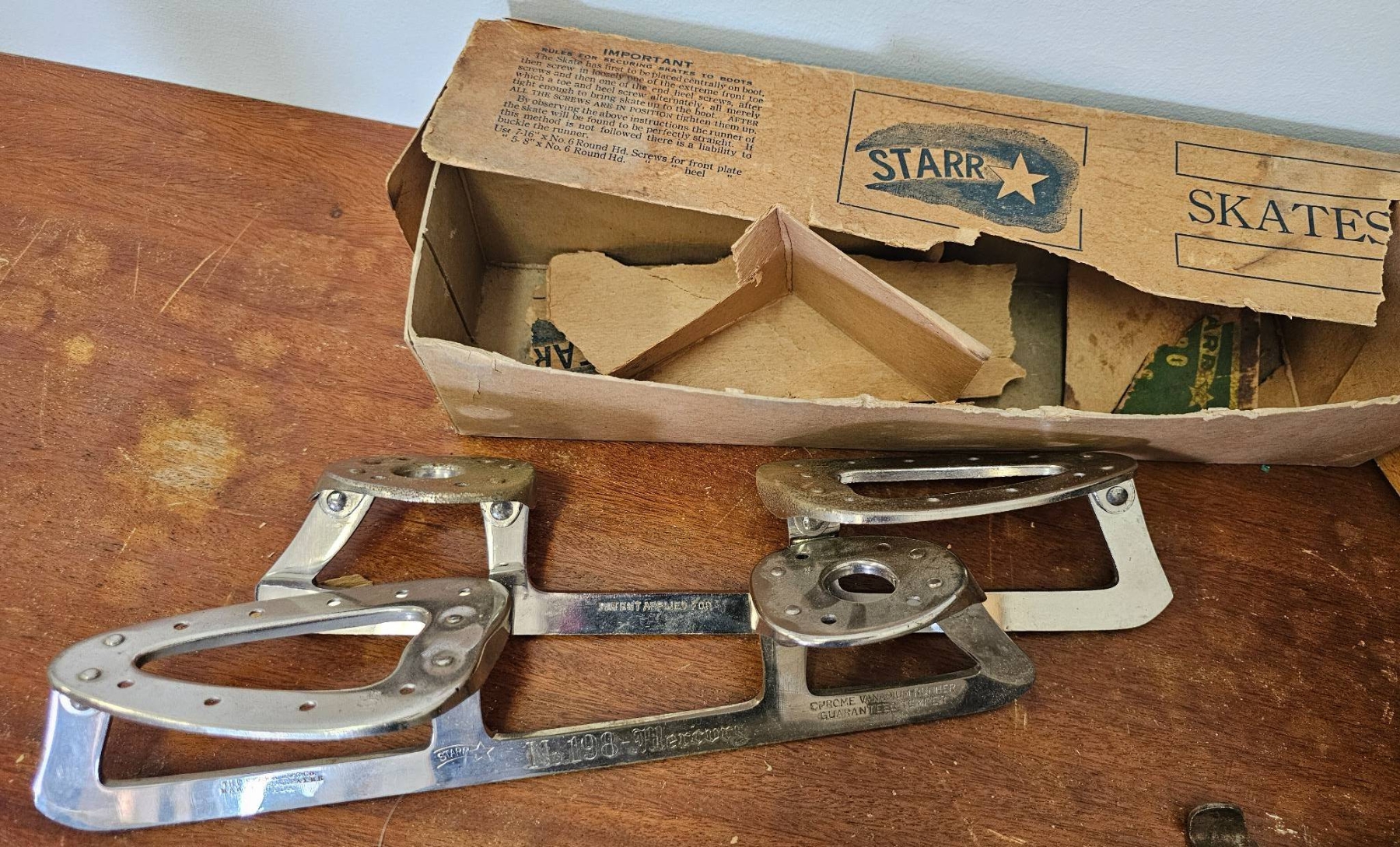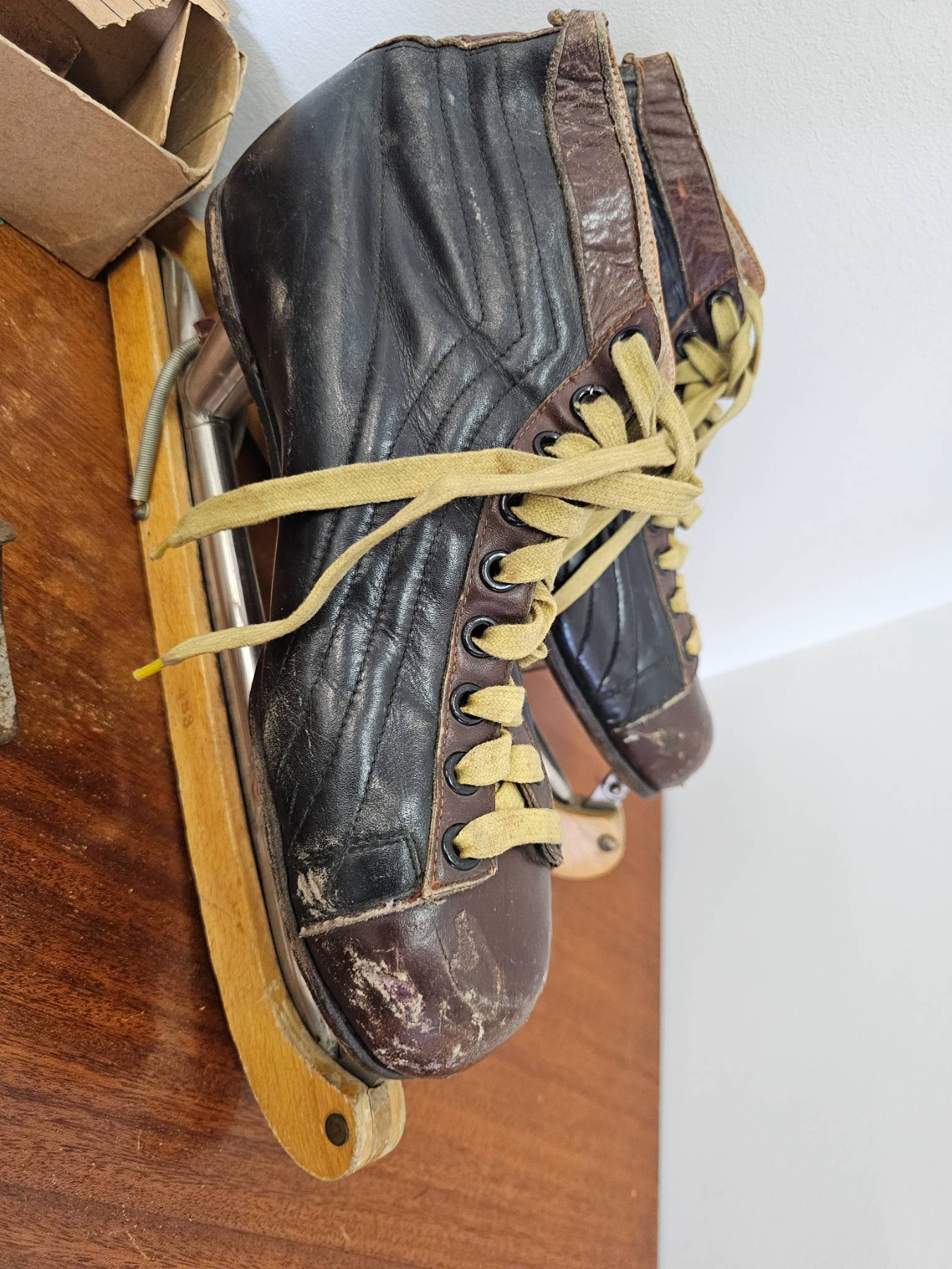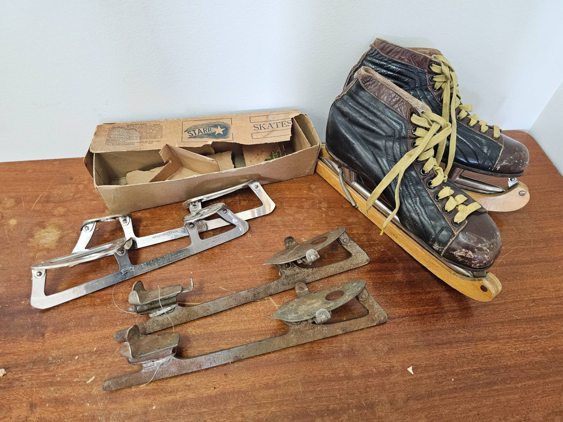 Vintage ice skating items. Includes a pair of leather ice skates with worn yellow laces and wooden soles, a pair of Stark ice skate attachments in the original cardboard box, and two sets of rusted vintage metal skate attachments. Items show wear, rust, and aging consistent with prior use and age.